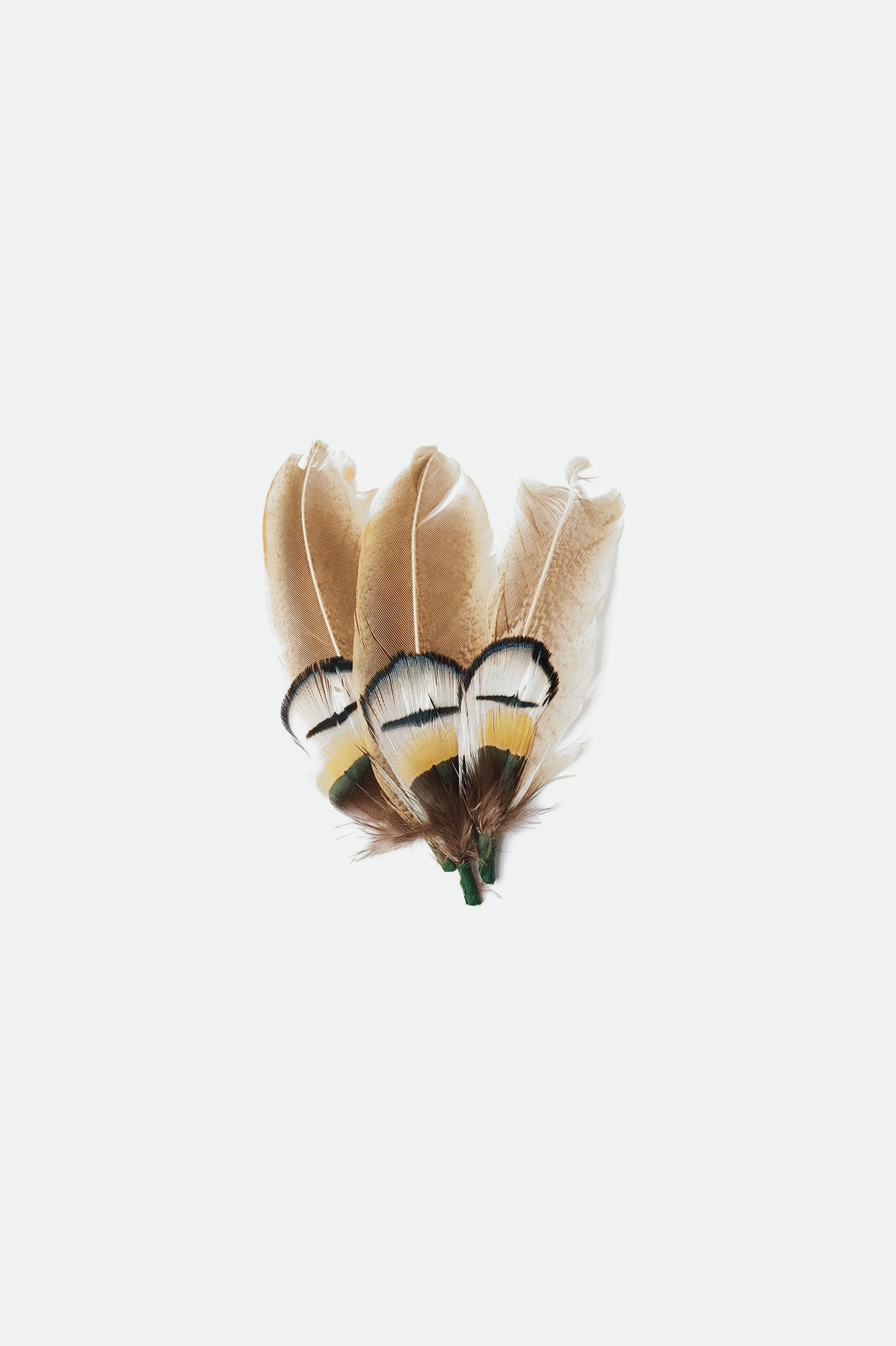 The Josh Feather features a nice, muted tan, complemented by blue, green, and yellow tones for year round style. Place under the outside band of any brimmed hat for a customized look, and mix and match as desired.