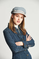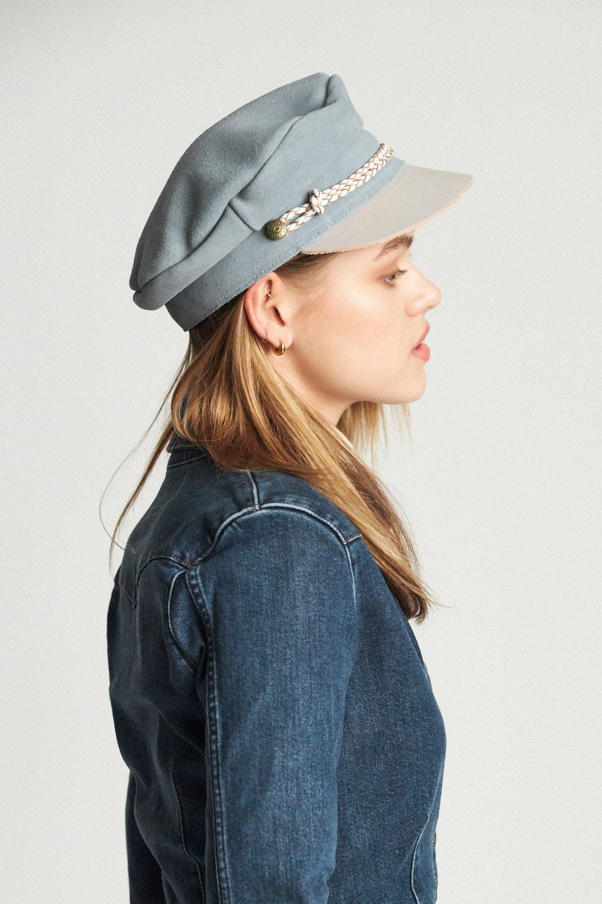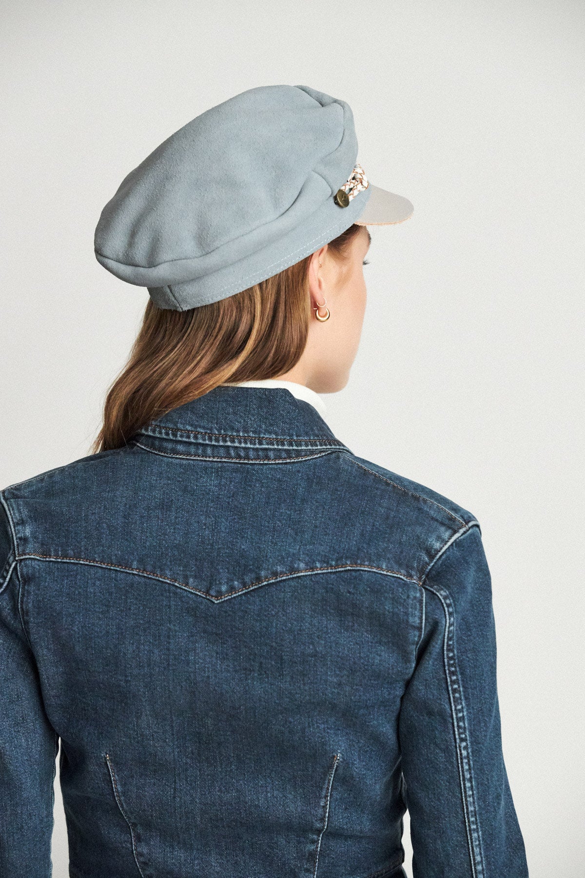 A vintage-inspired 100% suede-and-leather cut-and-sew cap with a leather band and custom Brixton pin.