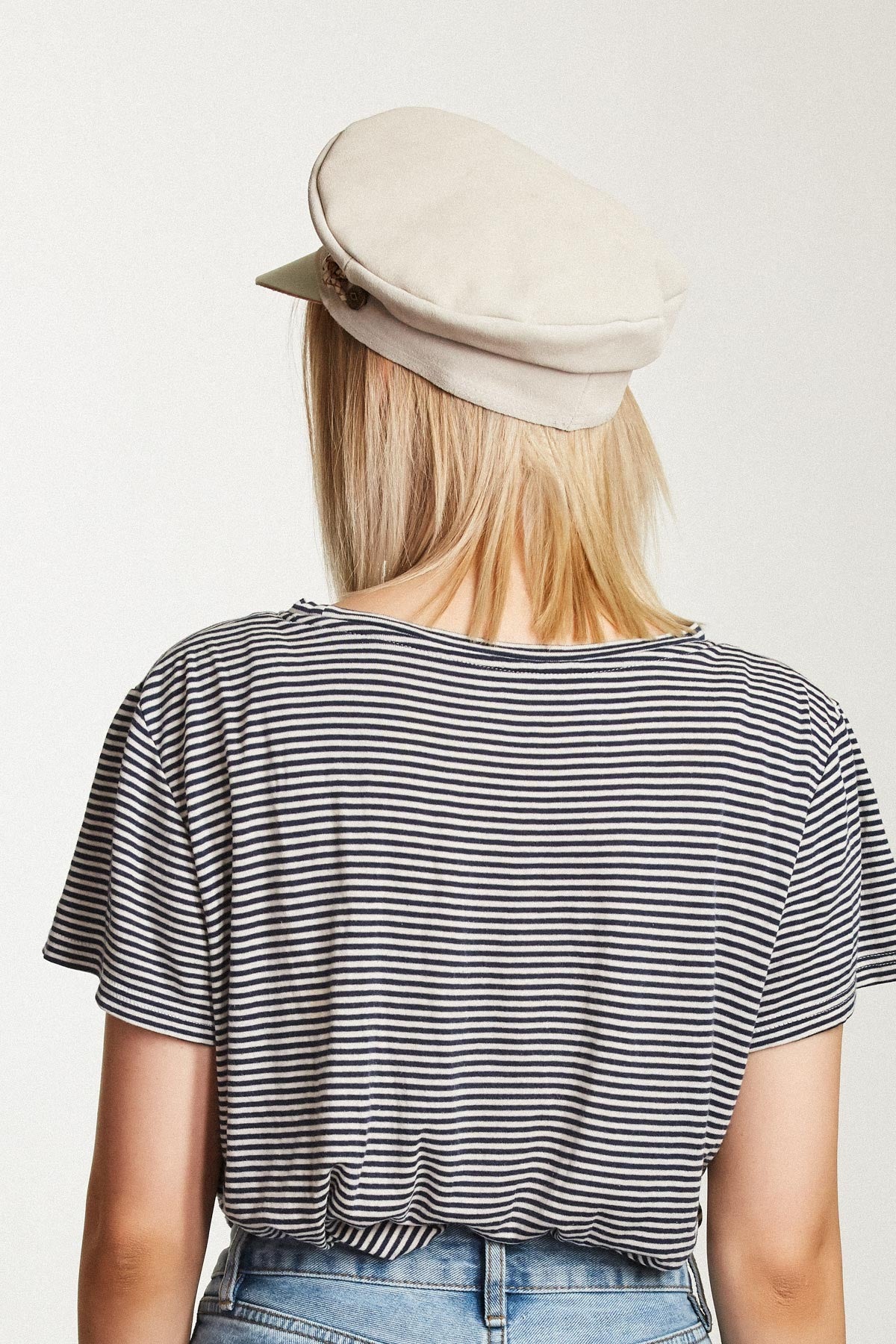 A vintage-inspired 100% suede-and-leather cut-and-sew cap with a leather band and custom Brixton pin.