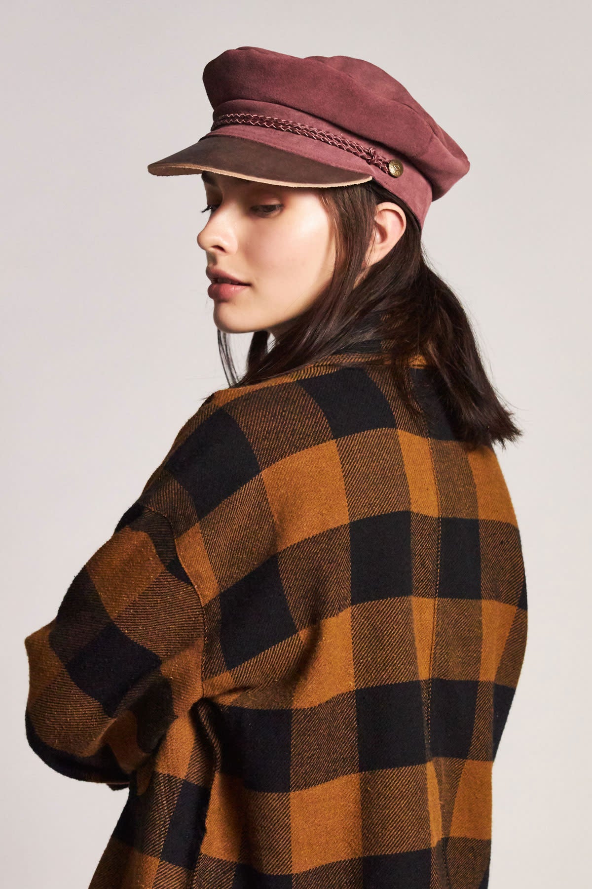 A vintage-inspired 100% suede-and-leather cut-and-sew cap with a leather band and custom Brixton pin.