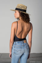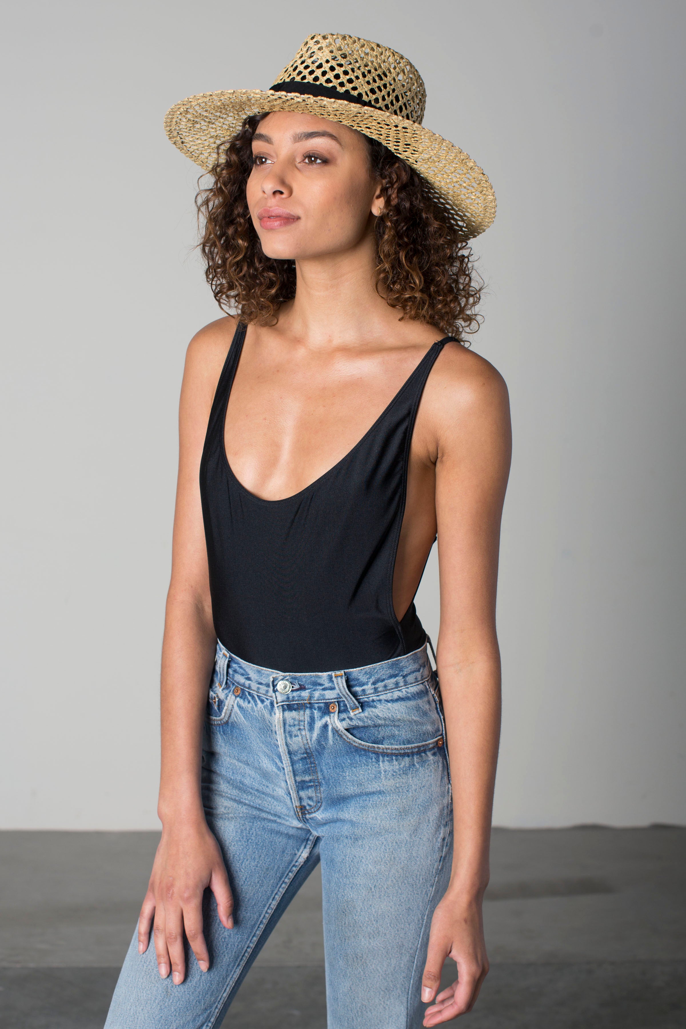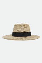 A wide-brim open-weave straw fedora with a grosgrain band.