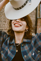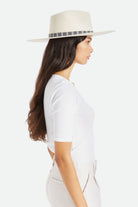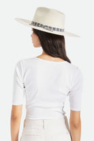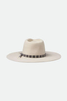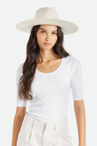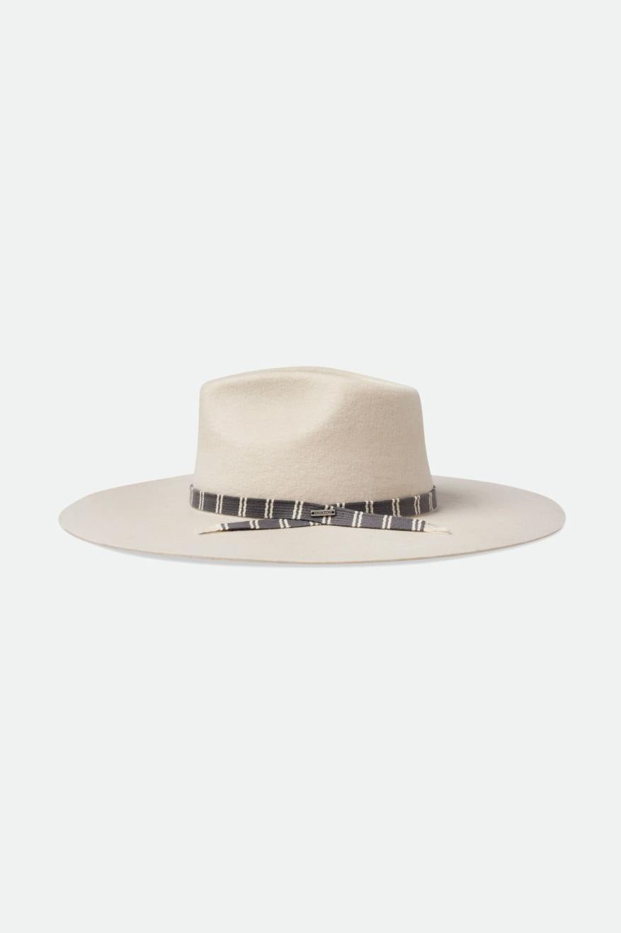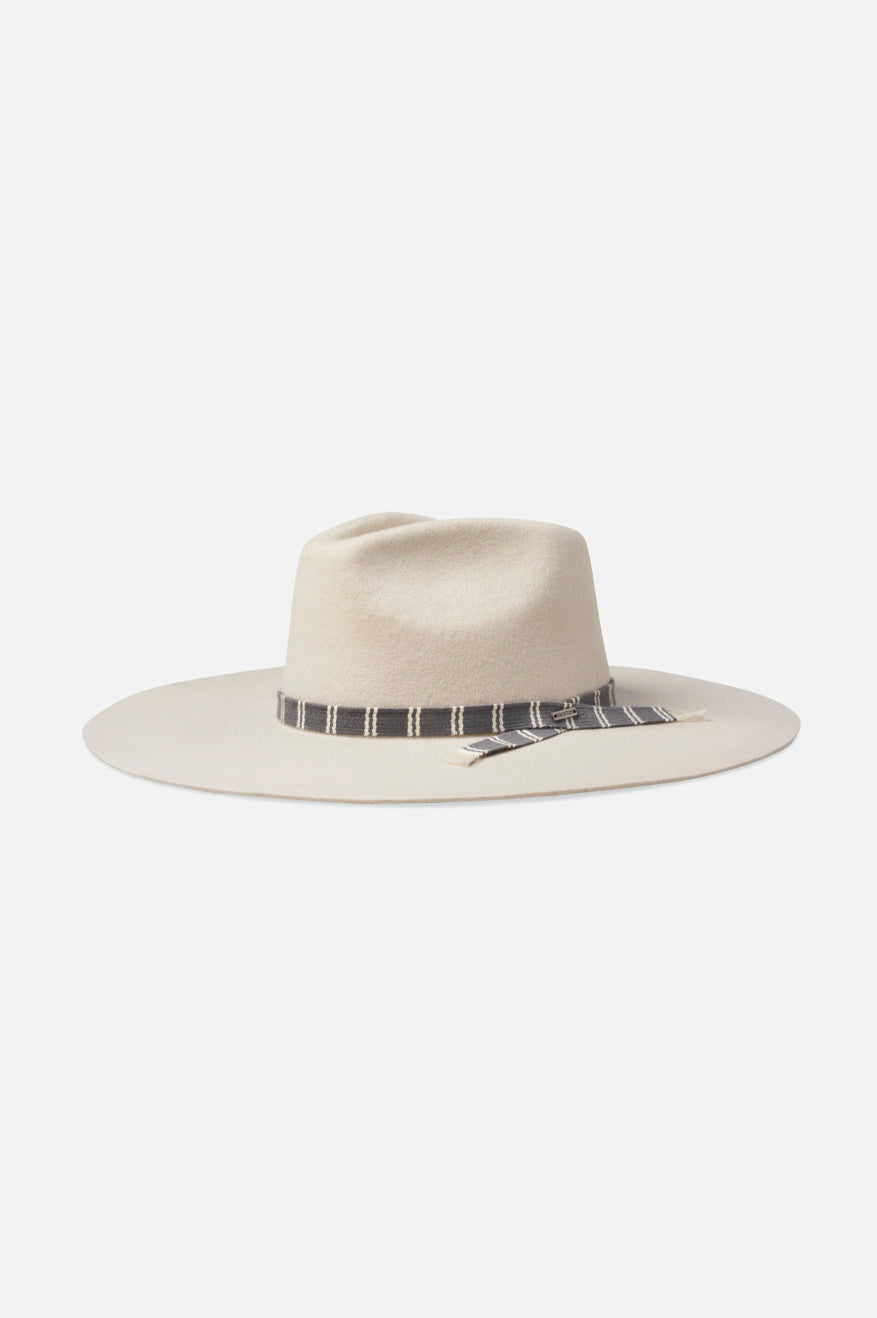 The Leigh Felt Fedora is a sophisticated take on a flat-brim classic. Crafted from Australian wool. It has an elegant pinch balanced with a strong crease and stiff brim. Finished with a delicate woven cotton band and metal headwear plaque.