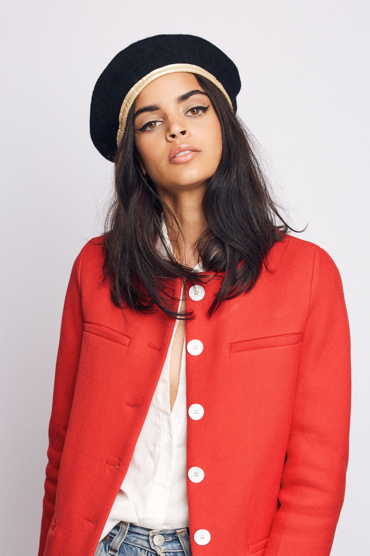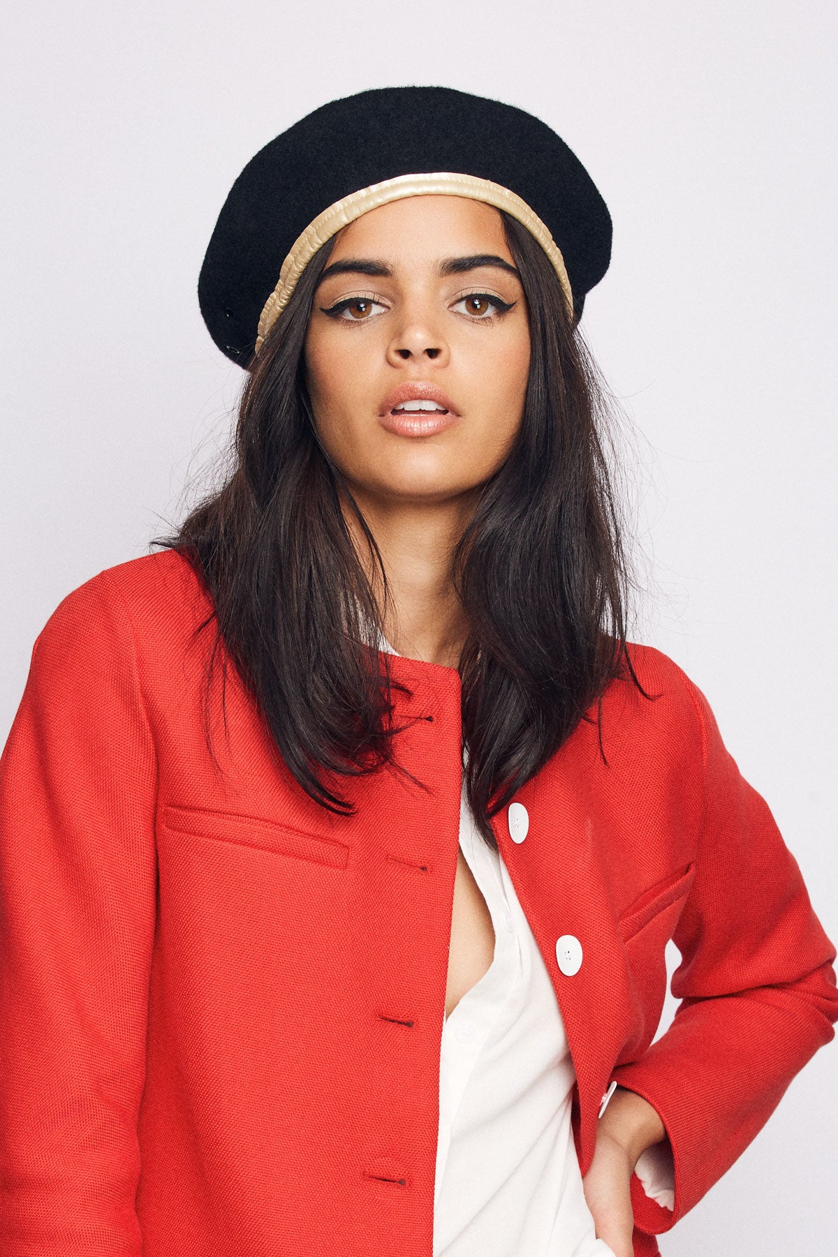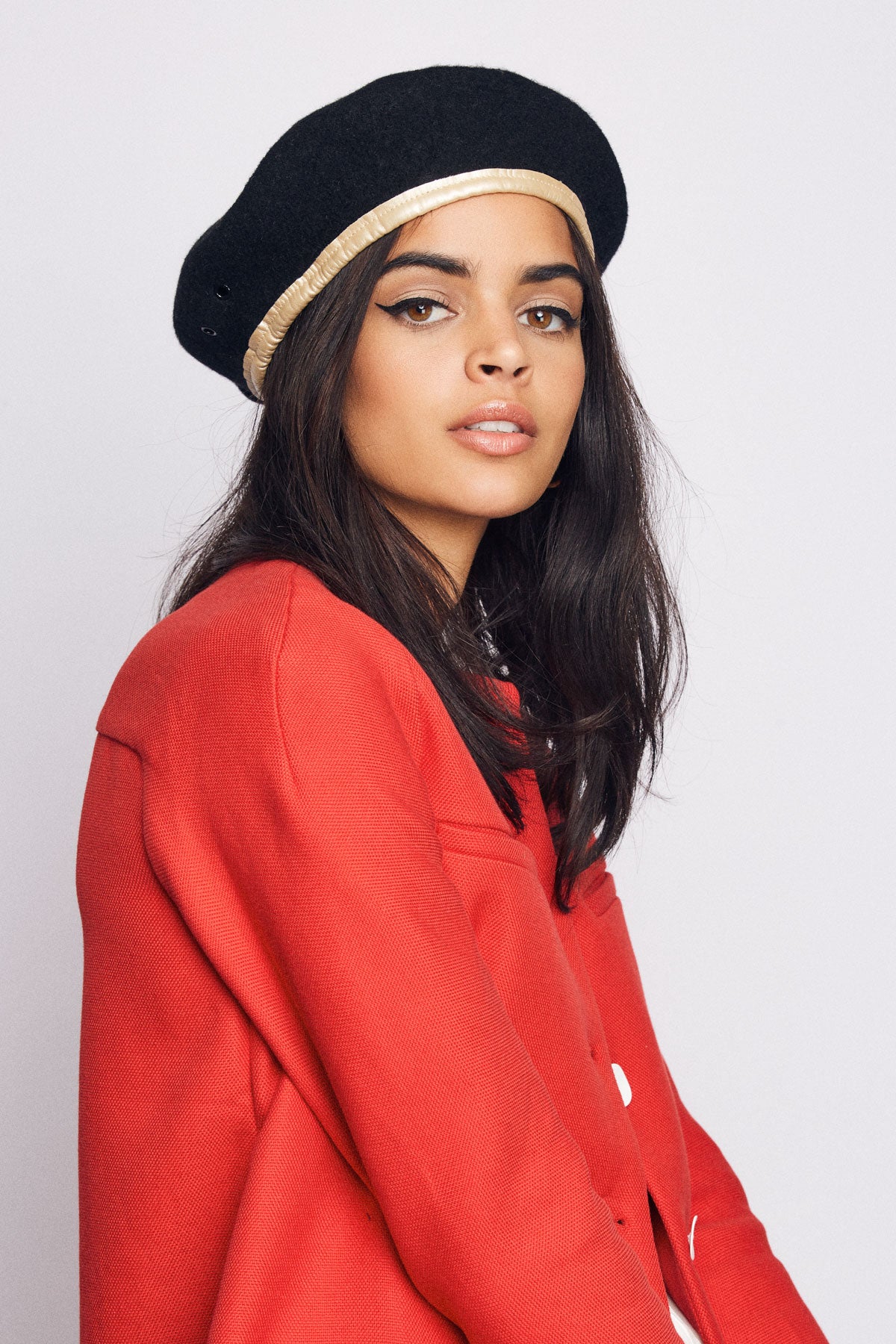 A custom felt beret with faux-leather band taping.