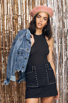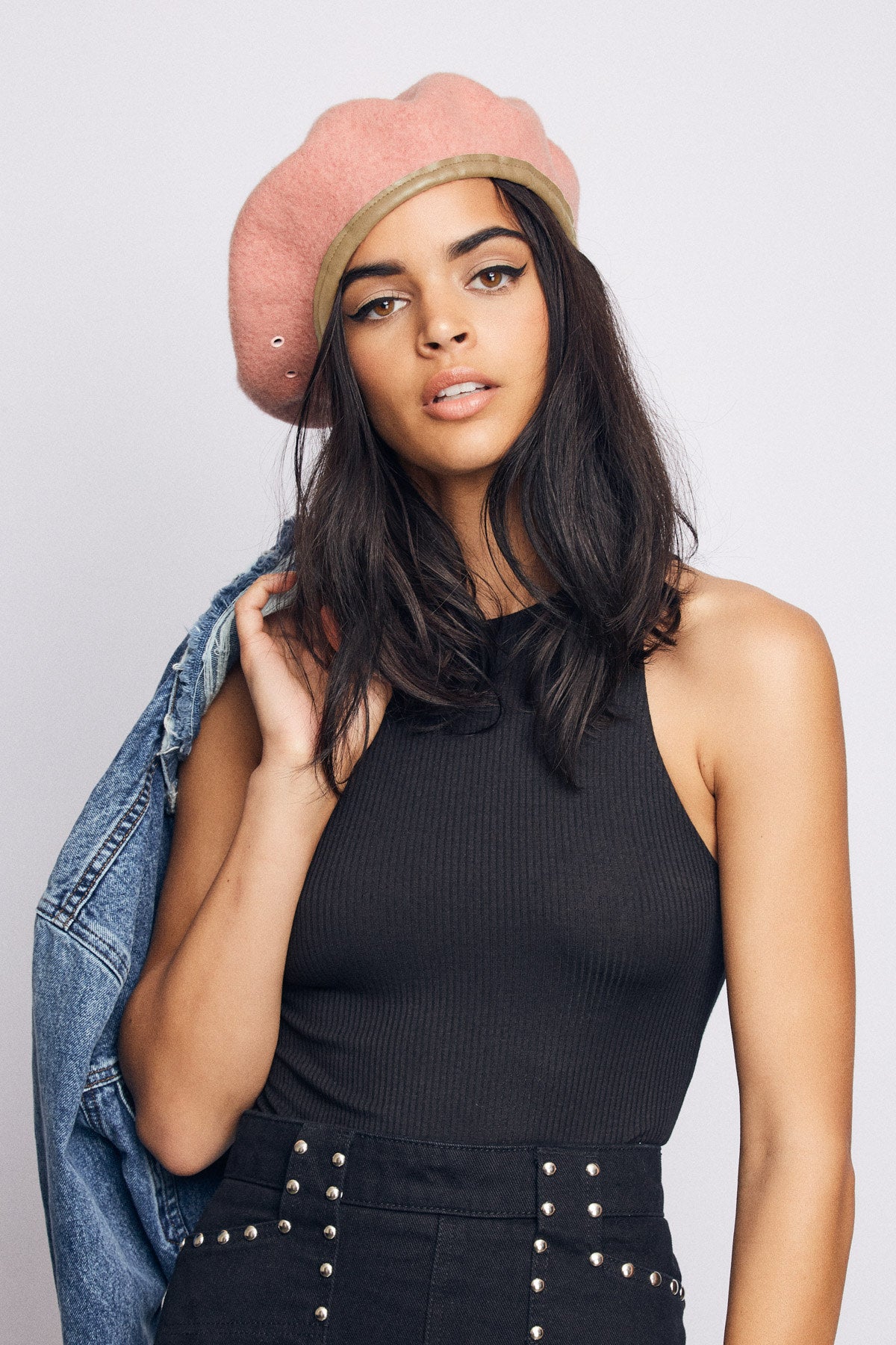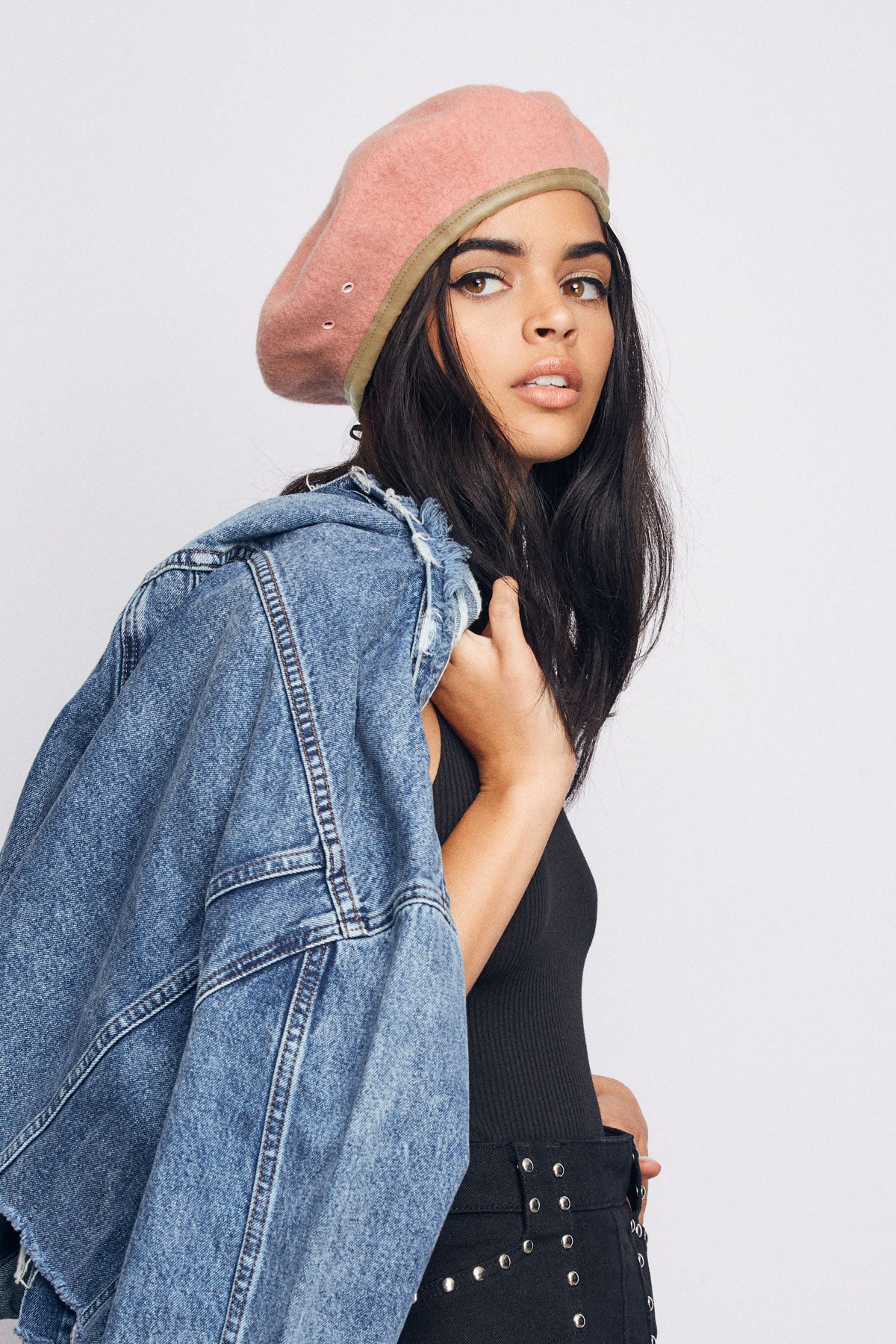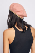 A custom felt beret with faux-leather band taping.