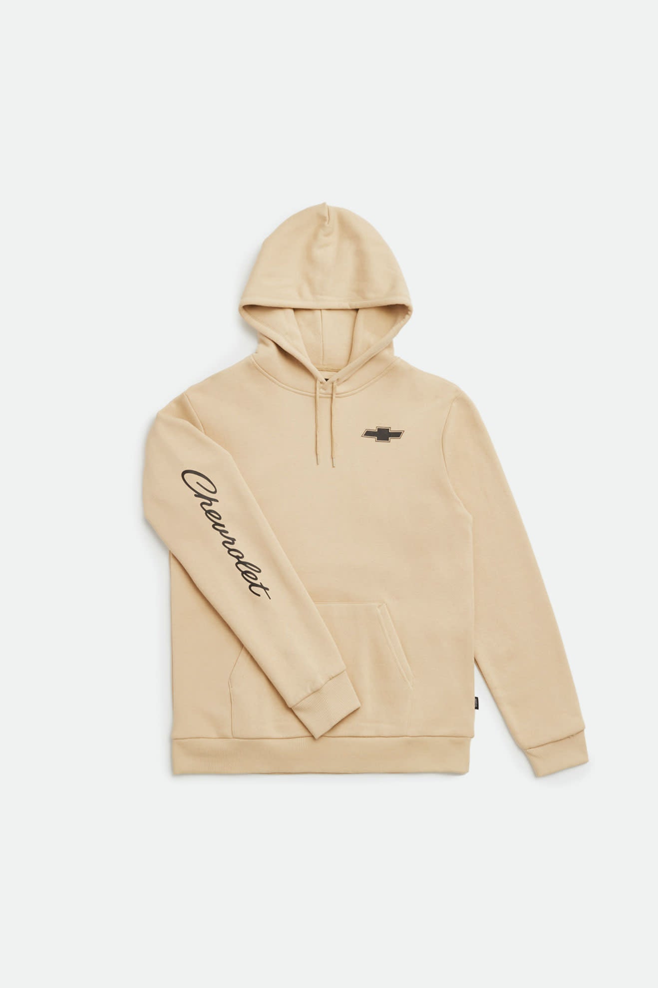 The Brixton Longhand Hood is a 330-gram hooded pullover sweatshirt that features set-in sleeves, drawcord adjustable hood, and a Chevrolet print at left chest and wearer's right sleeve.