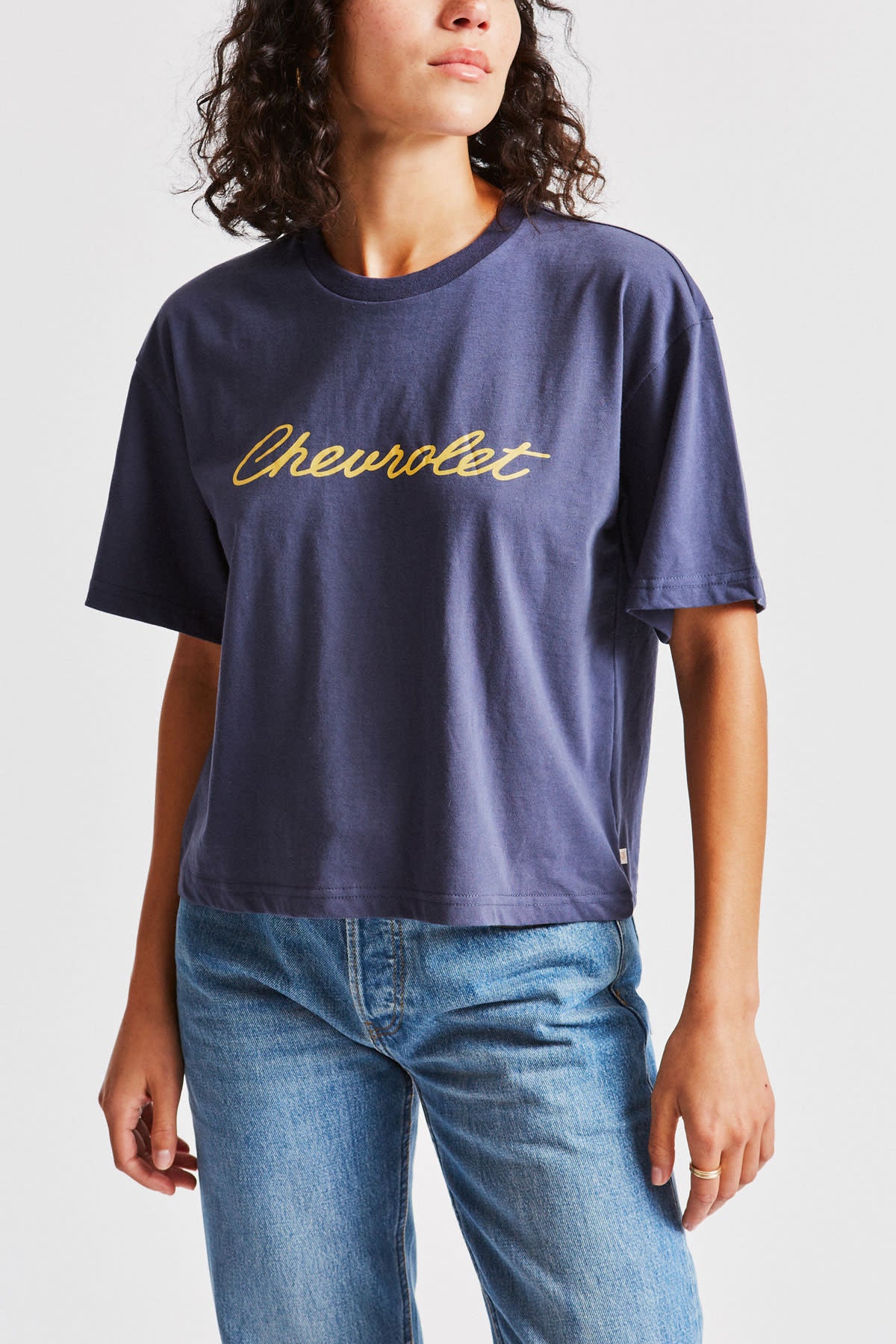 The Brixton Longhand S/S Boxy Tee is a boxy fit tee made in cotton/poly jersey with 1X1 rib at neckline. It features a Chevrolet logo screenprint, silicone softener wash, exaggerated short-sleeve, drop shoulder, and a woven Brixton flag label.