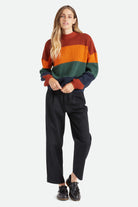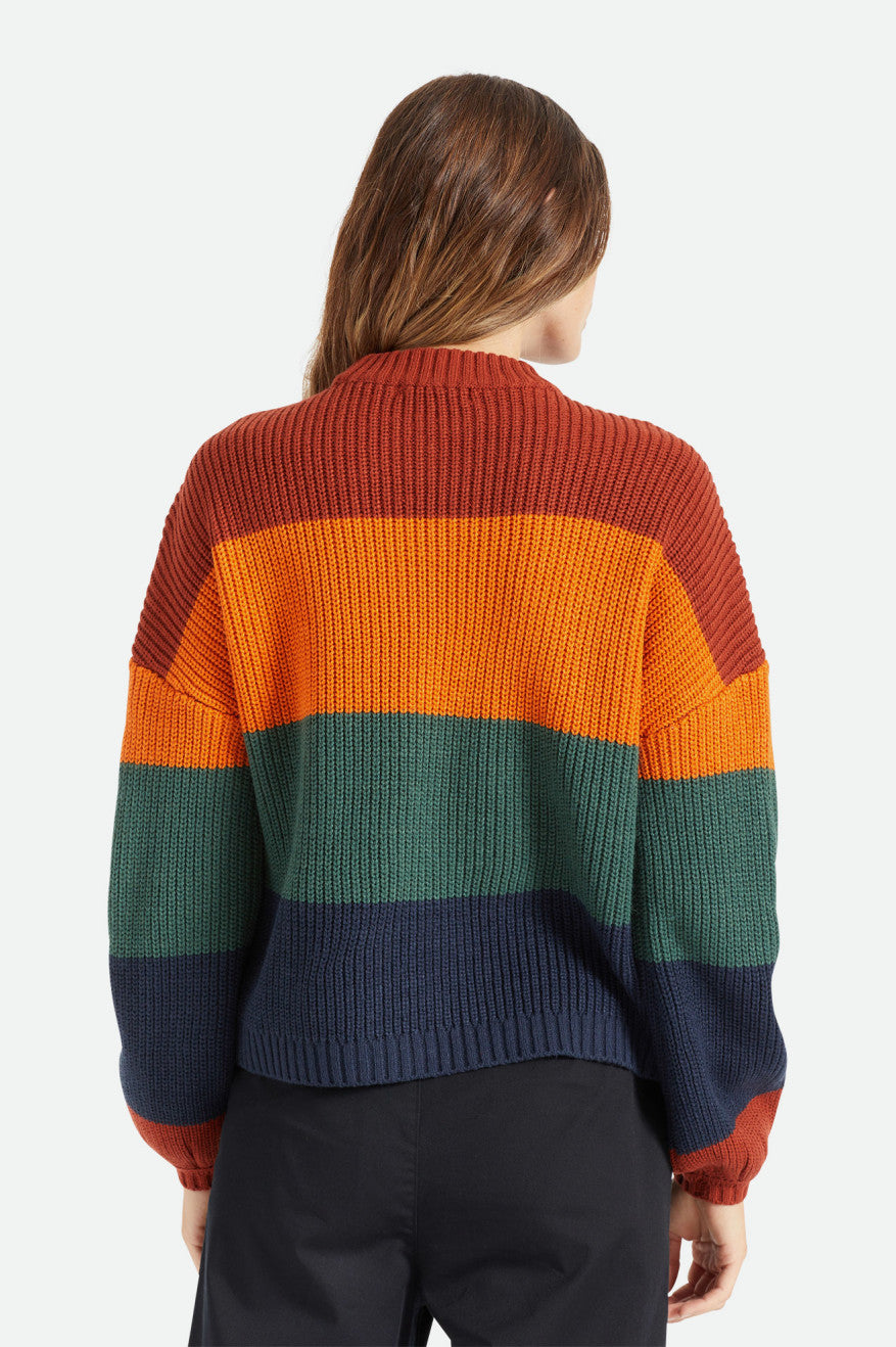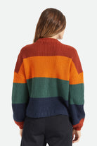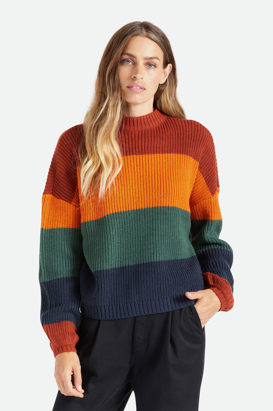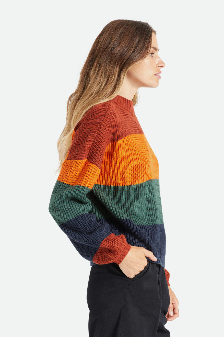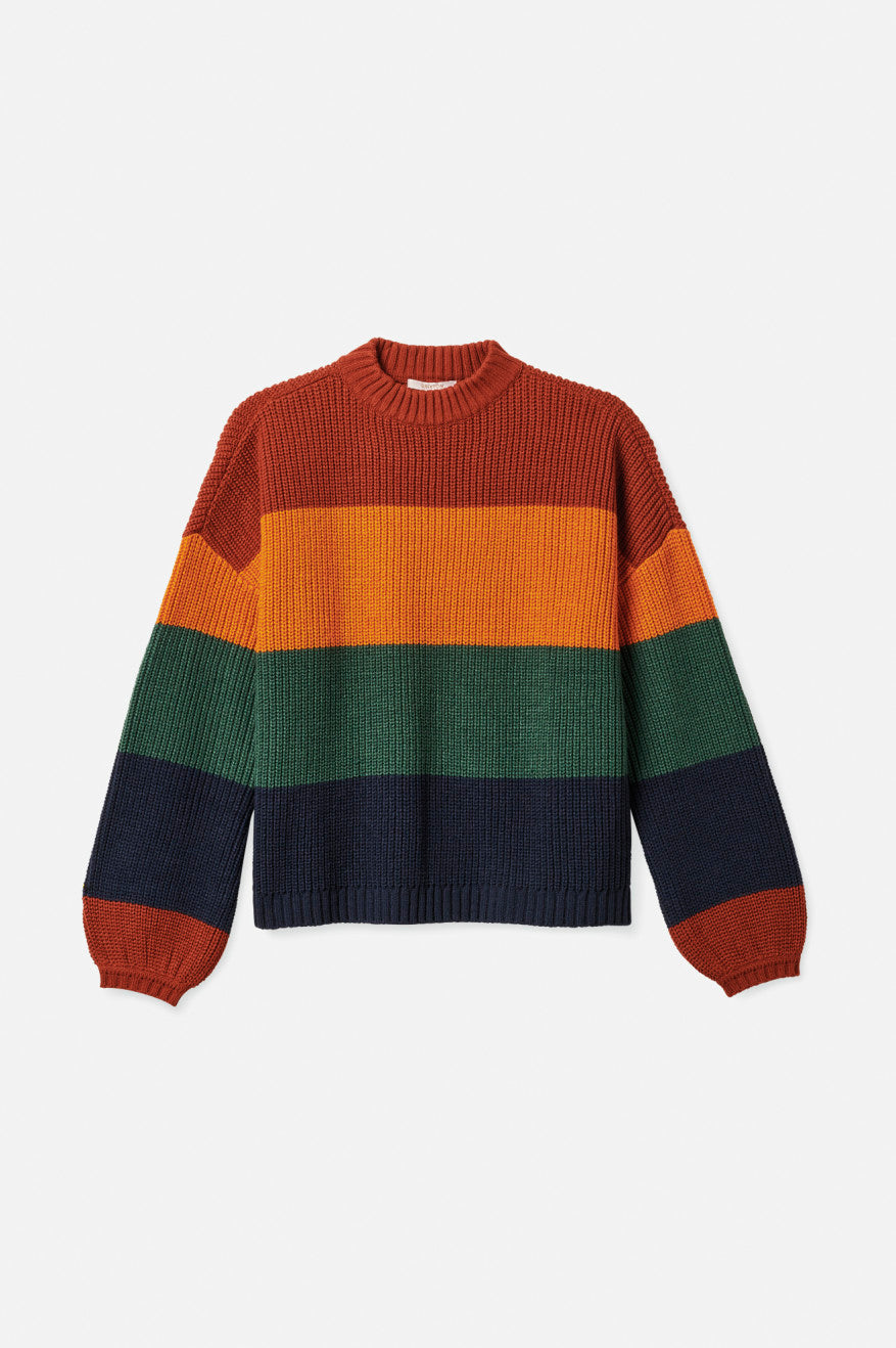 The Madero Sweater is a colorblock pullover in a chunky knit. It has a relaxed fit elevated with a slight mock neck and understated balloon sleeve. Finished with a drop shoulder and ribbed cuffs.