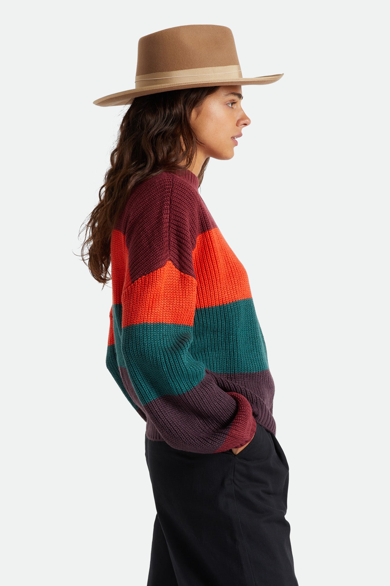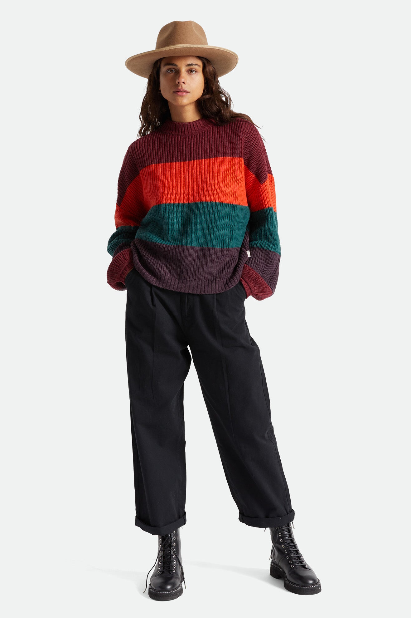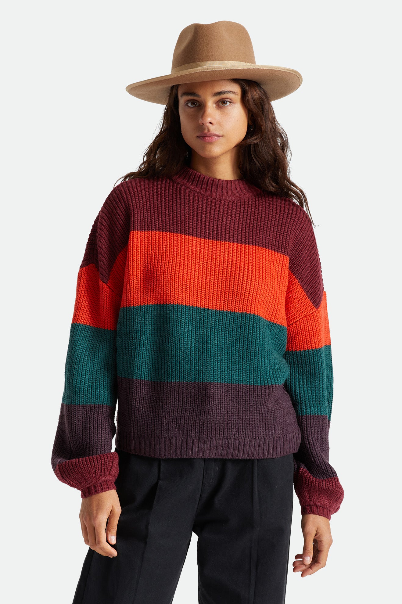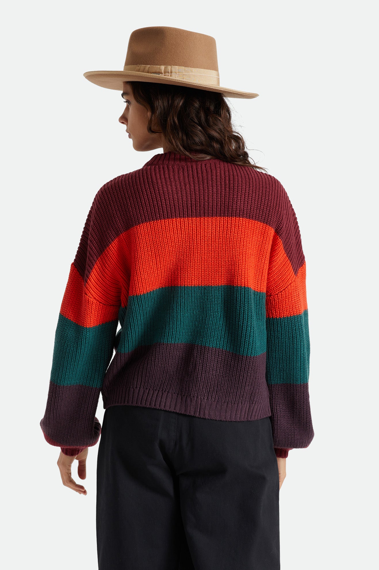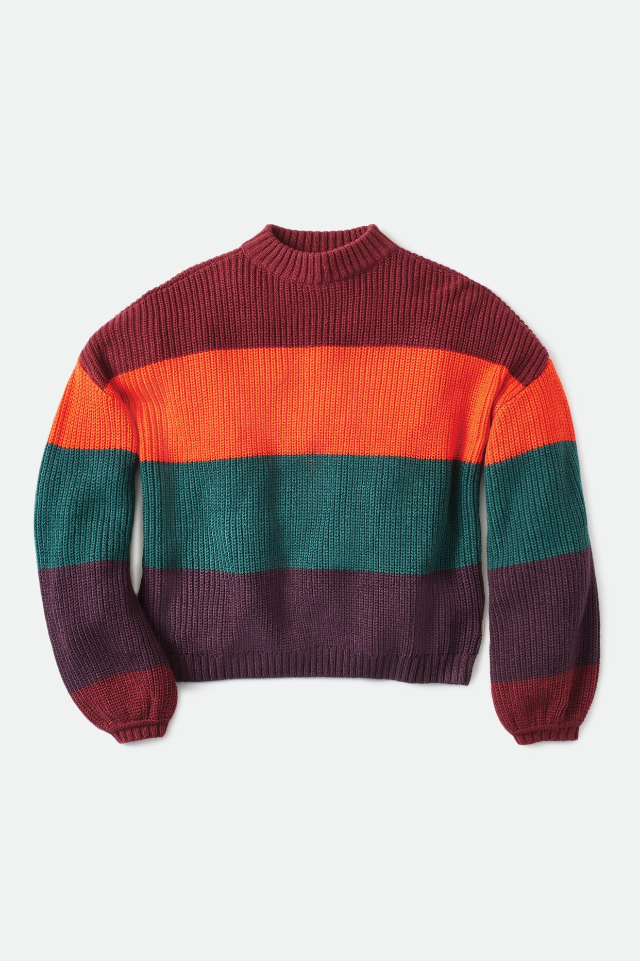 Designed with acrylic yarn-dyed stripe rib, this sweater is classic, while the block stripes add a fun pop of color.