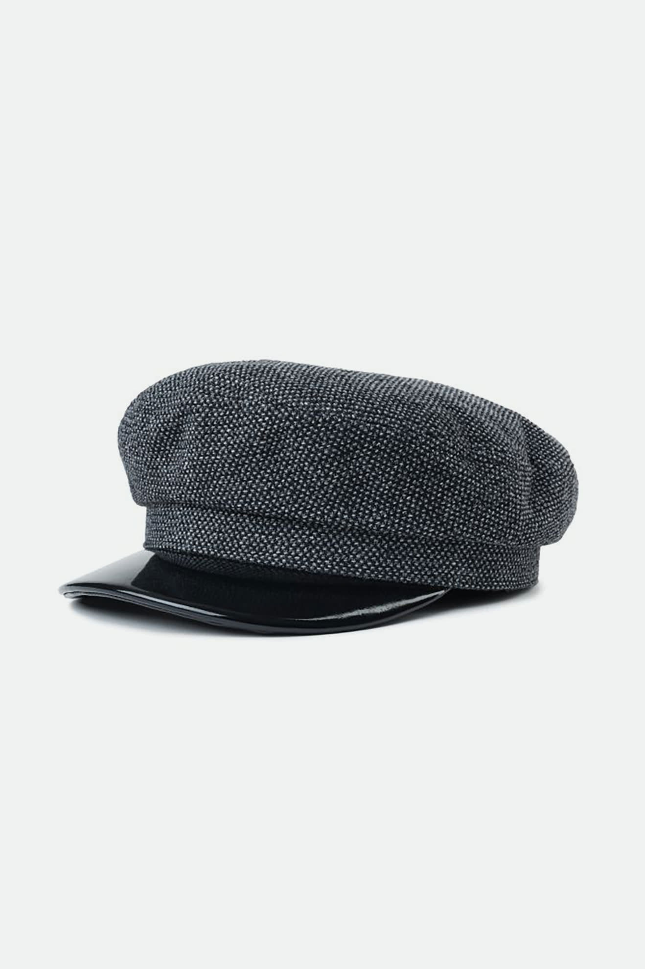 A cut-and-sew fisherman cap featuring a patent leather brim.