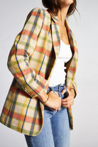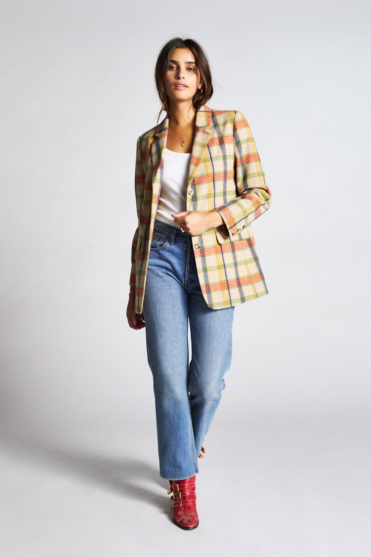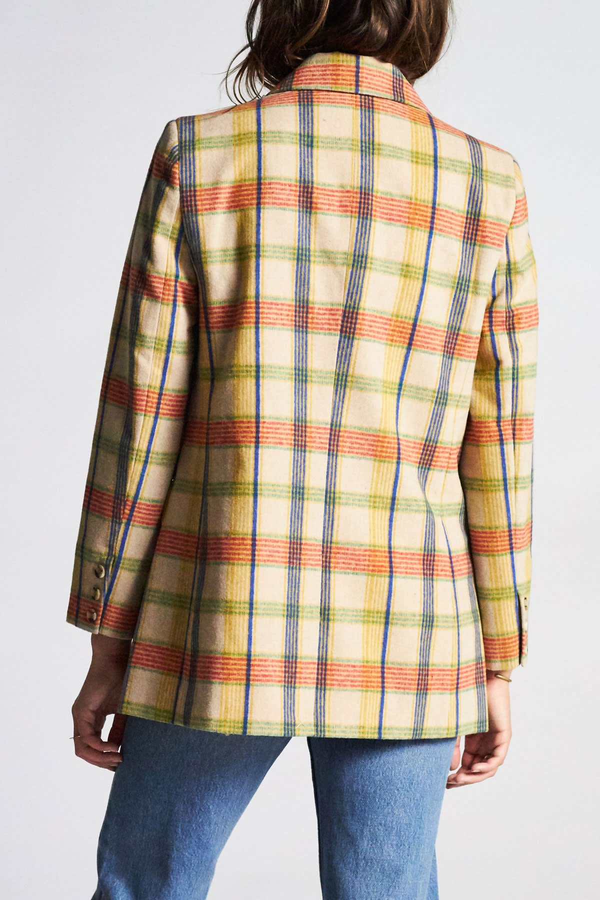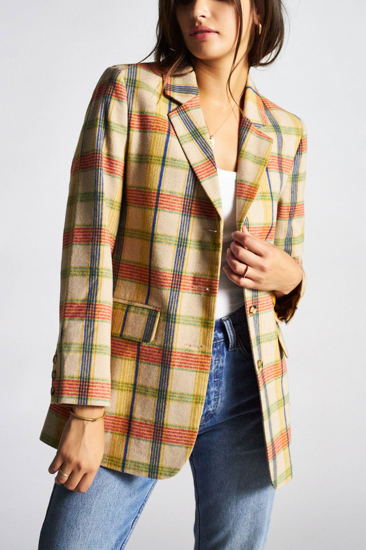 A classic-fit long-length blazer made in polyester/wool blend yarn-dyed plaid. It features horn buttons, double welt hand pockets with pocket flaps, back hem vent, polyester Taffeta lining, and woven Brixton labels.
