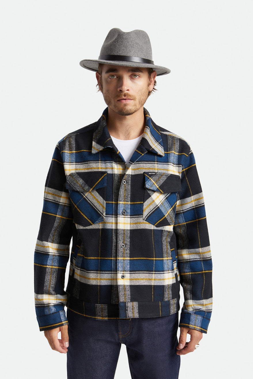 A must-have piece for every day. The Messer Fedora has a faux leather band, an adjustable velcro strap under the sweatband, and is finished off with a metal crest pin. This hat blends the iconic fedora shape with modern style.