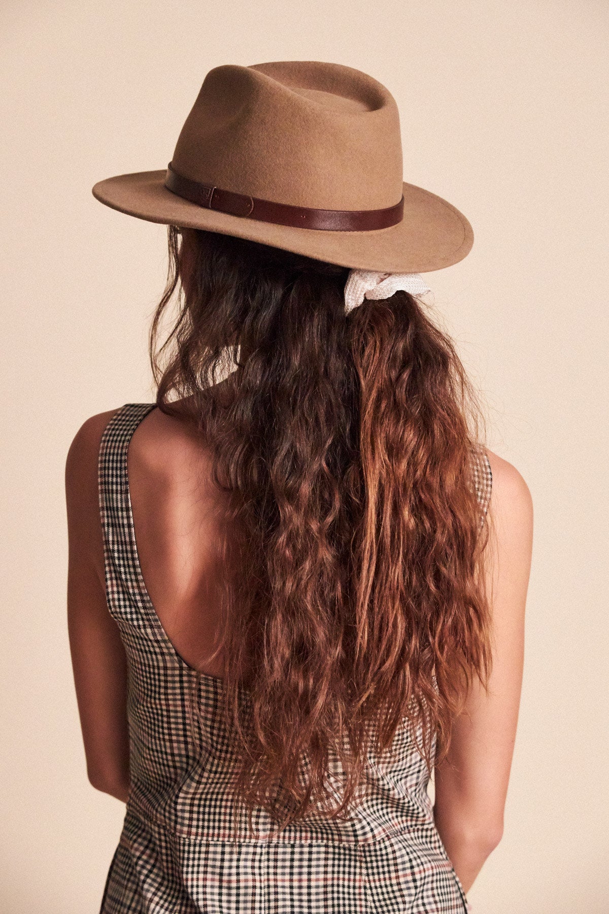 The unisex Messer is a medium flat-brim felt fedora with a faux-leather band. Color: Tobacco.