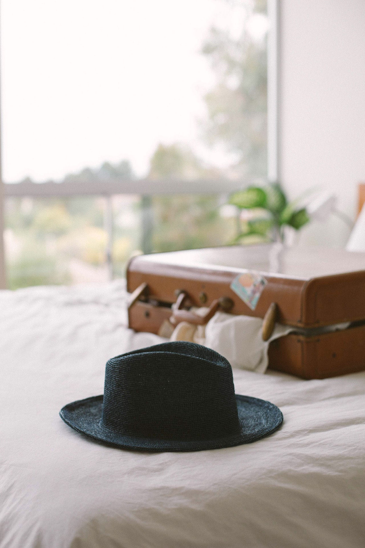 The Messer III is a men's unisex, medium-brim crochet-Raffia straw fedora hat. Color: Indigo.