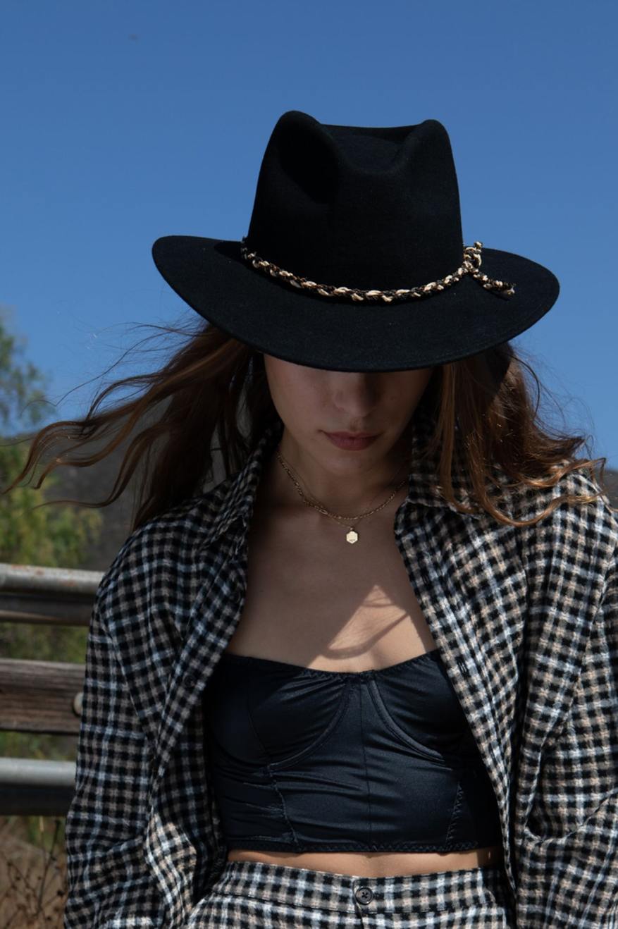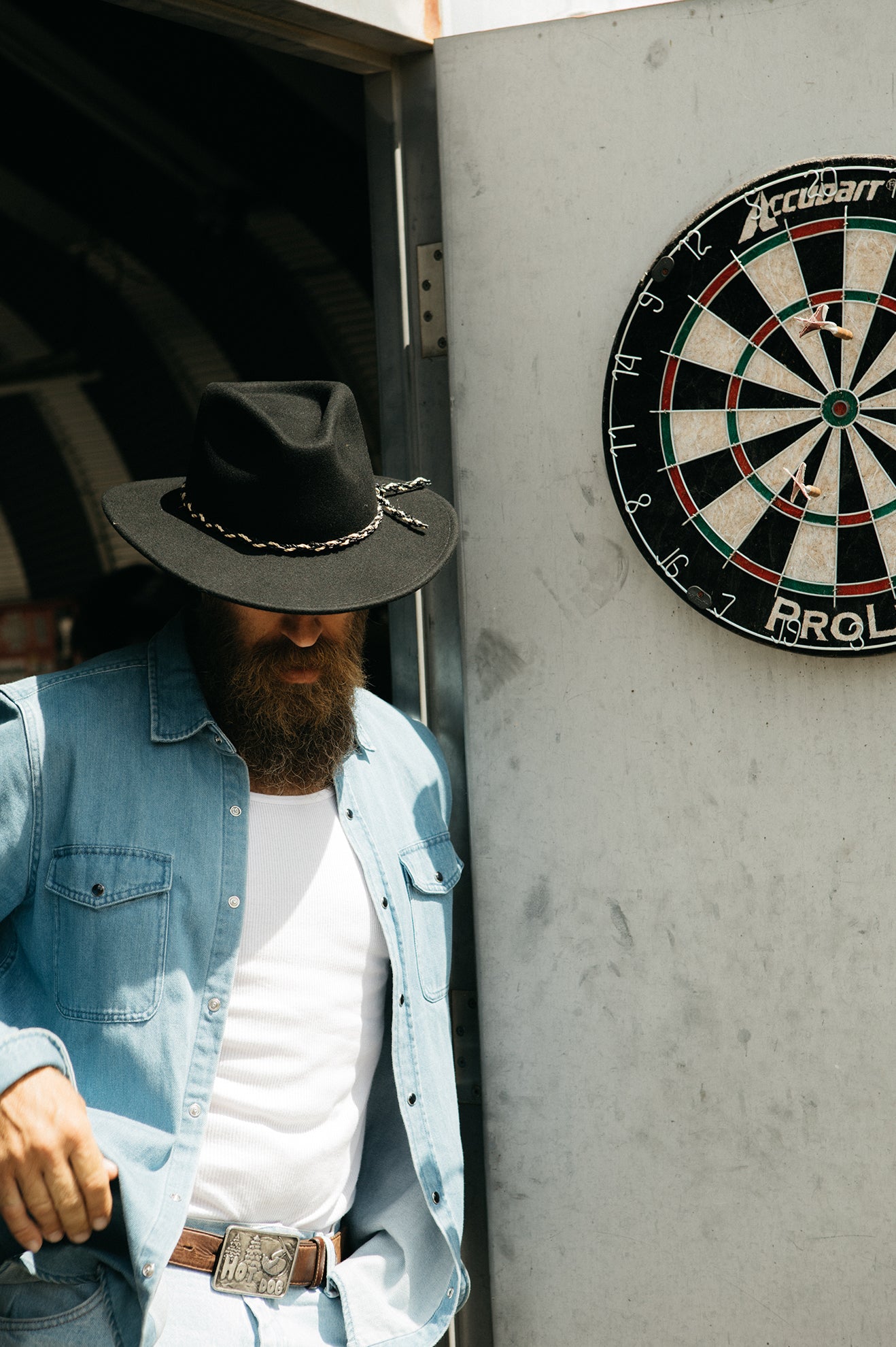This fedora combines the classic styling of our Messer silhouette with a slightly larger brim for a Western aesthetic. Detailed with a premium braided leather band and metal headwear plaque. Dial in the perfect fit with our hidden size adjuster. Constructed from Australian wool.