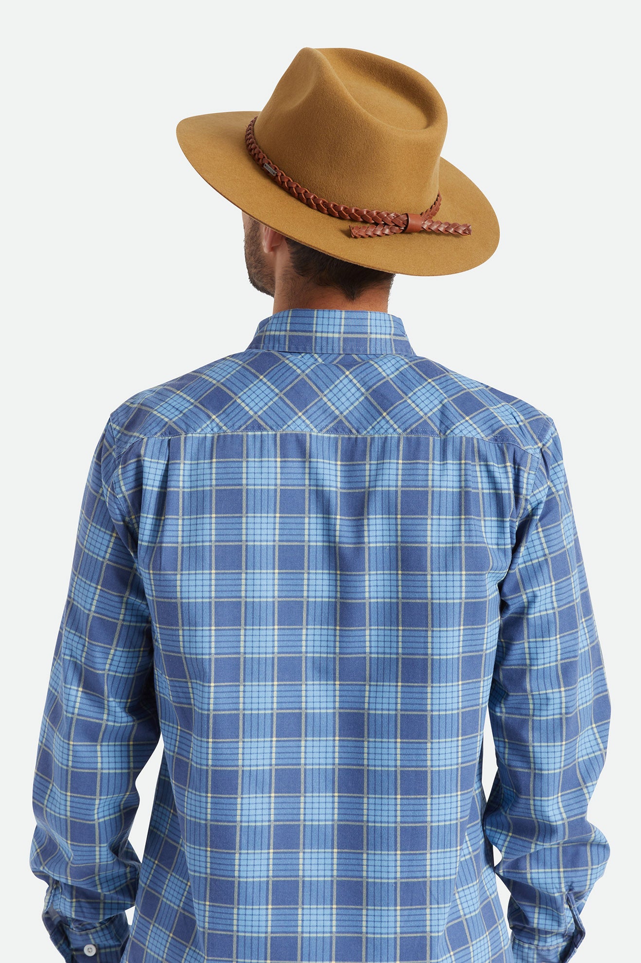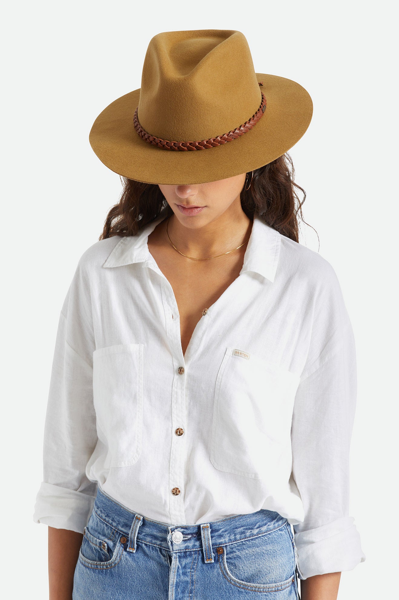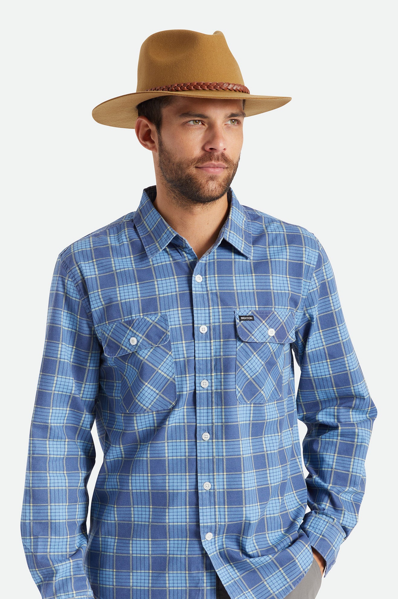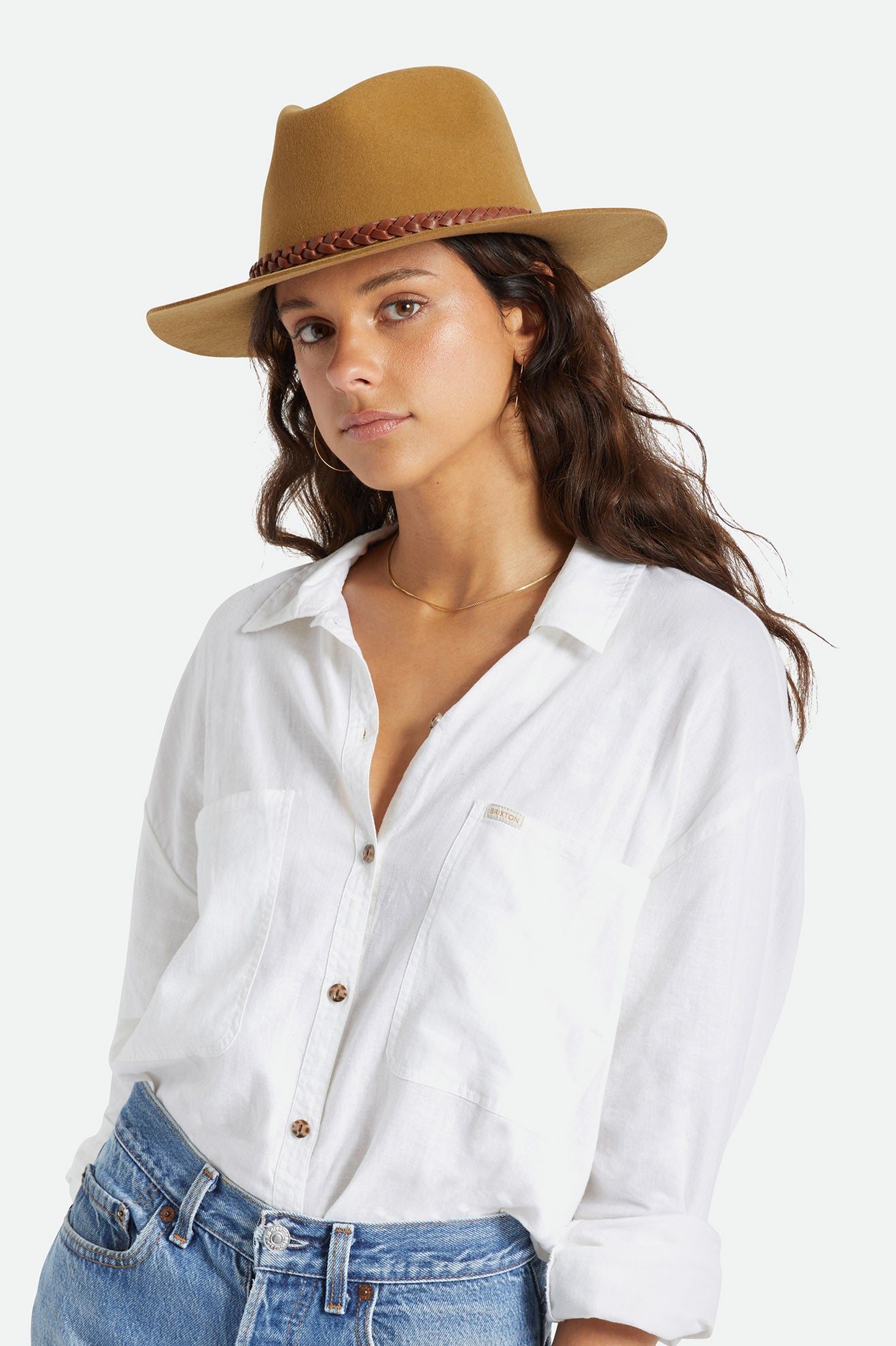 The Messer Western Fedora combines the classic styling of our Messer Fedora with a slightly larger brim to deliver a Western aesthetic. Premium details like a braided leather band and metal headwear plaque add intricate depth. Customize your fit with the adjustable Velcro strap under the inner sweatband.