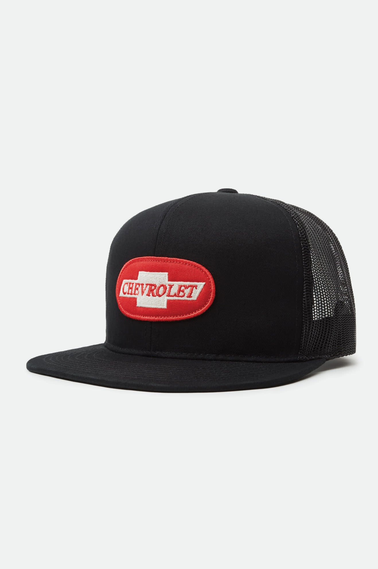 The Brixton Chevy Collaboration Michigan MP Mesh Cap is a six-panel cotton twill cut-and-sew mesh cap featuring a merrowed-edge embroidered patch and a plastic snap.