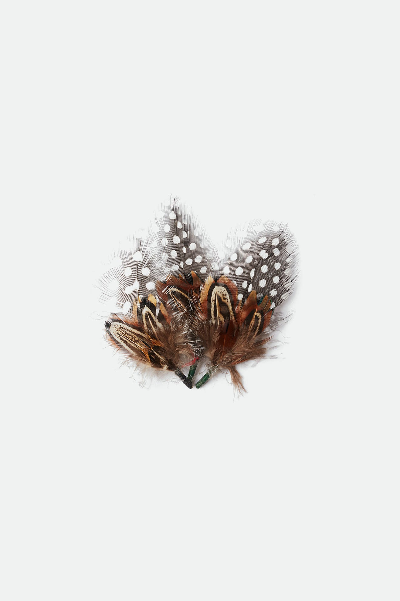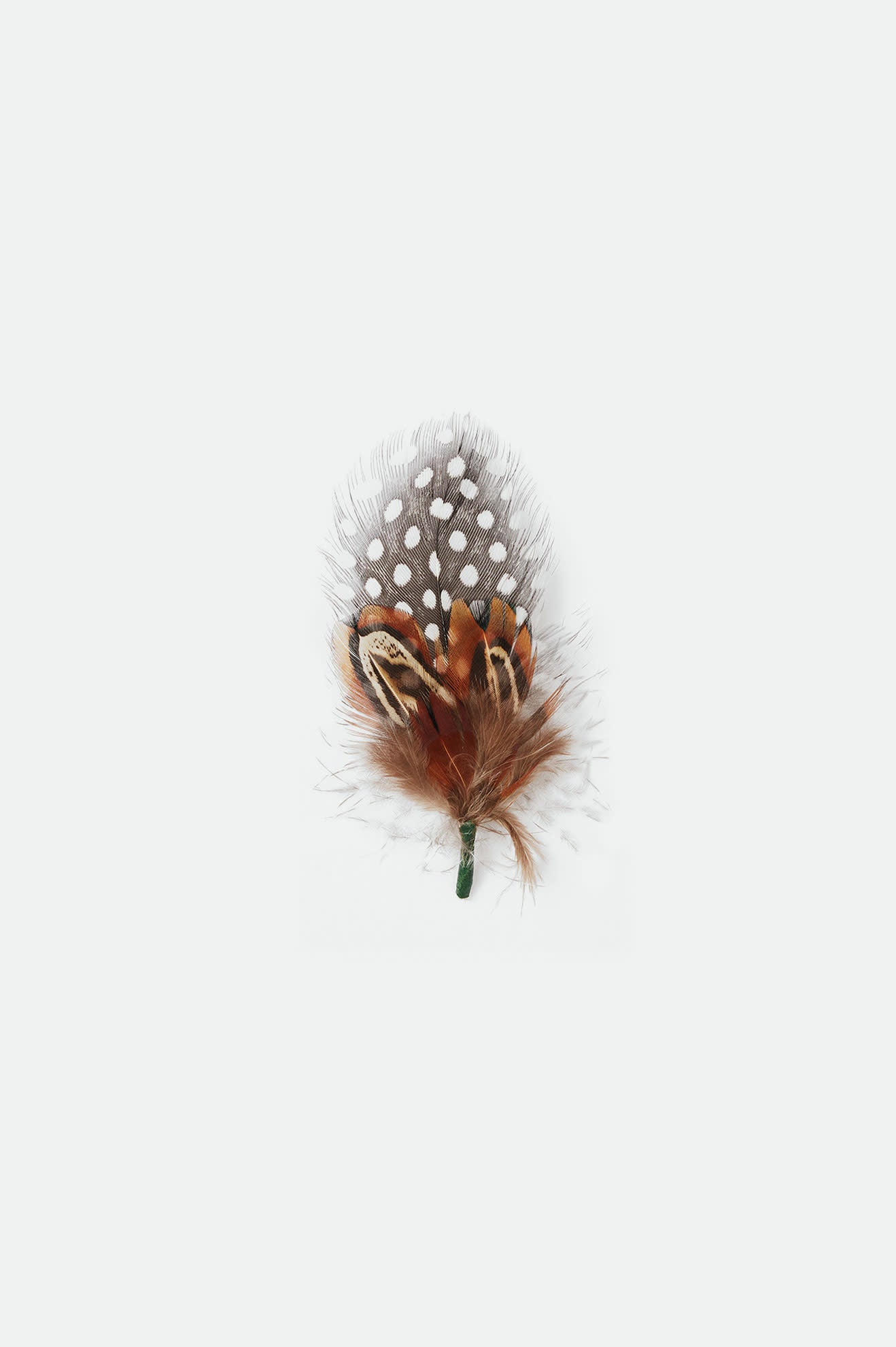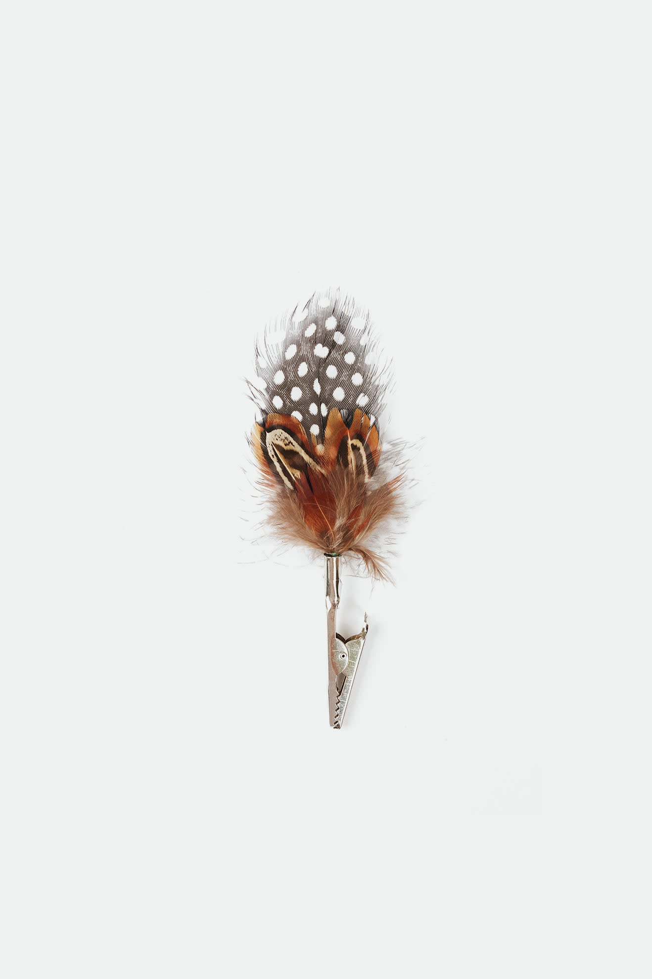 The Mikey Feather features a classic polka dot and printed pattern, saturated in vibrant rust and deep brown tones for an eye-catching addition to any outfit. Place under the outside band of your brimmed headwear for a customized look, and mix and match as desired.