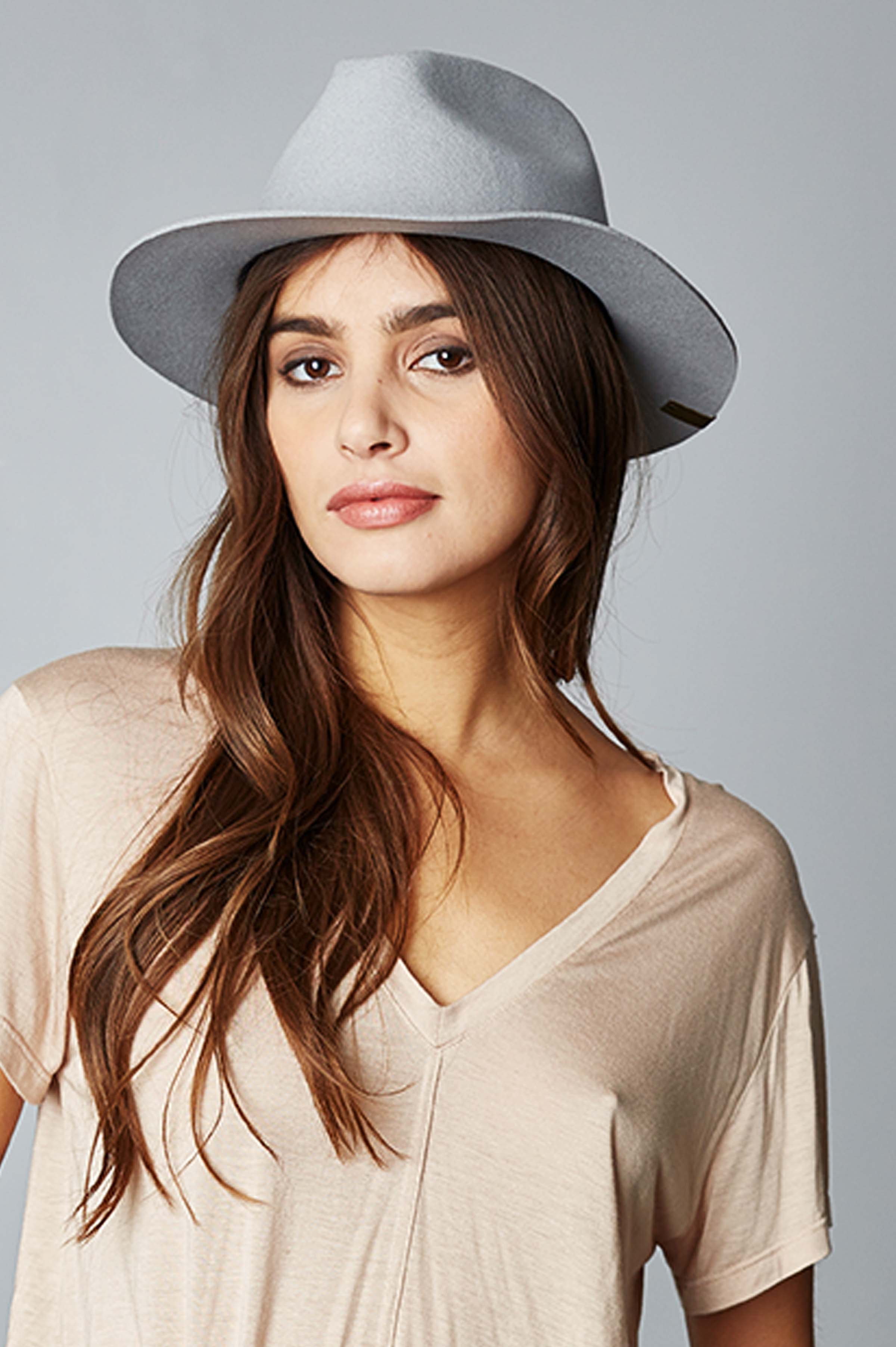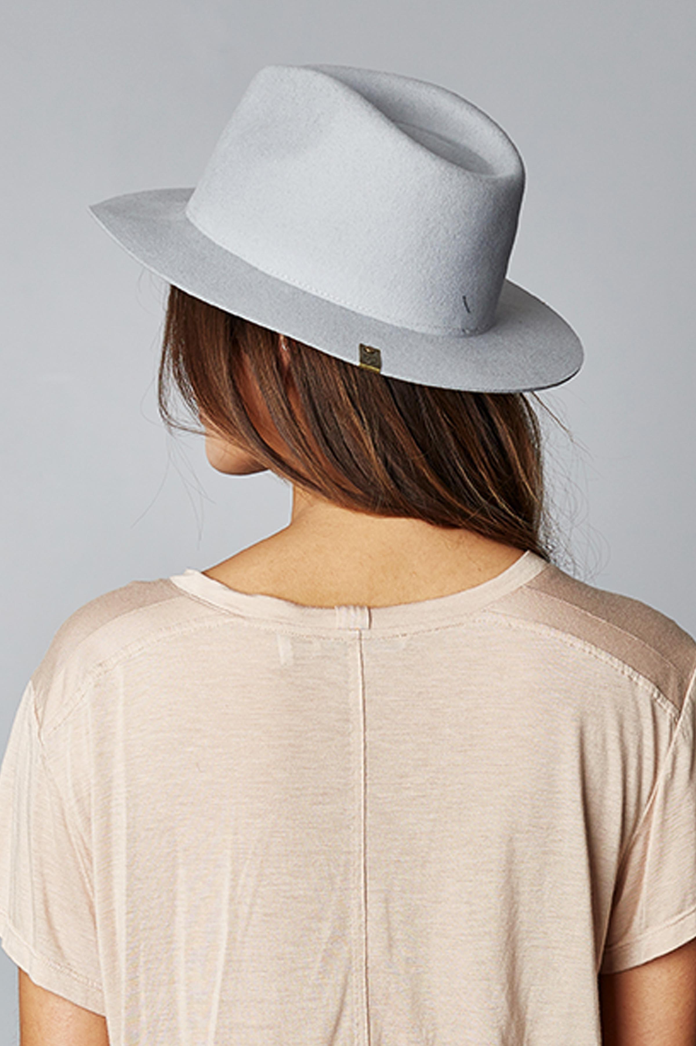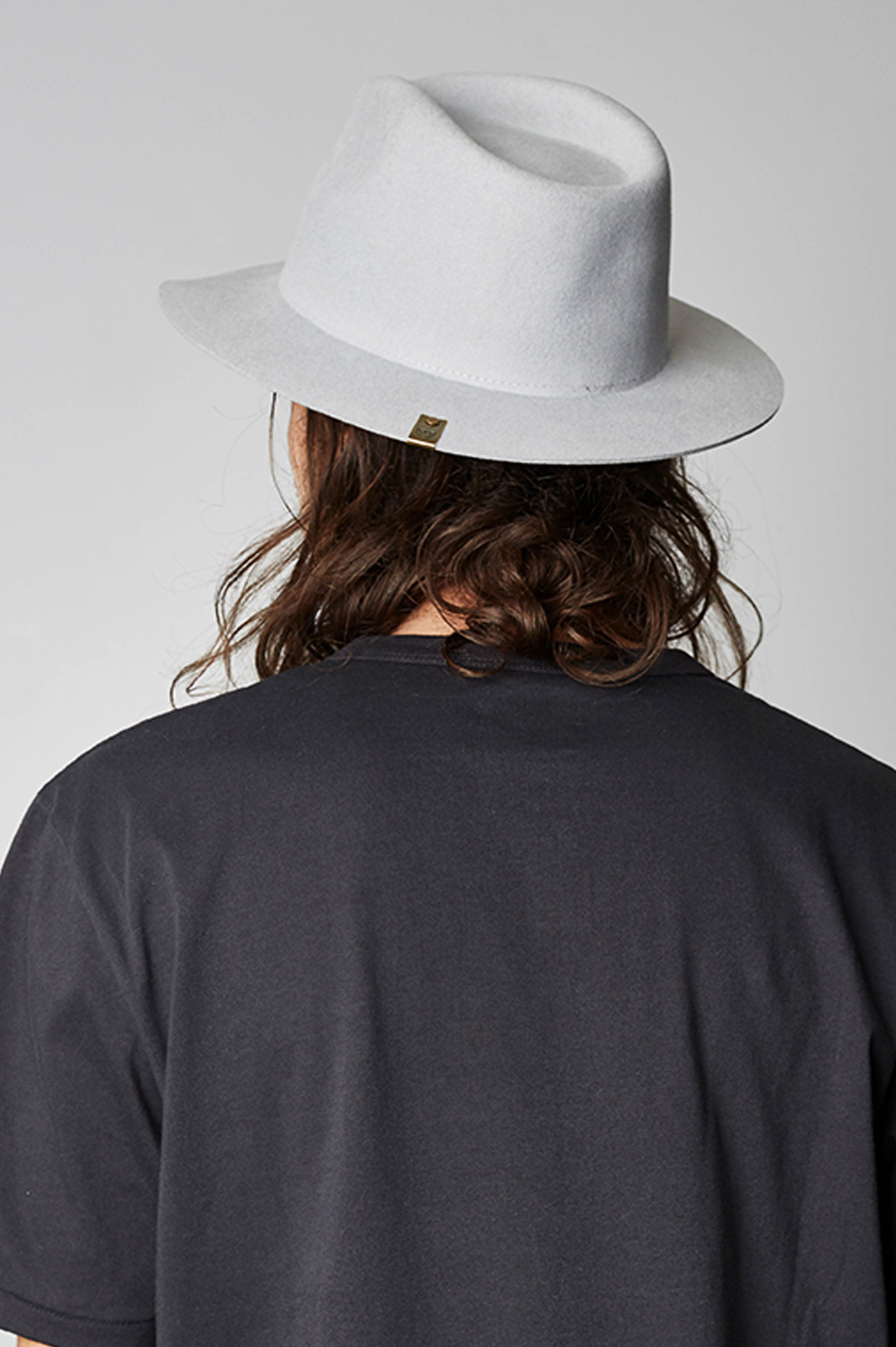The Mojave is a men's unisex, medium-brim felt fedora with a custom metal debossed brim clip and Brixton logo on inside crown. Color: Stone.