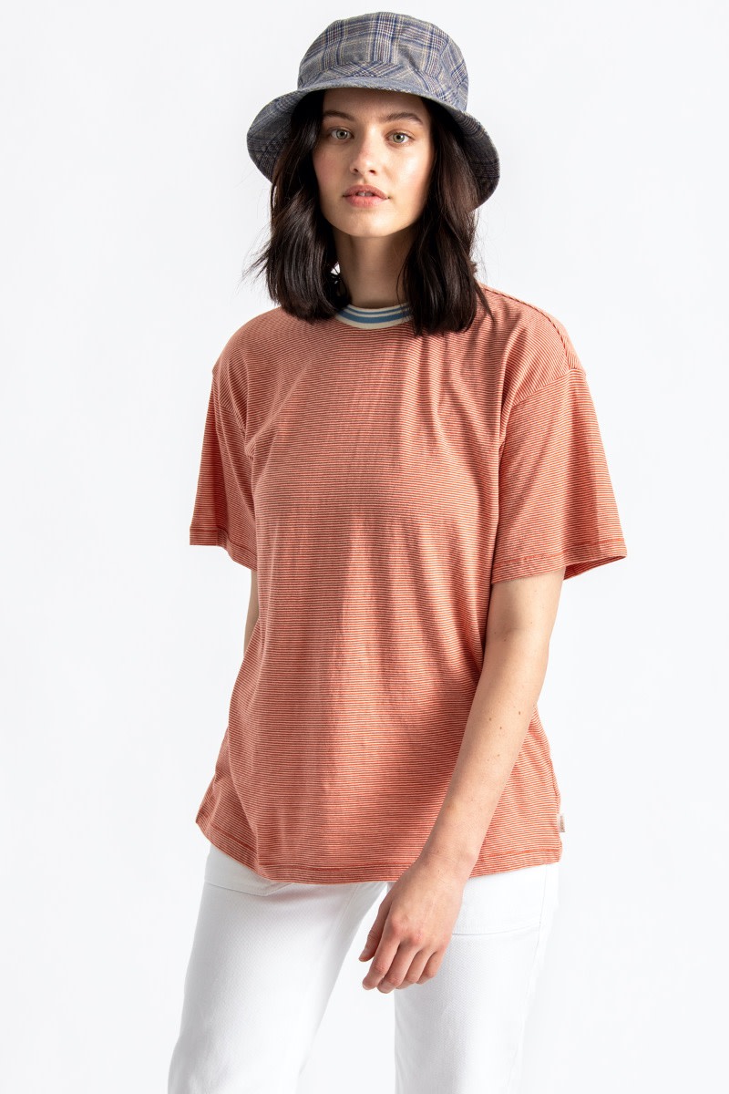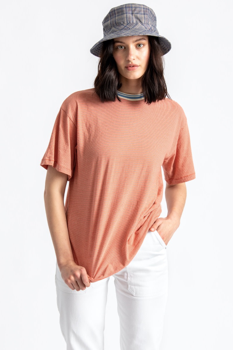 An oversized fit tee made of 100% cotton yarn-dyed stripe jersey.