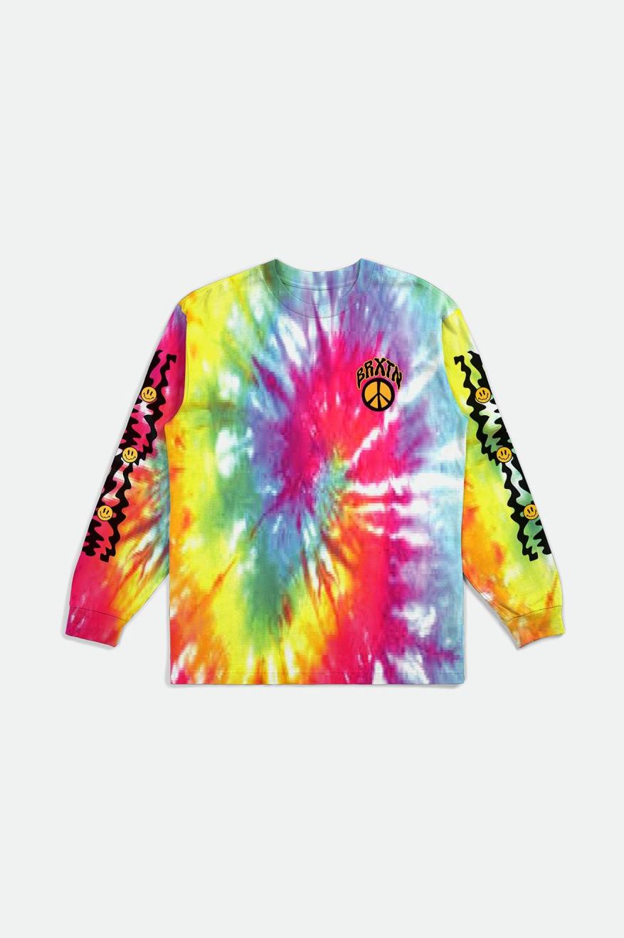 The Mozely L/S is a crewneck tee on the side of peace. Made with medium weight cotton, it has a unique tie dye treatment in bold hues. Finished with sleeve and left chest screen prints.