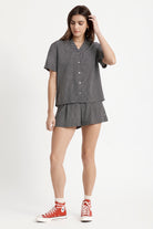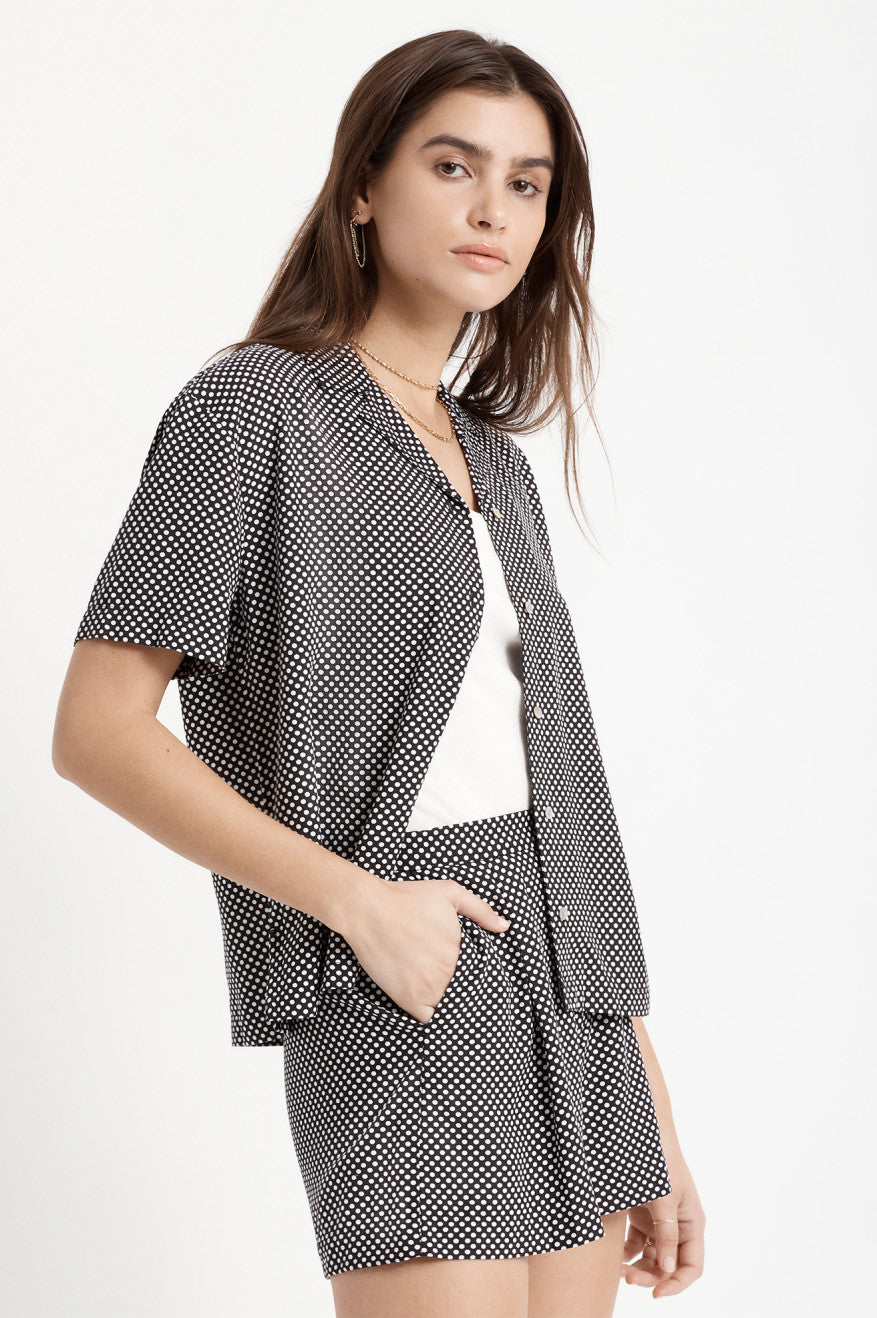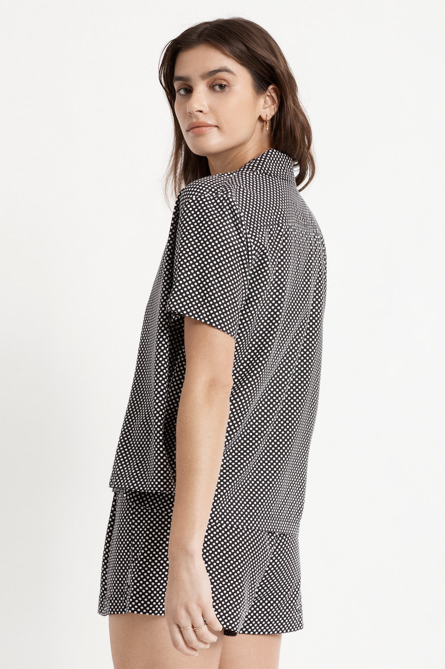 The essential woven shirt. It is great for work, home wear, and leisurely activities. The Night Fever S/S Woven top features 100% viscose, side seam hem vents, and a notched collar. Easy to slip on and off, there’s no occasion this top doesn’t work for.