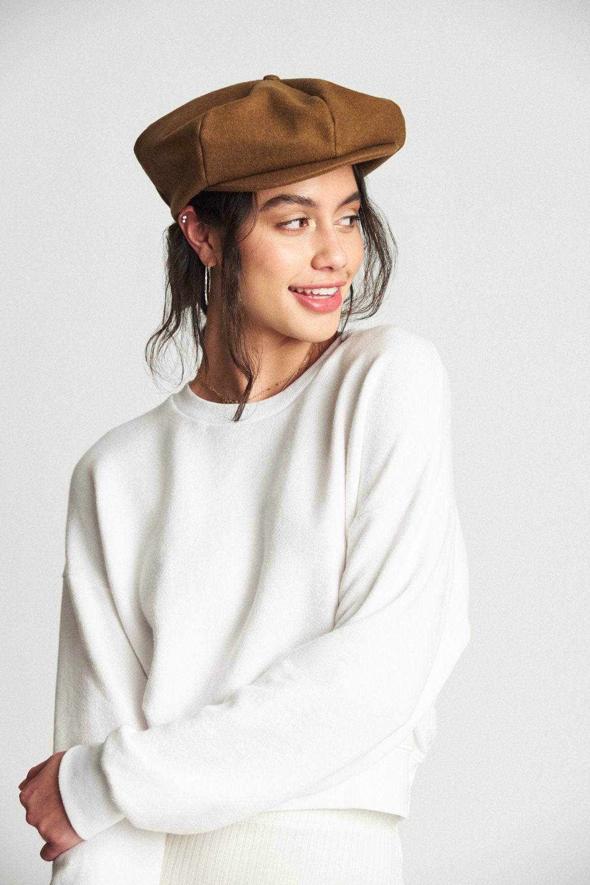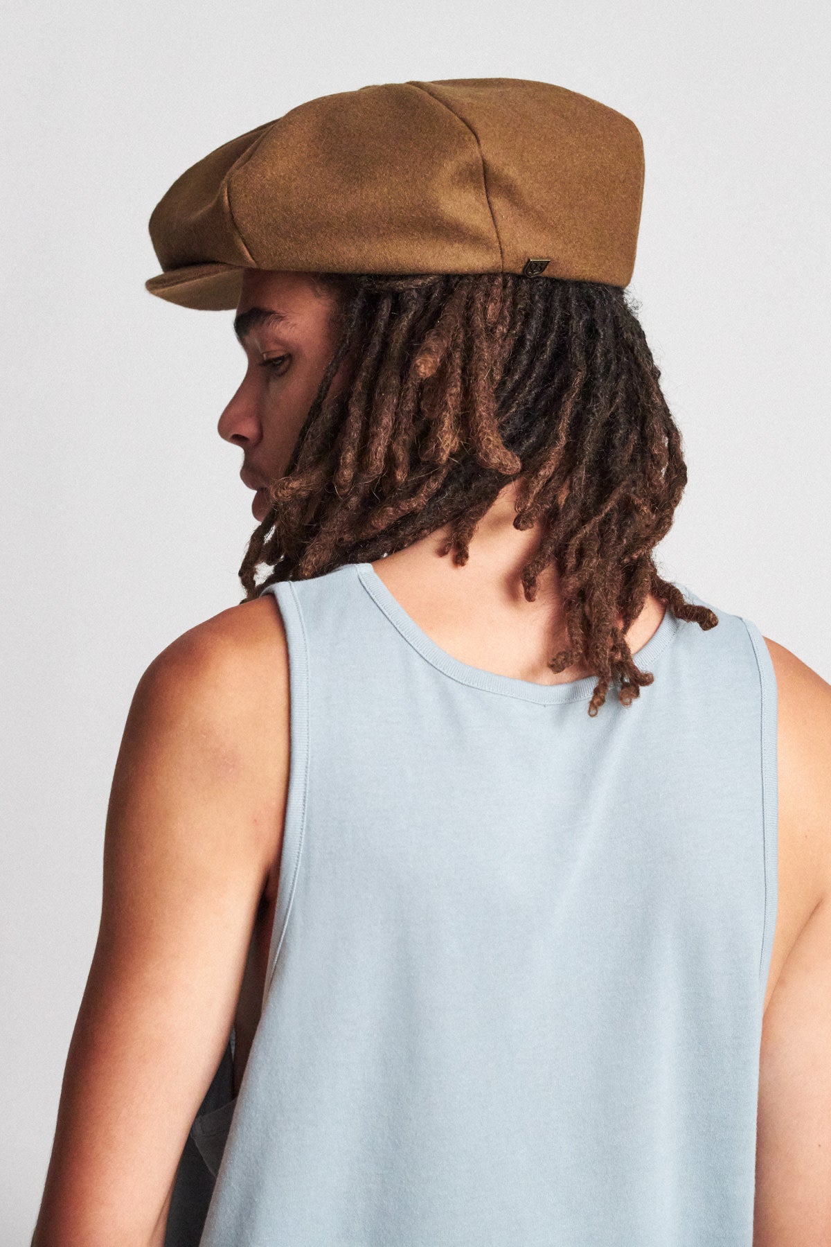 The Ollie is a men's unisex, oversized six-panel cut-and-sew snap cap with a custom liner. Color: Camel.