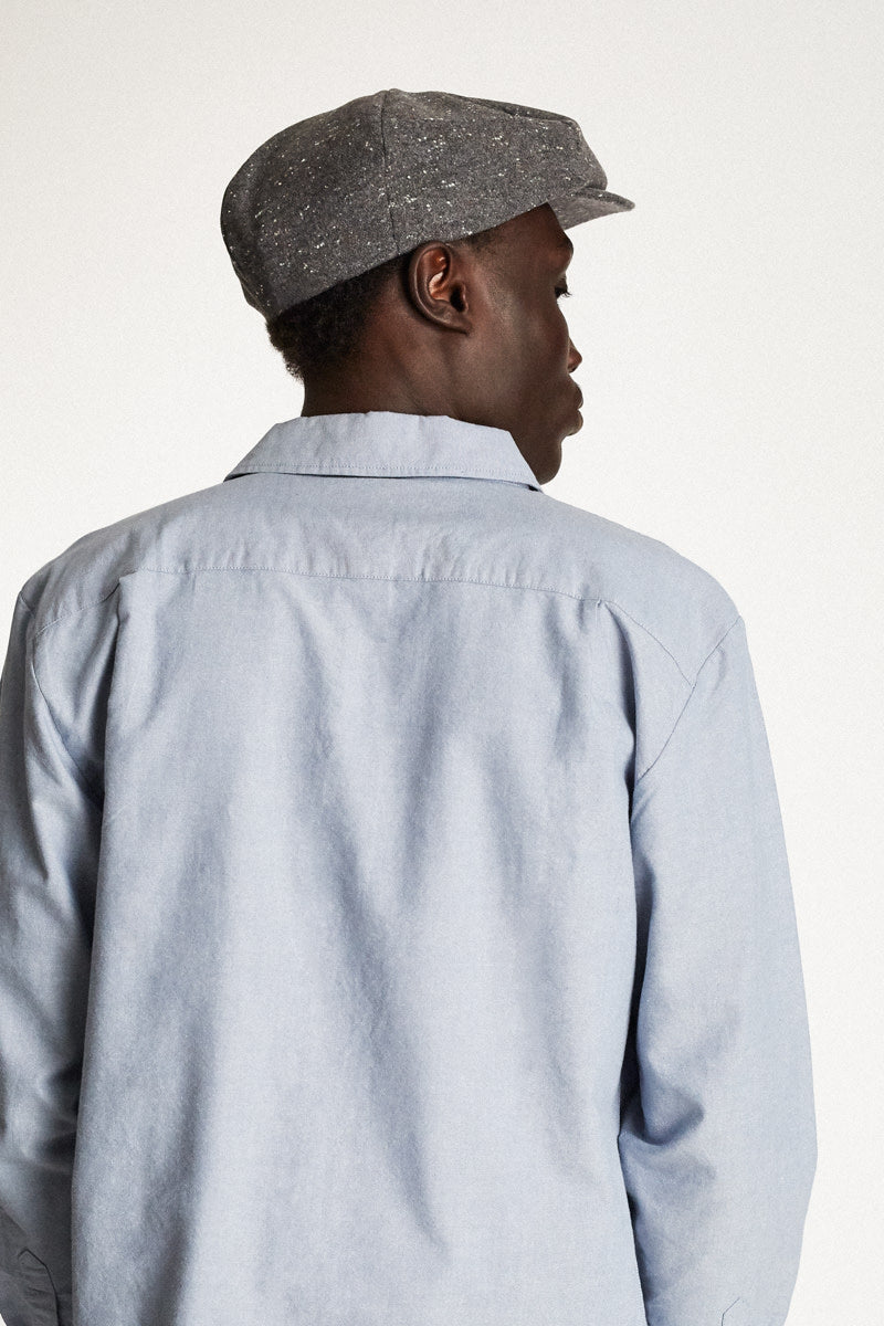 The Ollie is a men's unisex, oversized six-panel cut-and-sew snap cap with a custom liner. Color: Grey/White.