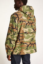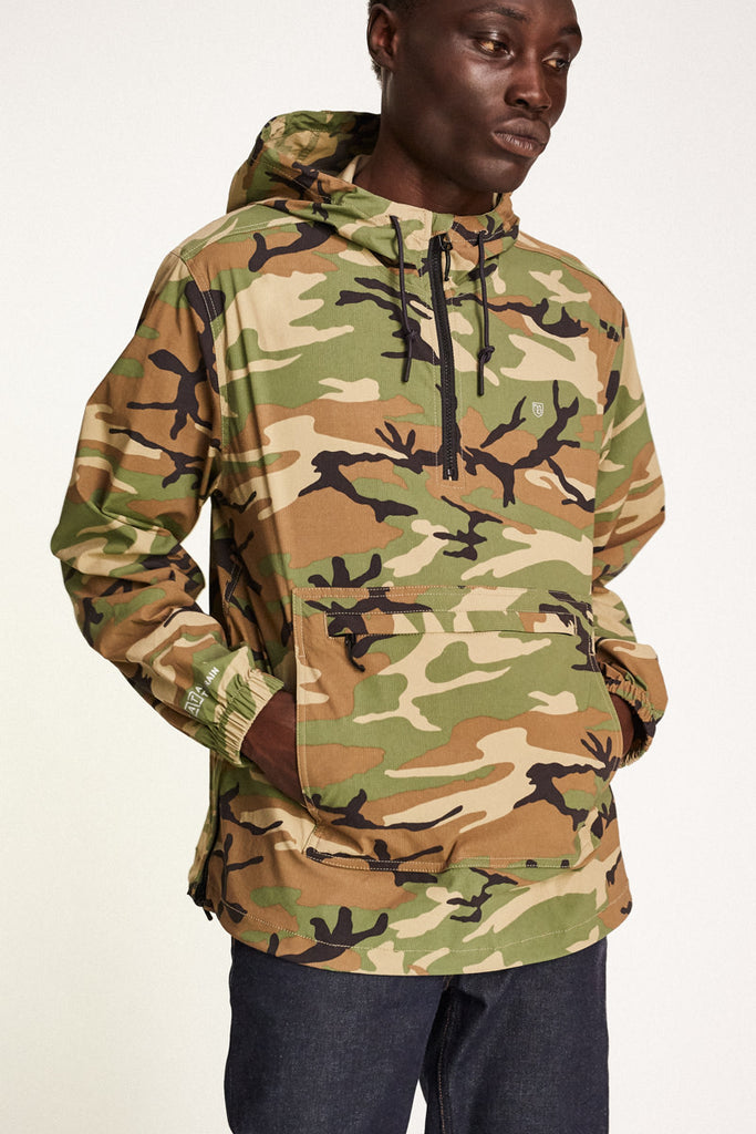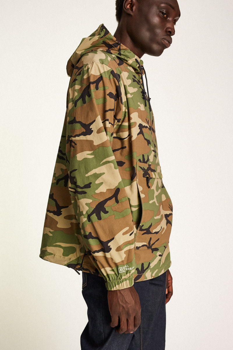 A hooded anorak jacket with set-in sleeves made in 4.5-oz. nylon ripstop with two-way stretch and water-repellent coating. It features an adjustable hood and waist, stow pocket, and reflective B-shield print.