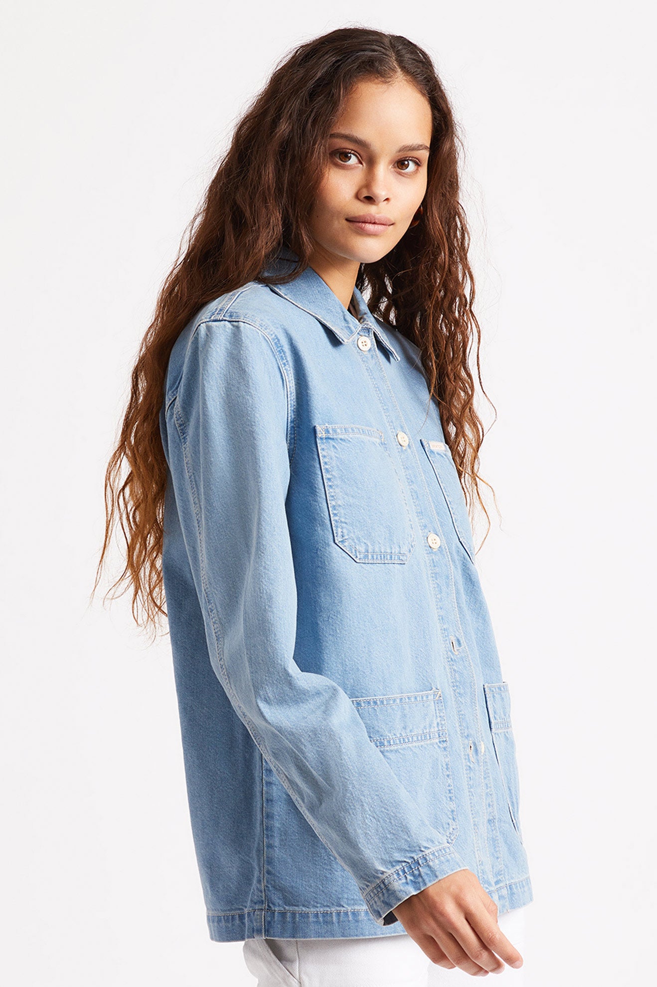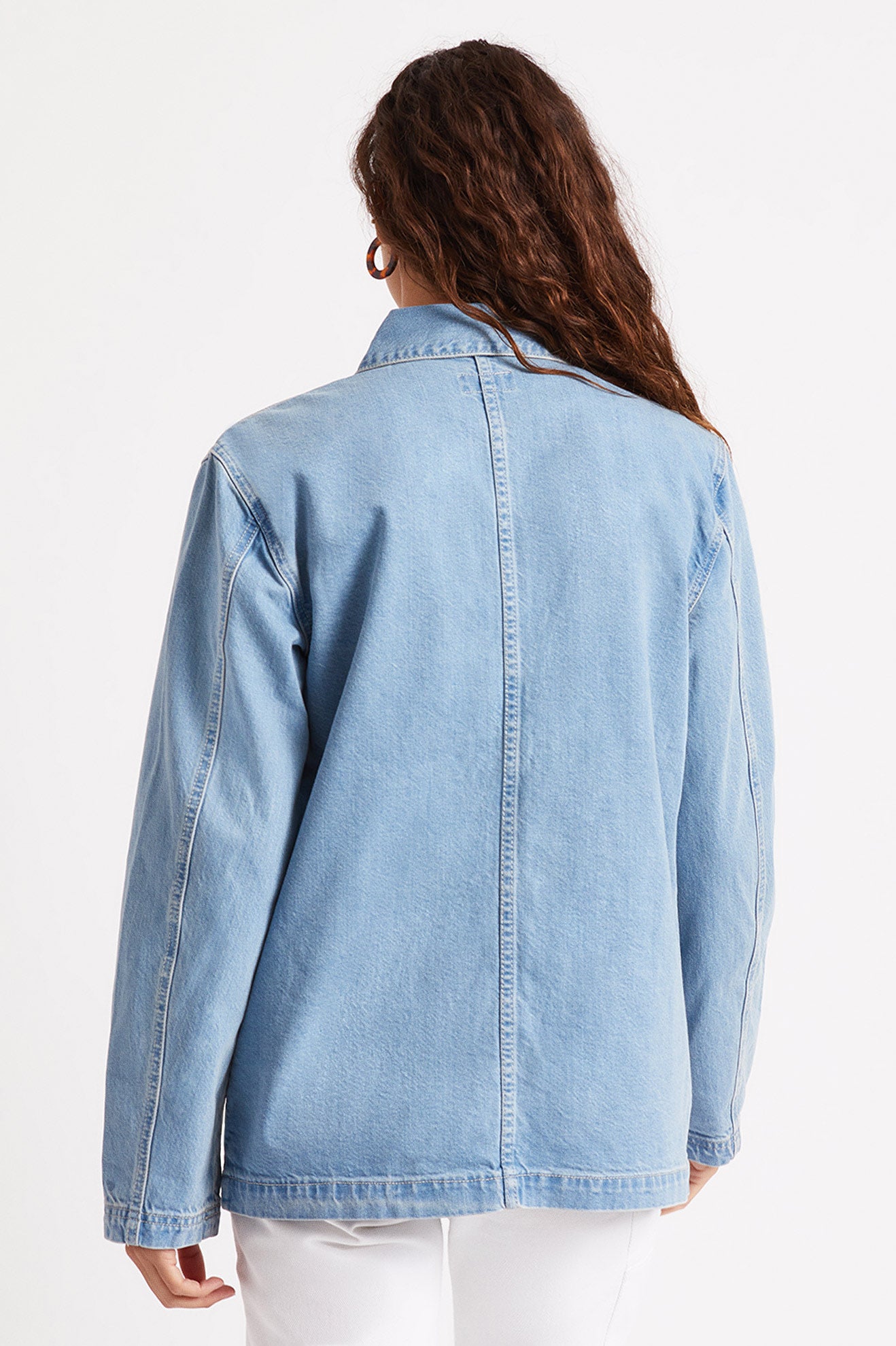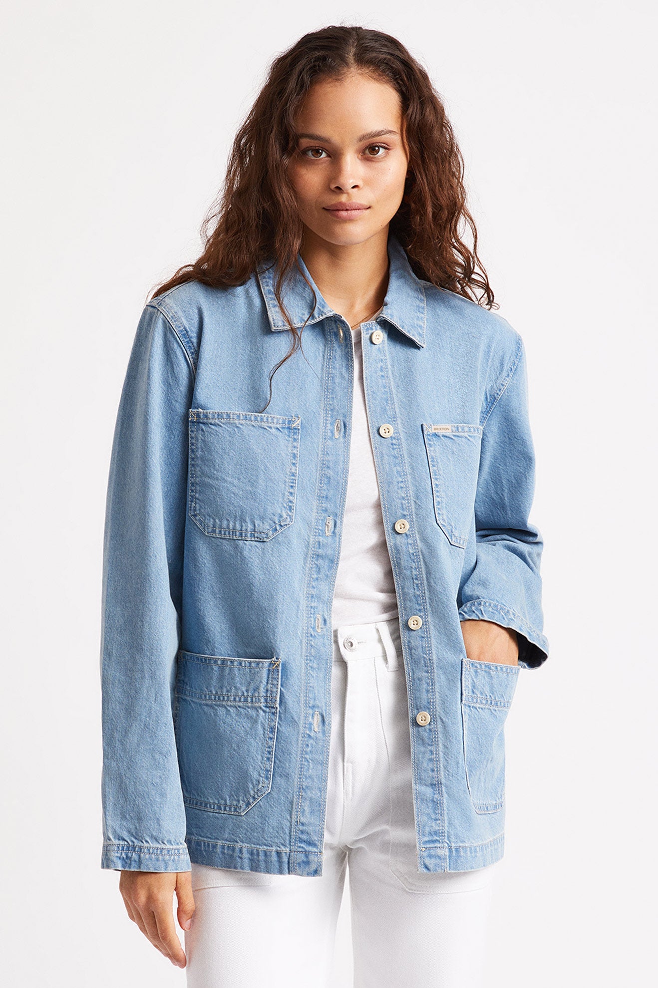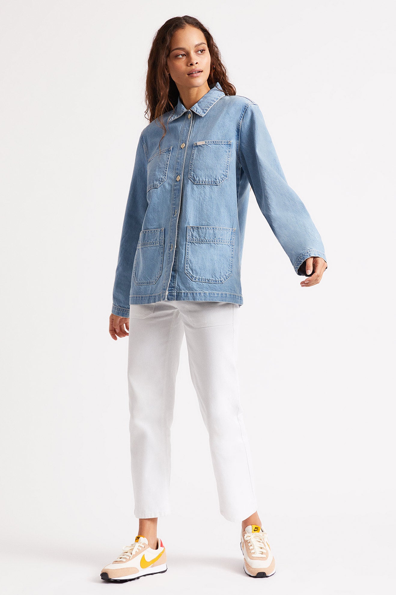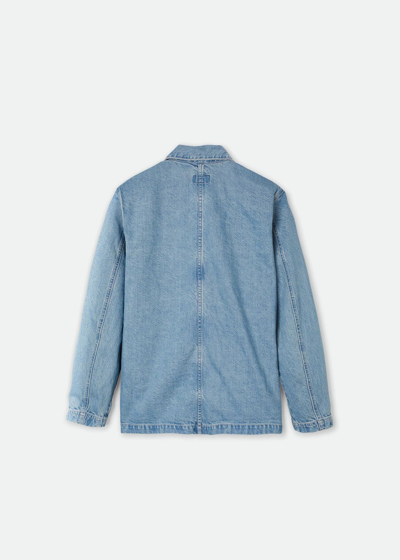 Made of 100% cotton Cone Denim, our Philly Chore Coat is designed with refined durability and long-lasting quality in mind — a staple that will never go out of style. The contrasting white buttons give this jacket a true vintage feel along with the faded indigo wash.