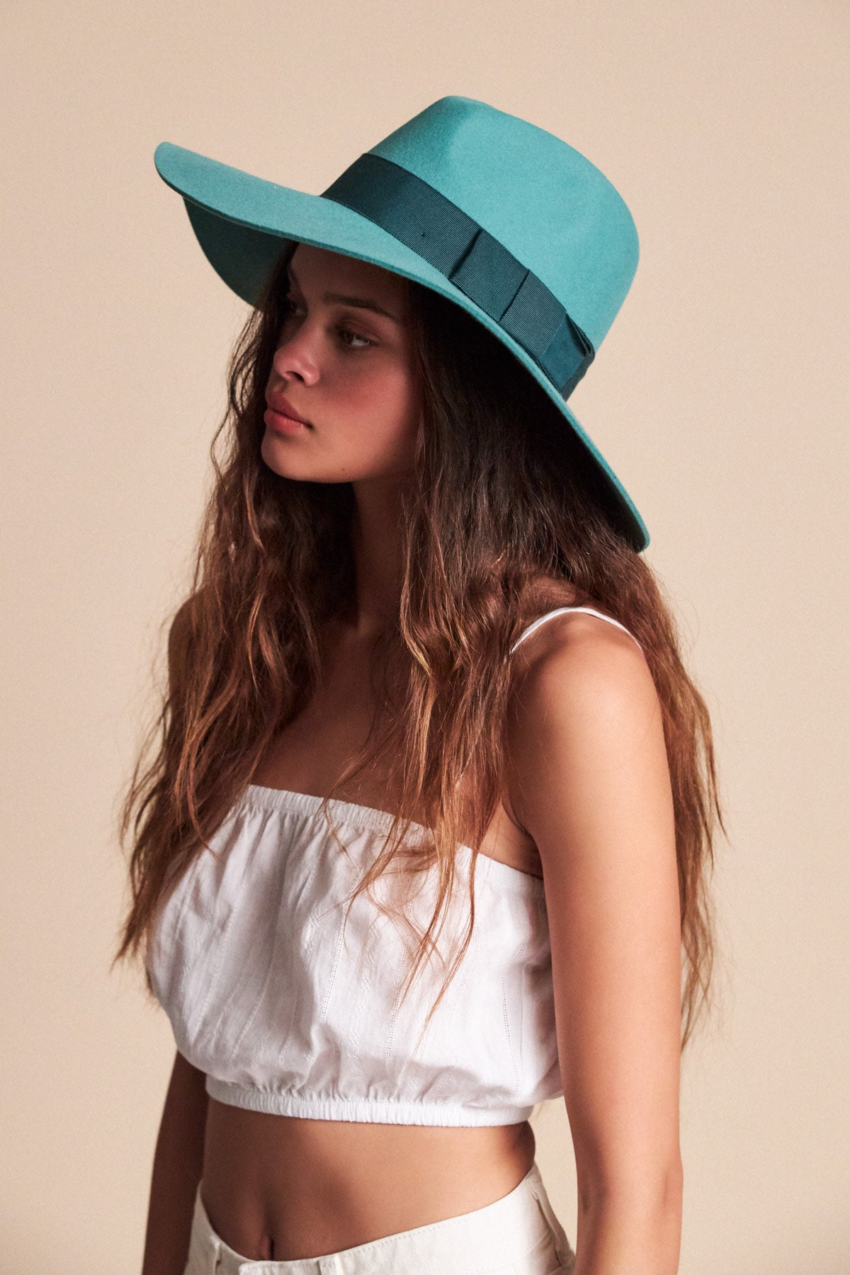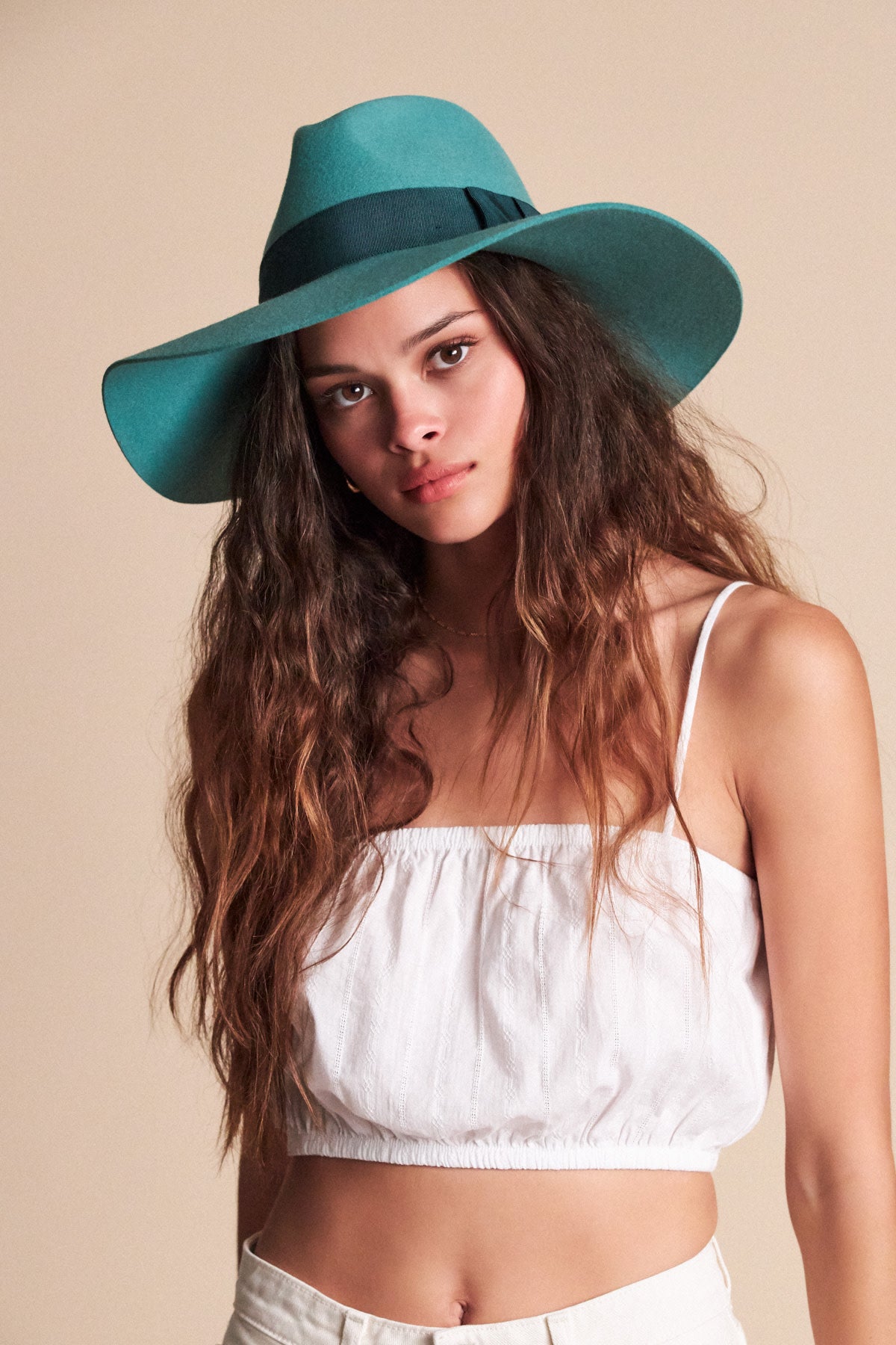 The Piper Hat is a feminine wide brim floppy felt hat.