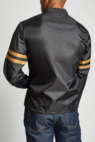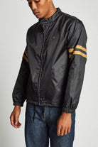 A moto-inspired jacket with mock-neck collar made in a 100% polyester shell. It features a B-shield patch, elastic cuffs, sleeve stripes, and drawcord waist hem.