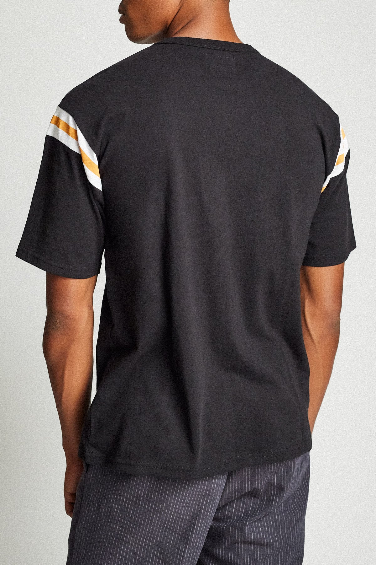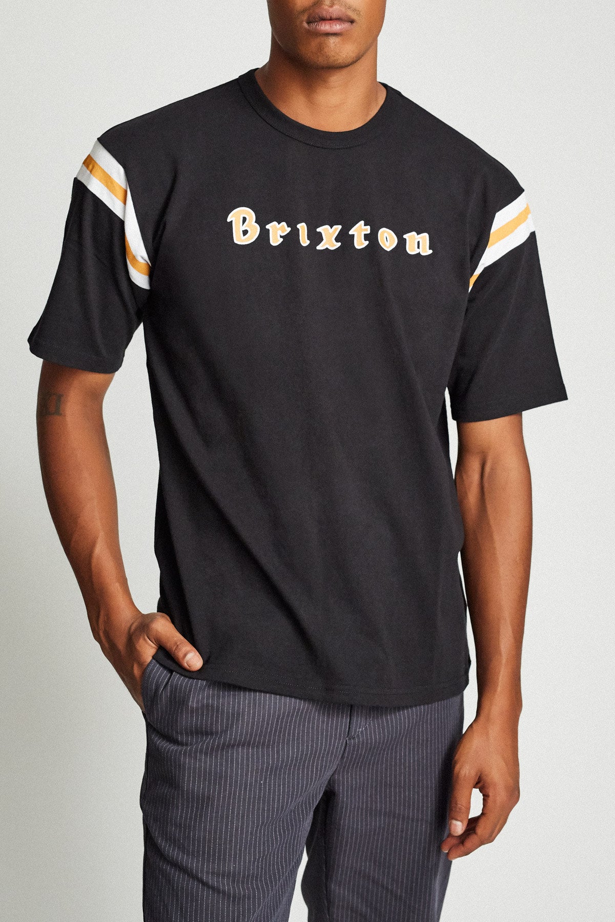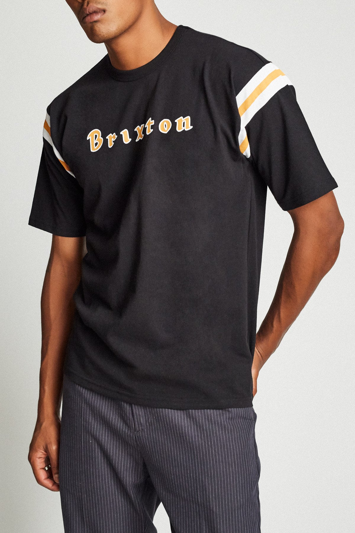 A 200-gram short-sleeved jersey knit top featuring custom sleeve stripes, pick-stitch hem details, and Brixton screen print at enter chest.