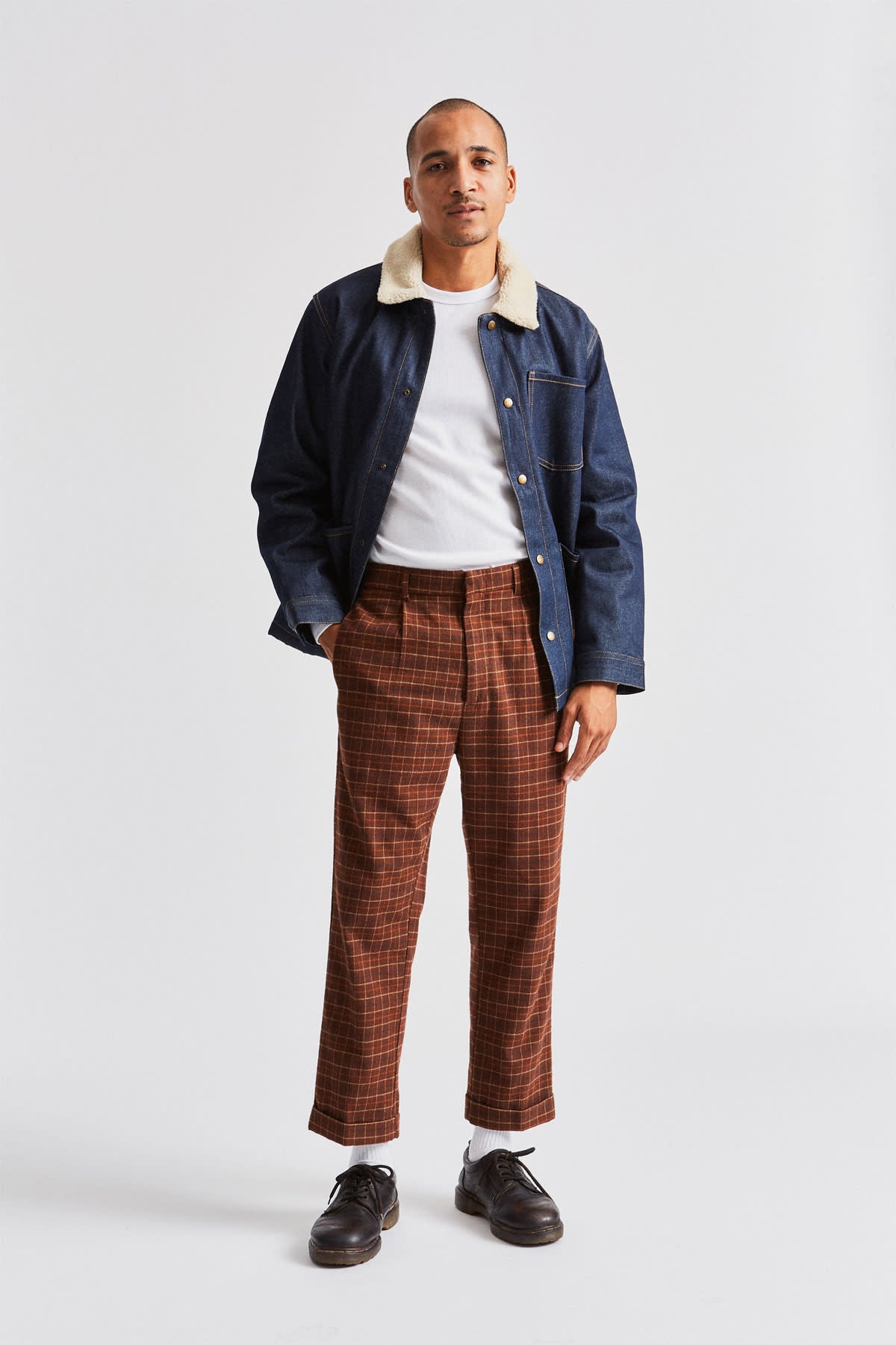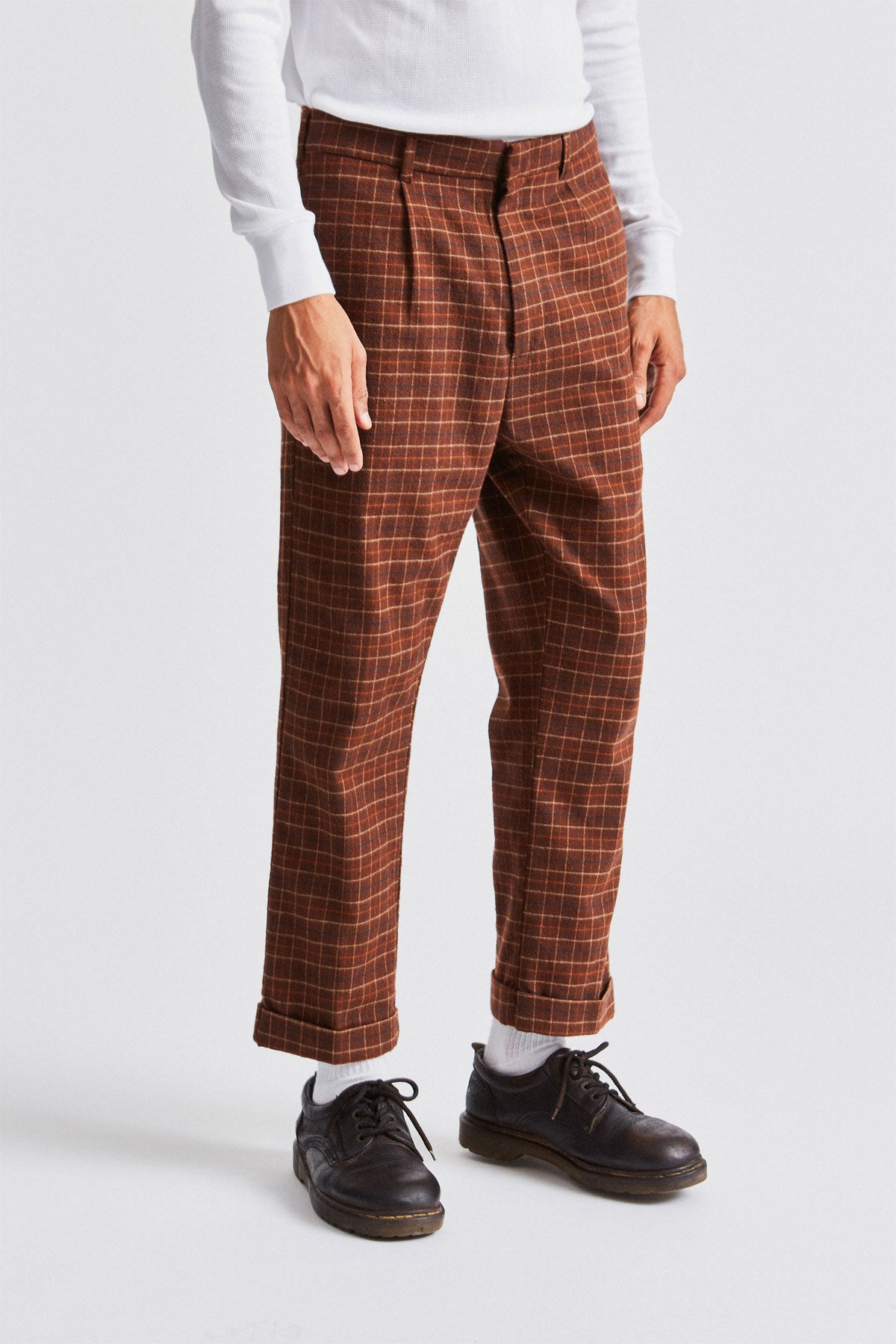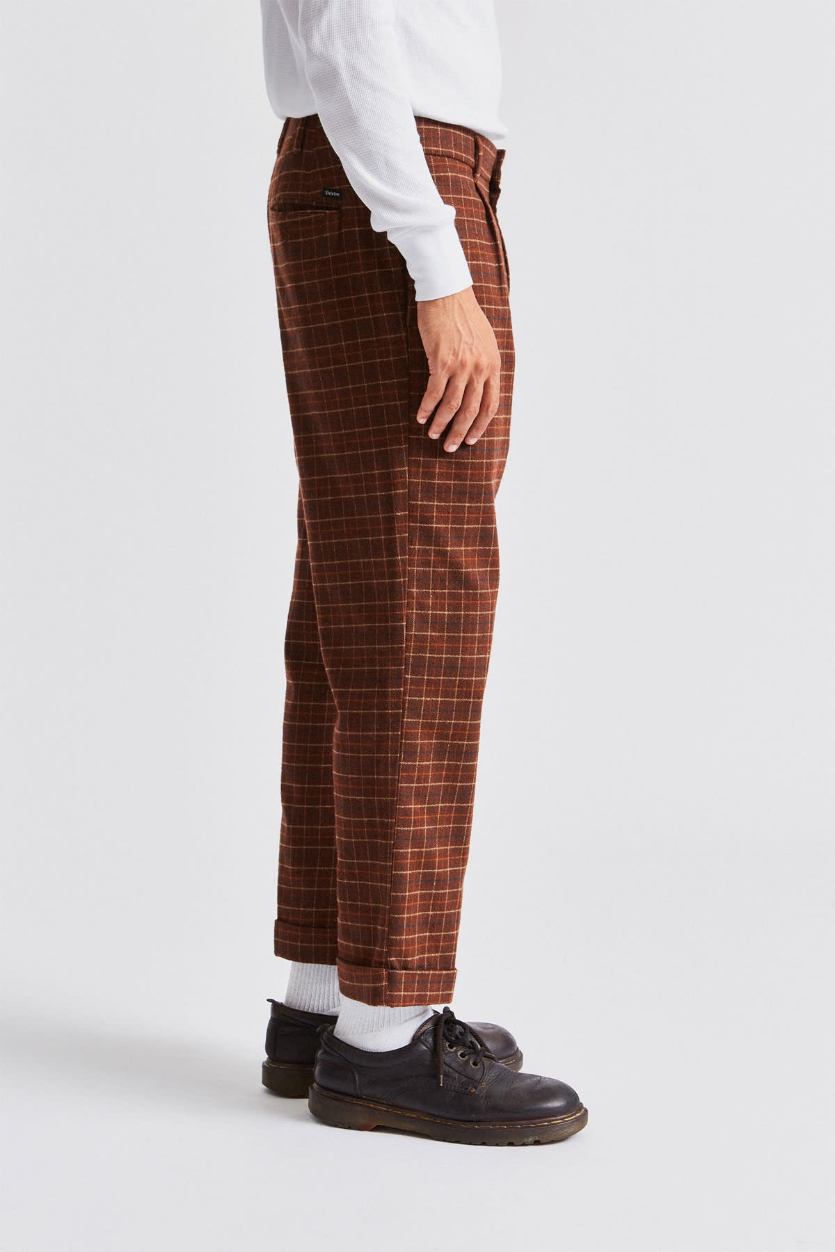 The Brixton Regent Trouser Pant is a relaxed-fit trouser pant with a tapered leg made in lightweight cotton/poly plaid twill. It features an exterior adjustable leg cuff for preferred length, stay-press crease, custom Brixton labeling, graded inseam, and a 16" leg opening.