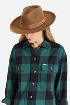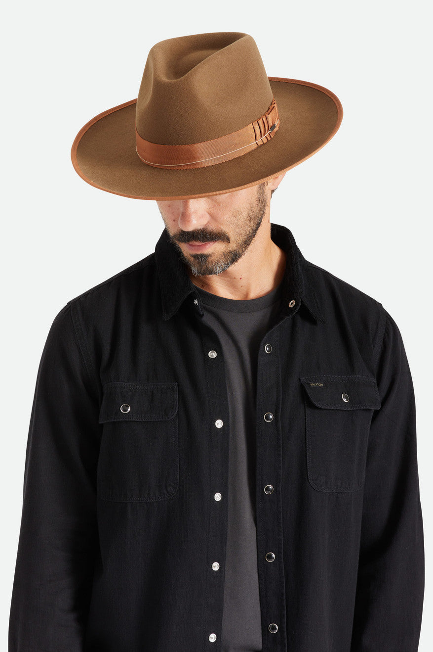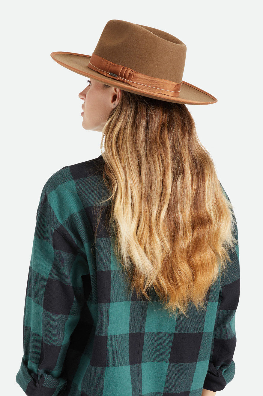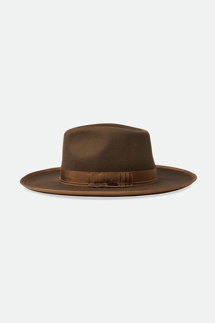 The Reno Fedora is a modern take on a heritage style. It has an iconic teardrop crease and a symmetrical front pinch. Made with Australian wool with a layered grosgrain band and brim taping.