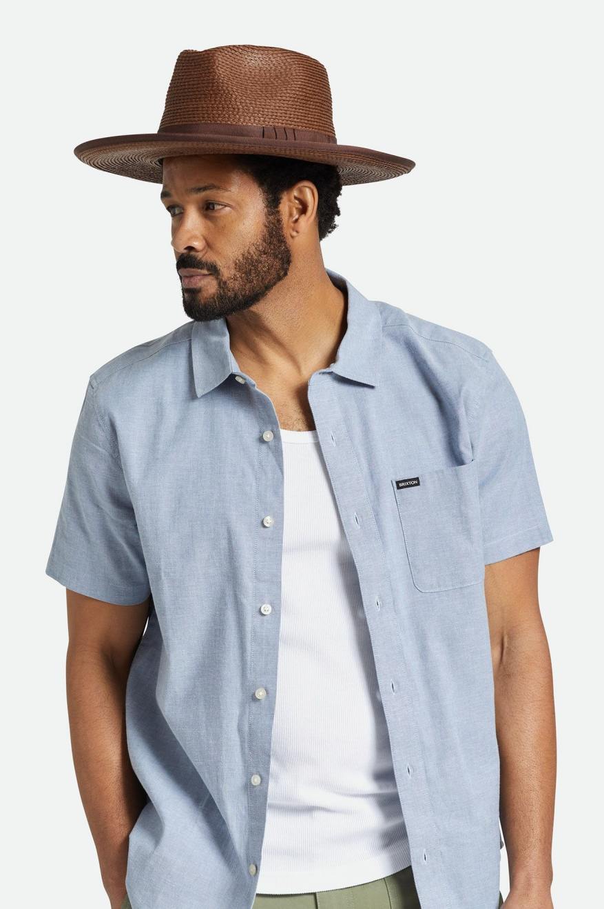 The Reno Straw is a warm weather version of a heritage form. Crafted with medium-structure paper braided straw, it provides 50+ UPF coverage and breathability. Decorated with a metal headwear plaque and grosgrain band.