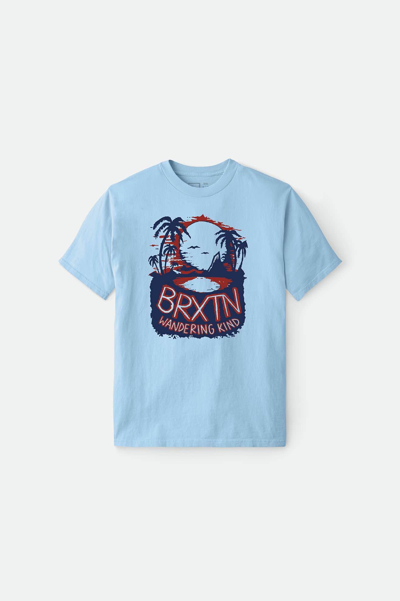 The men's Sagen is a crew neck tee with a standard fit. Constructed with sustainable fibers, made of 100% recycled fabric, including recycled scraps and five recycled plastic bottles — saving 63 gallons of water per shirt. Featuring classic branded logos and hand-drawn graphics inspired by vintage tourist apparel. Color: Sky Blue