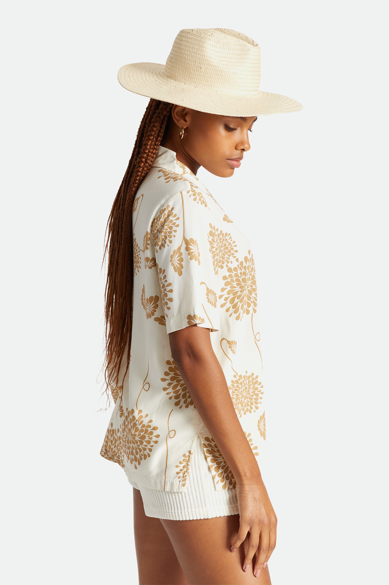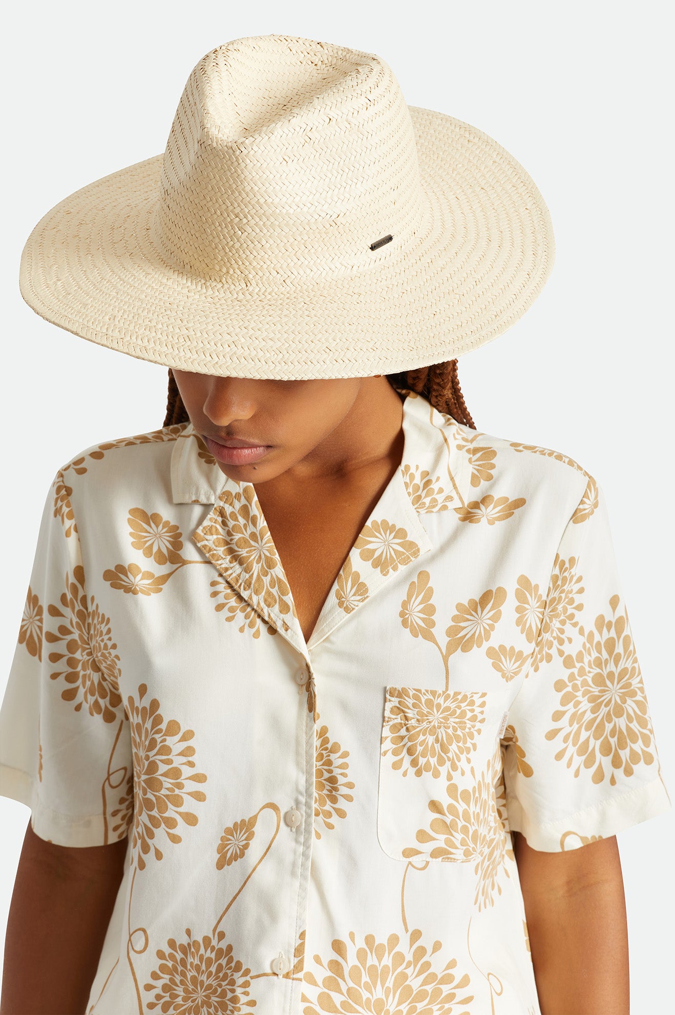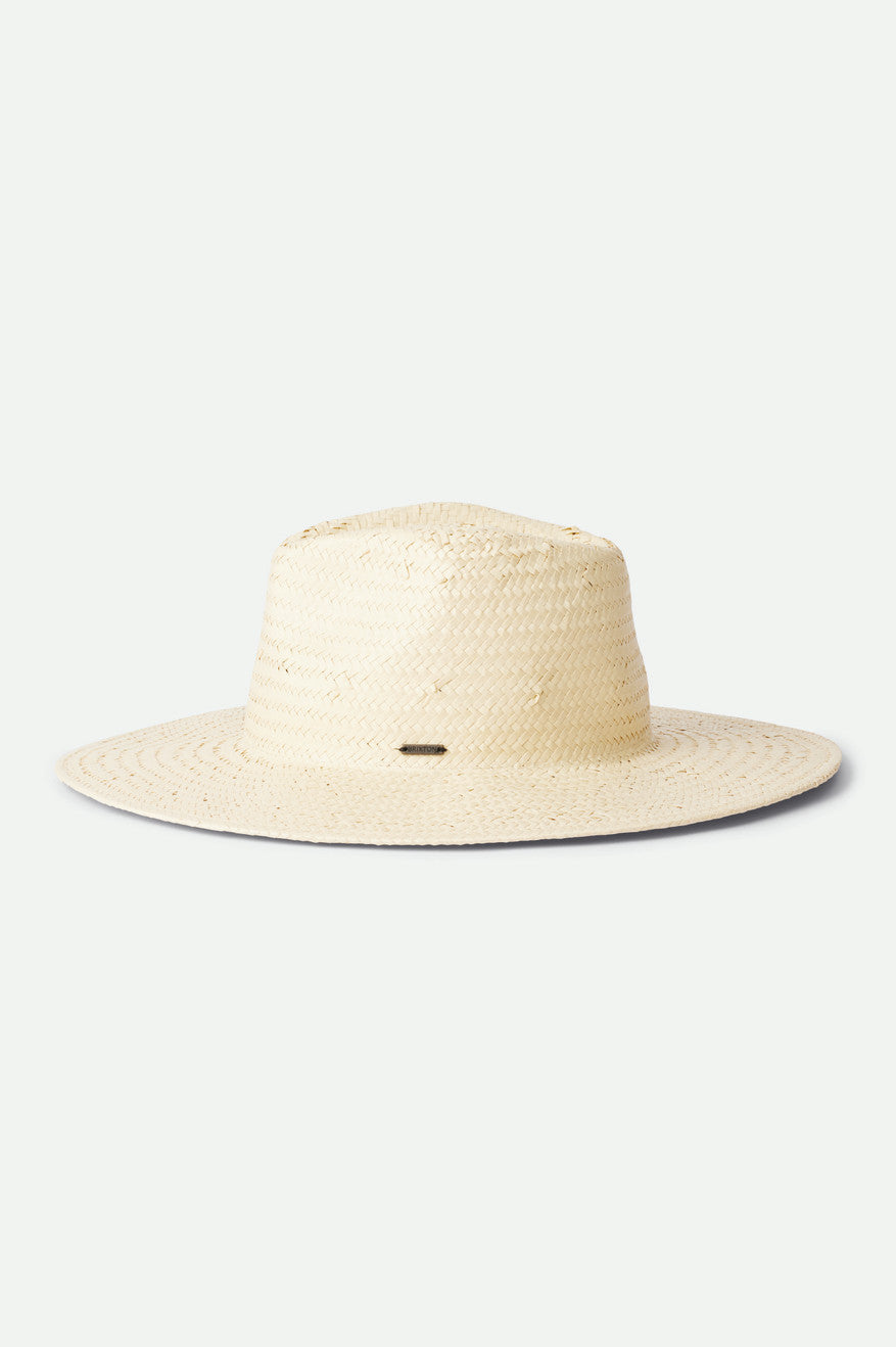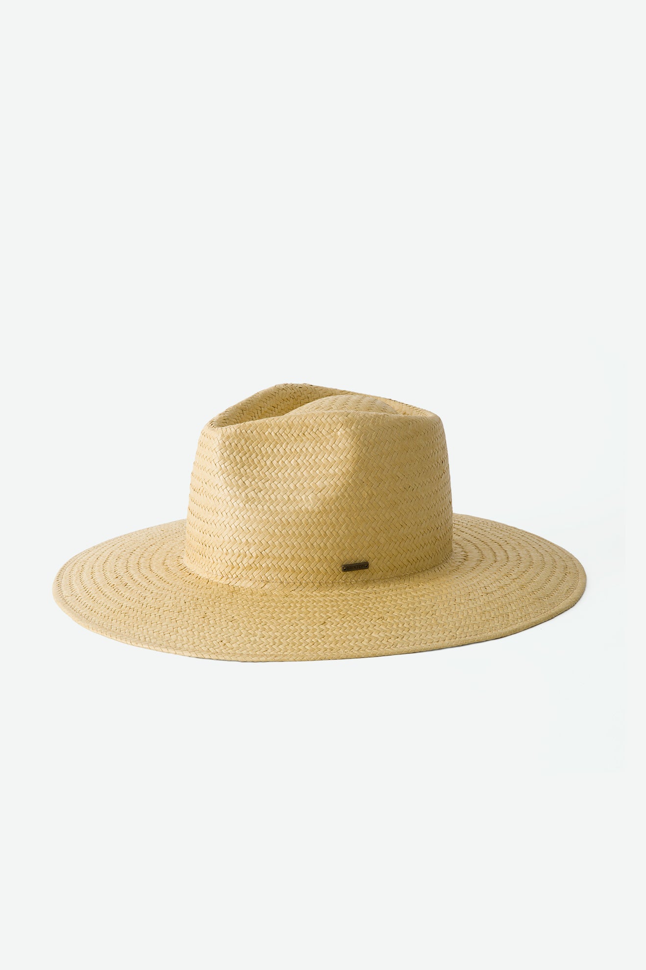 Salt, sand and the Seaside Sun Hat. This wide-brim hat has a clean silhouette with an elegant pinch and teardrop crease. Woven from paper straw, it provides 50+ UPF coverage in a lightweight package. Finished with a bronze metal headwear plaque.