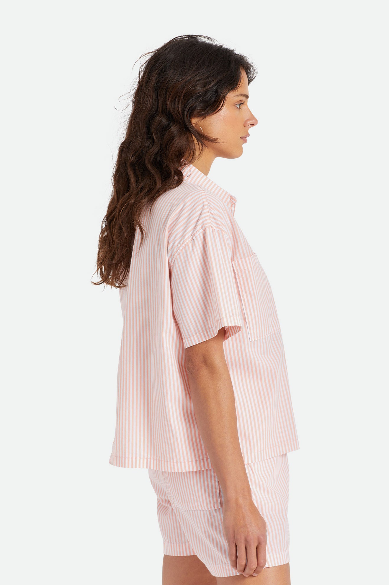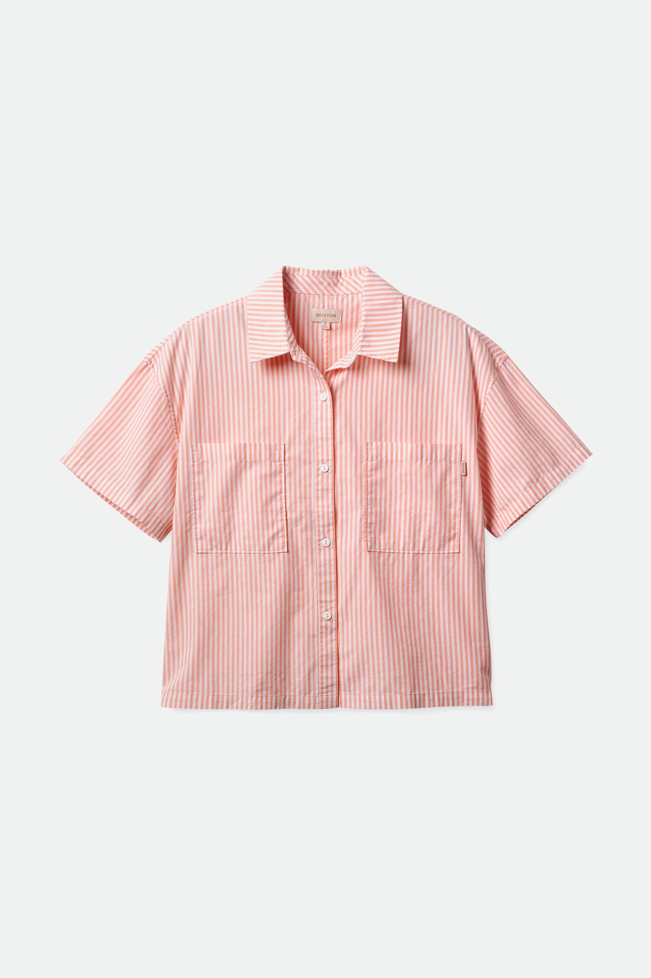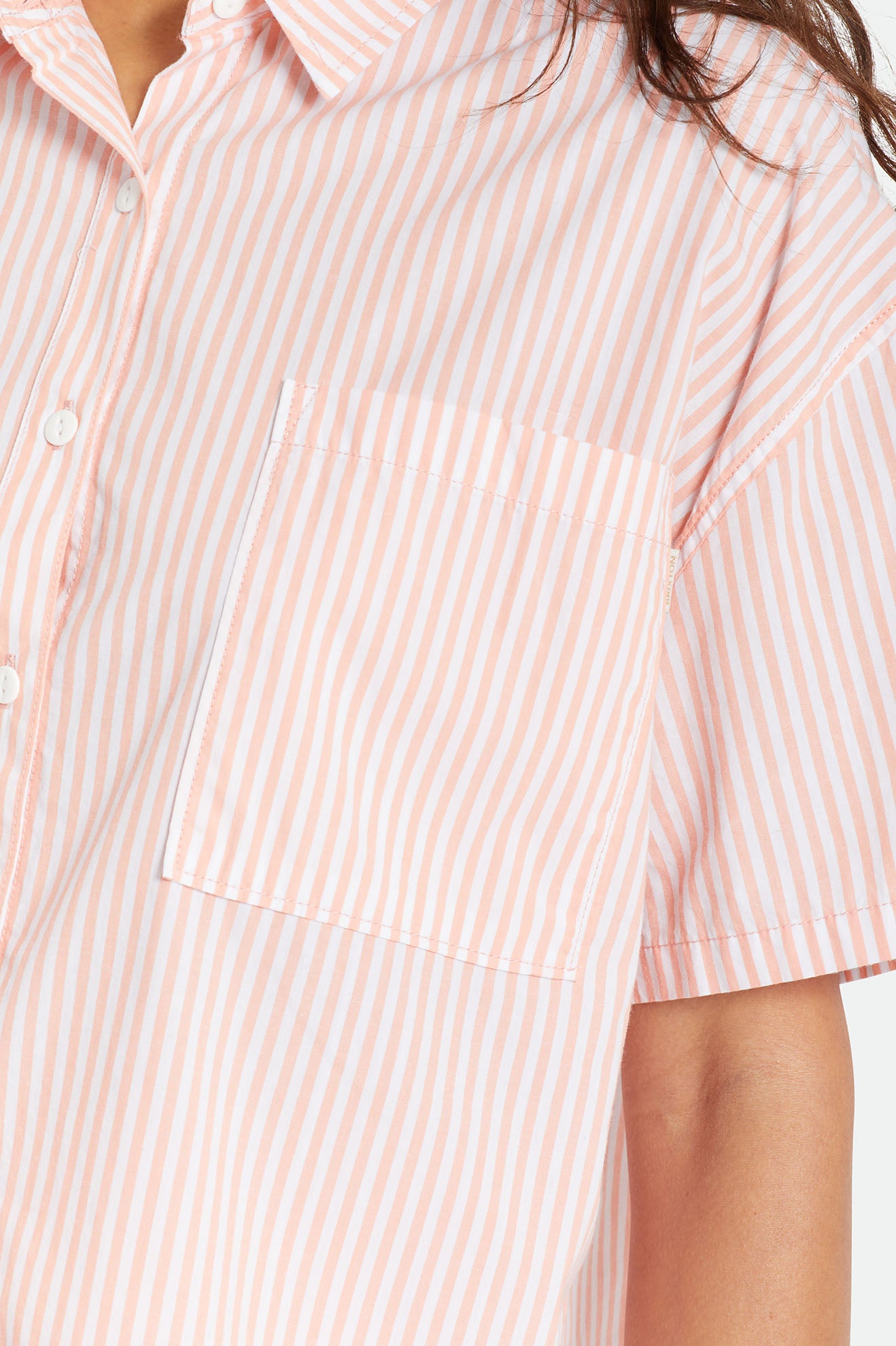 Landing at the top of the hip and crafted with organic cotton, the Sidney S/S is a button-up built with breathability. It features an updated pinstripe pattern and casual drop shoulders. Finished with chest patch pockets and a pocket logo flag label.