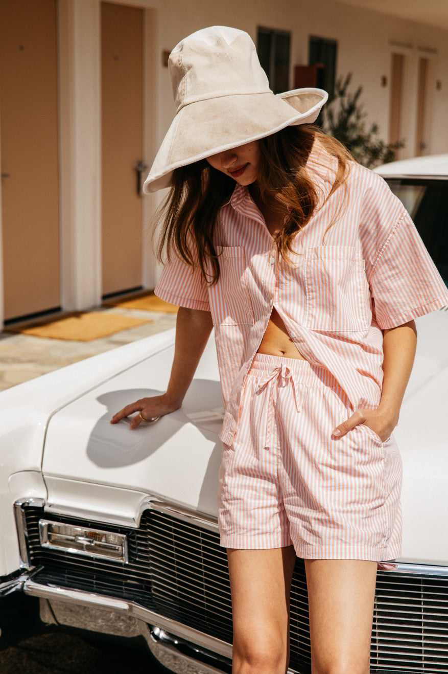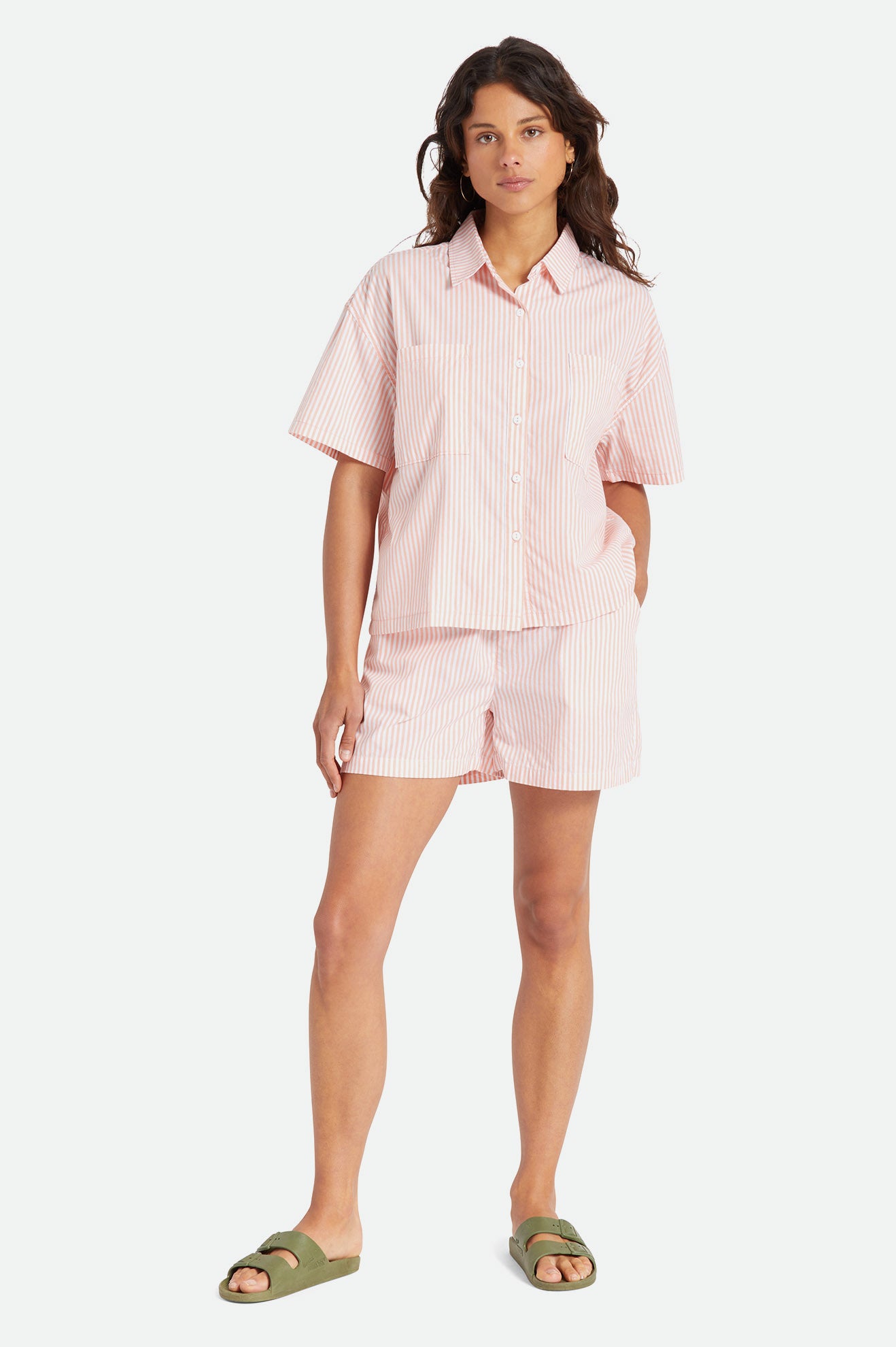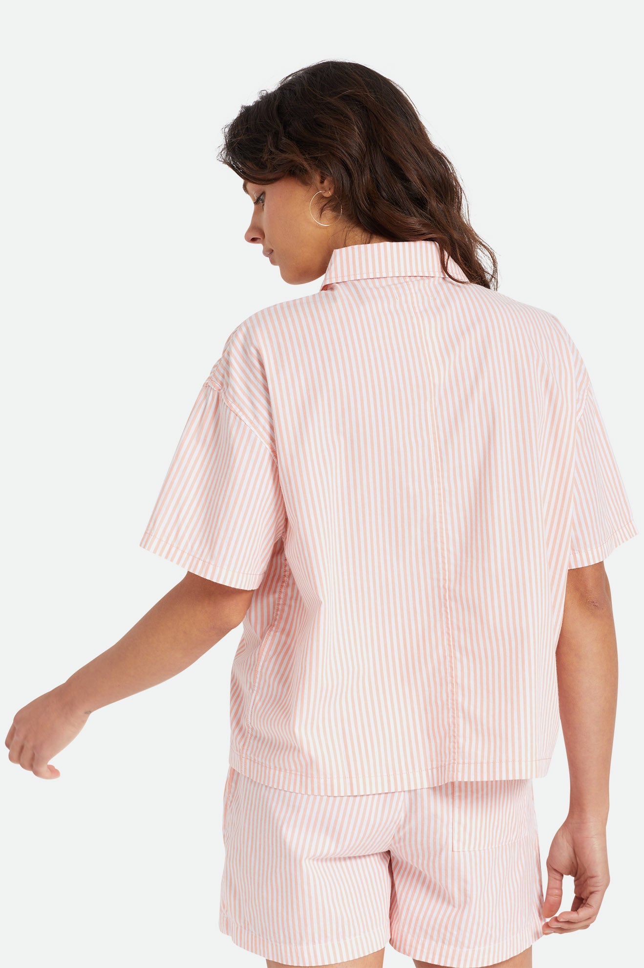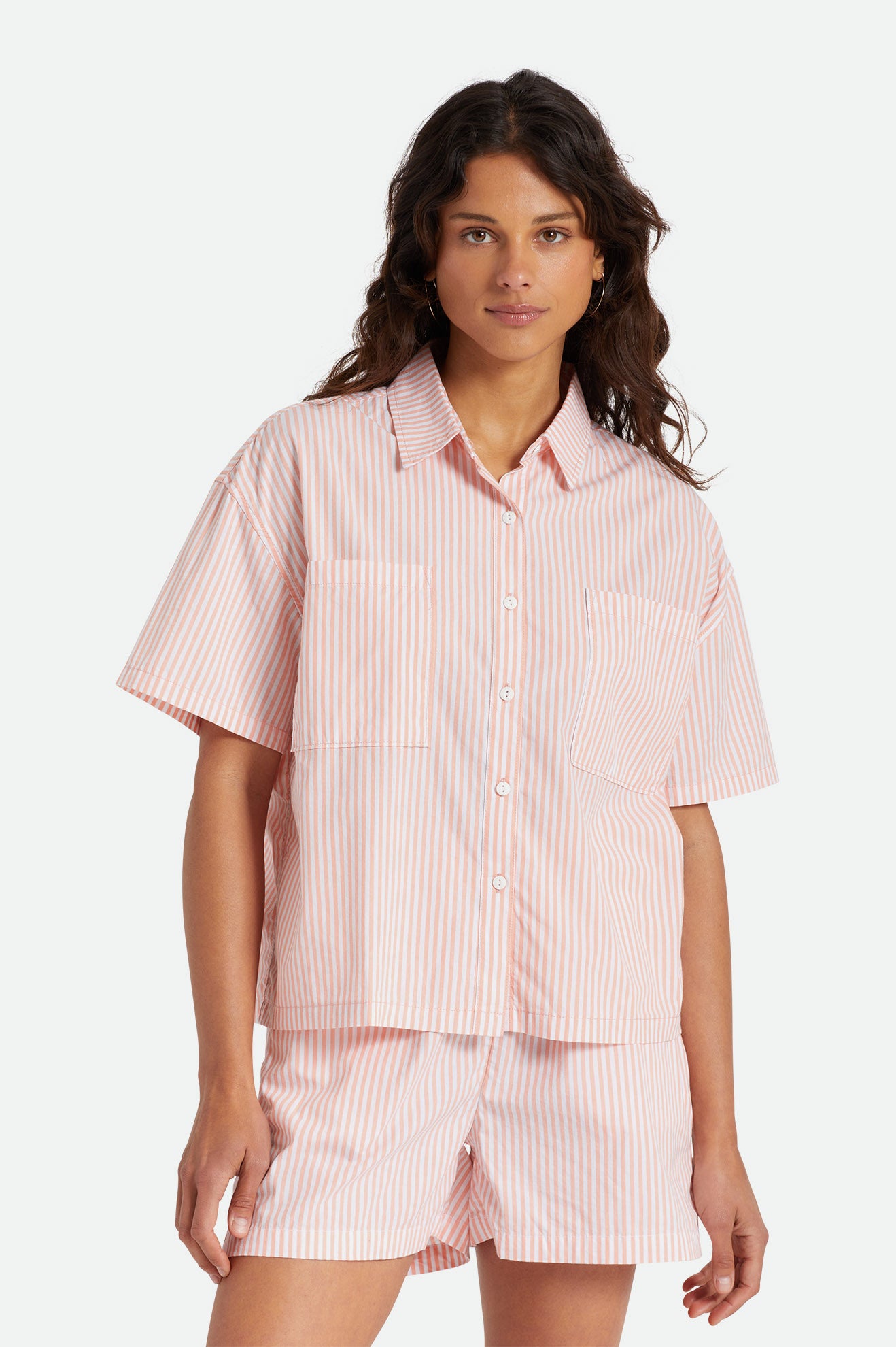Landing at the top of the hip and crafted with organic cotton, the Sidney S/S is a button-up built with breathability. It features an updated pinstripe pattern and casual drop shoulders. Finished with chest patch pockets and a pocket logo flag label.