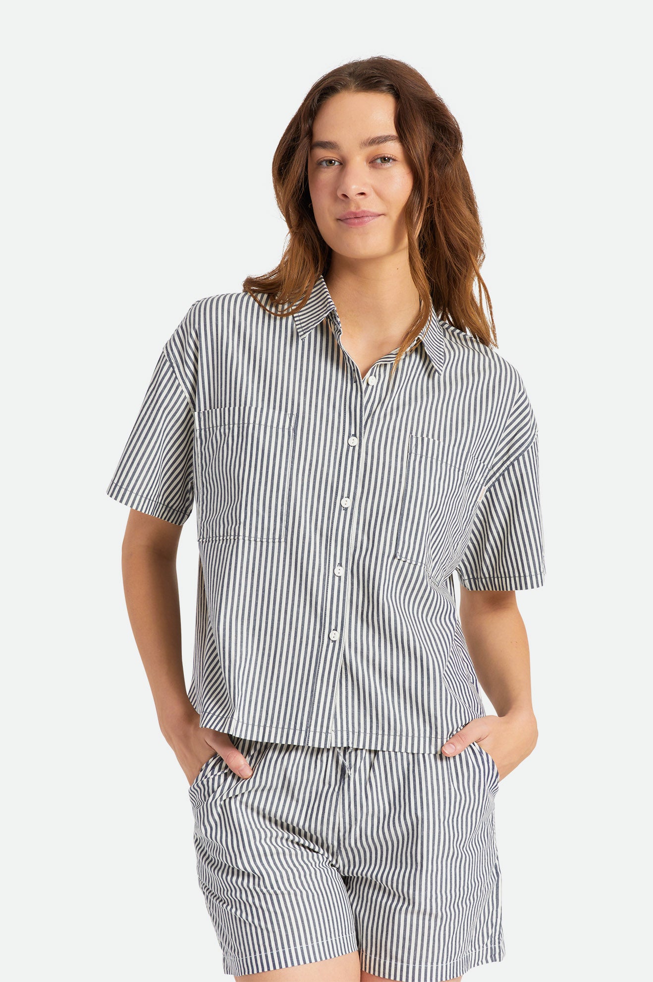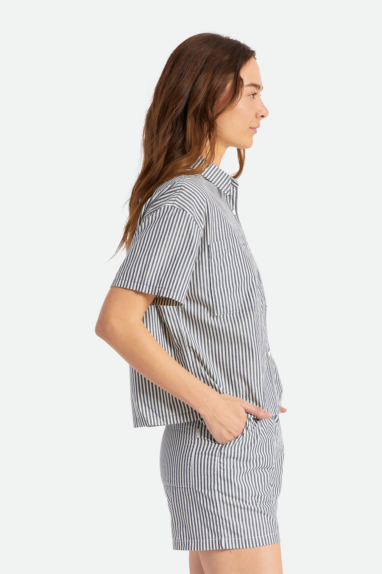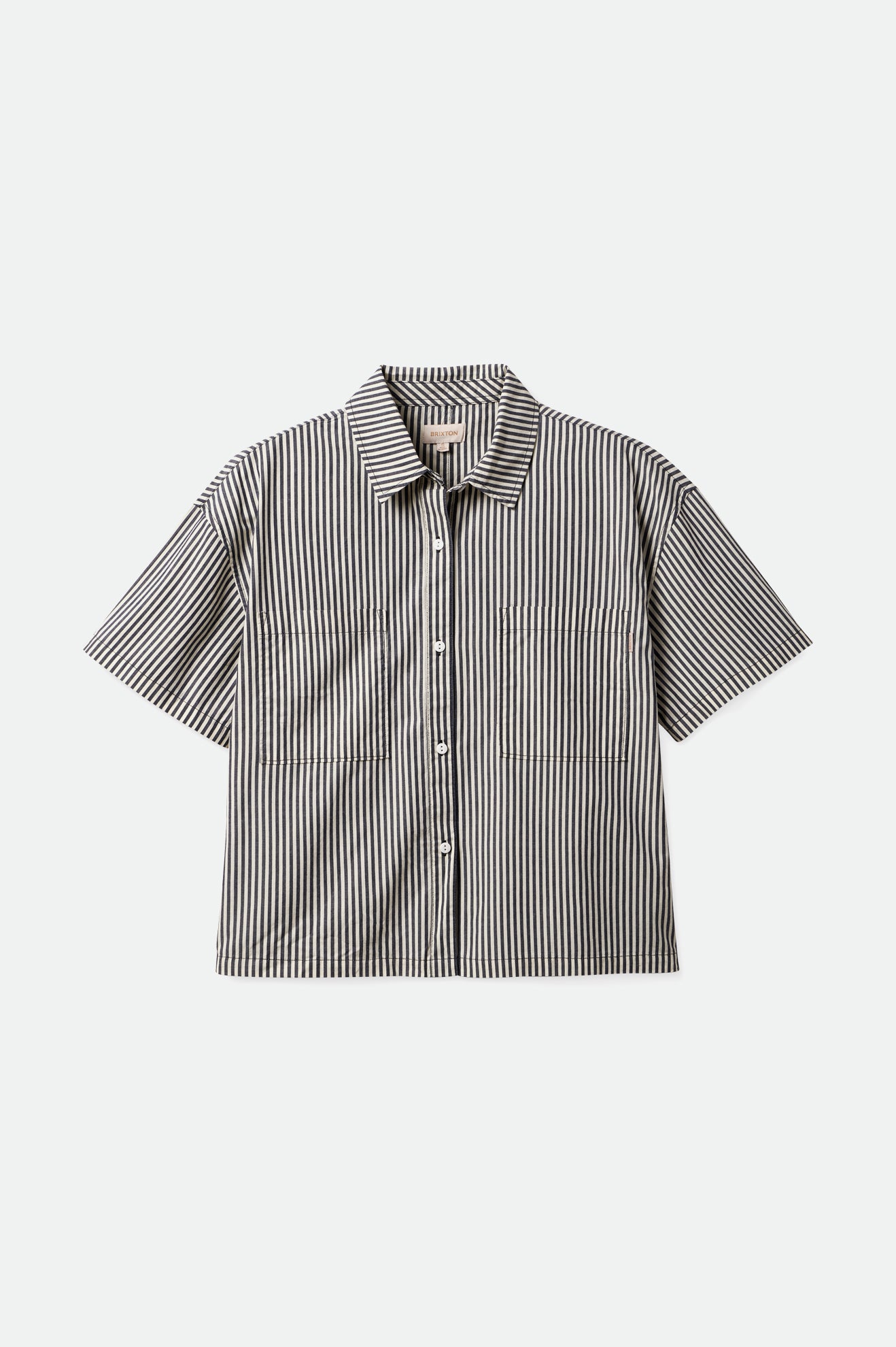 Landing at the top of the hip and crafted with organic cotton, the Sidney S/S is a button-up built with breathability. It features an updated pinstripe pattern and casual drop shoulders. Finished with chest patch pockets and a pocket logo flag label.