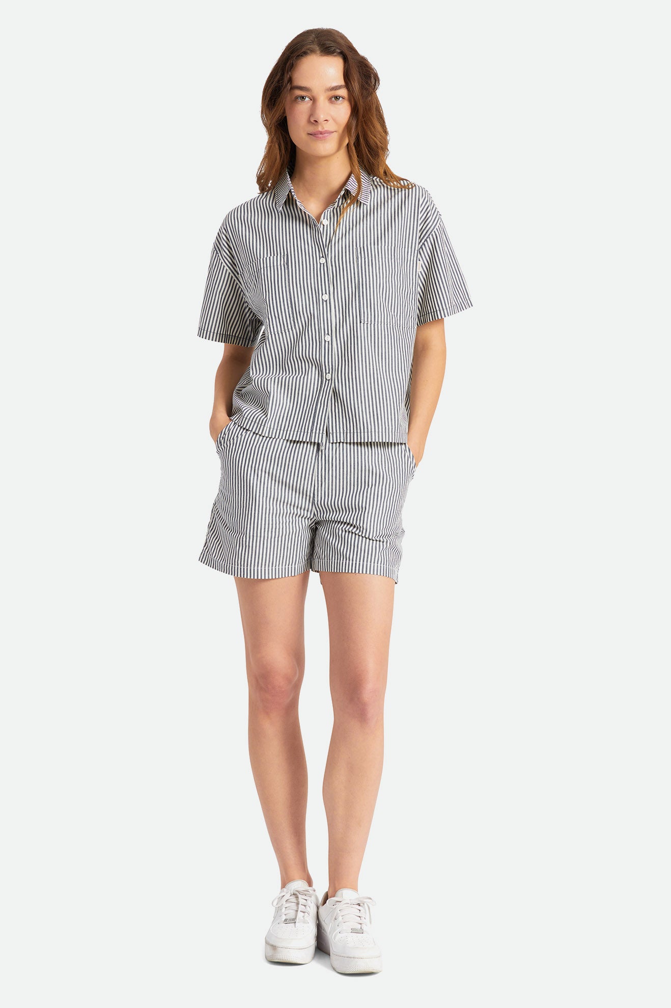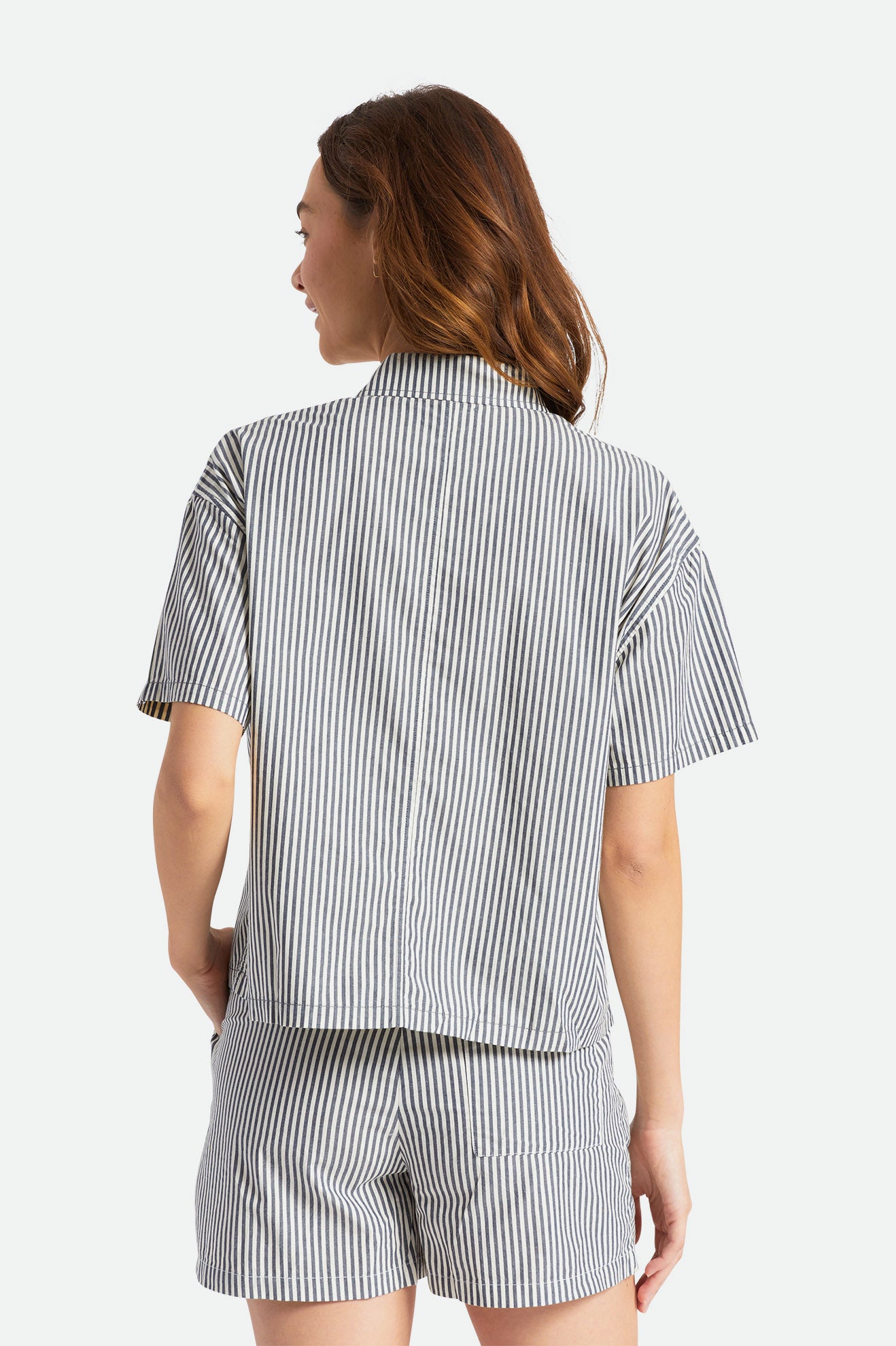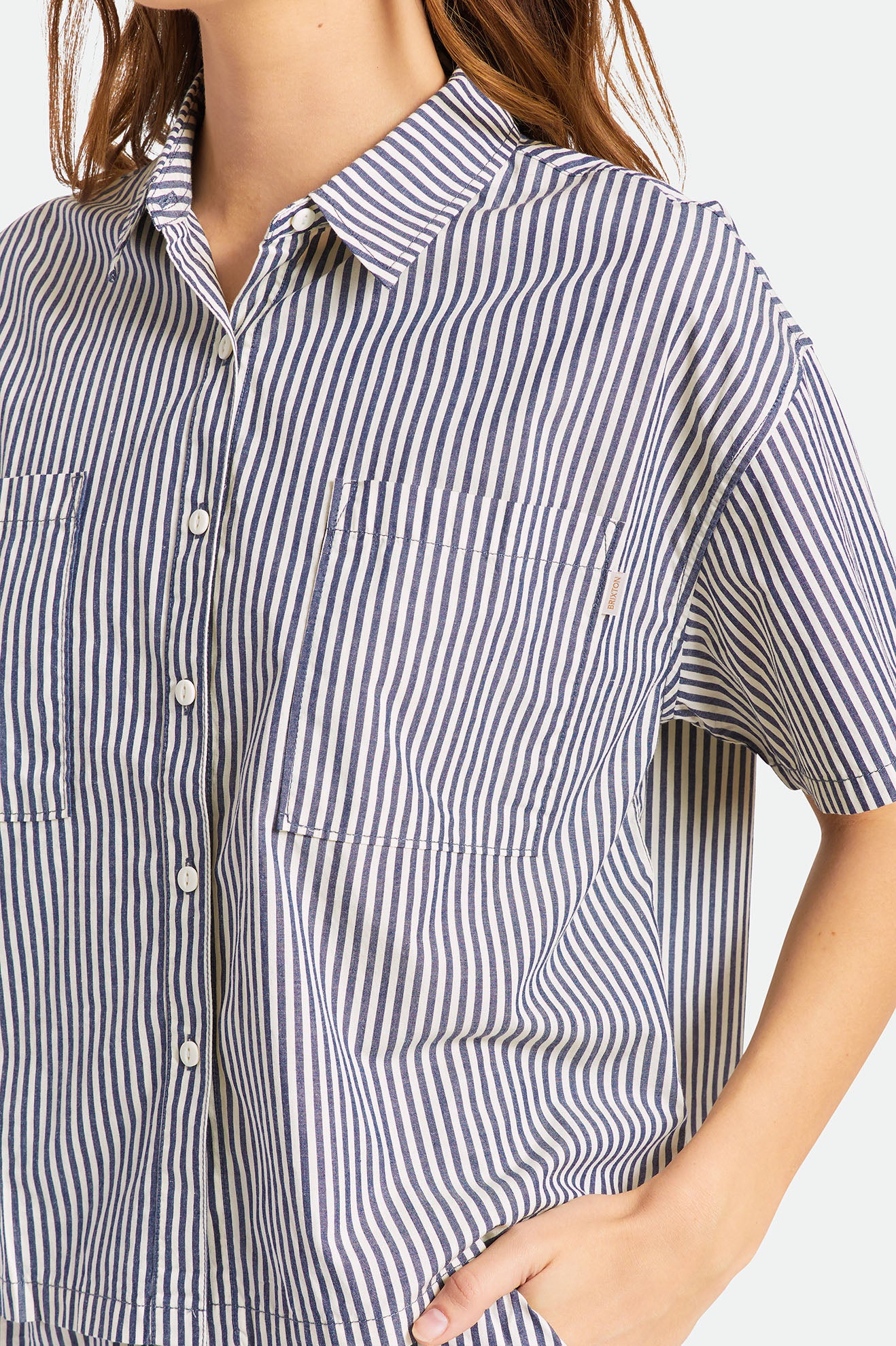 Landing at the top of the hip and crafted with organic cotton, the Sidney S/S is a button-up built with breathability. It features an updated pinstripe pattern and casual drop shoulders. Finished with chest patch pockets and a pocket logo flag label.