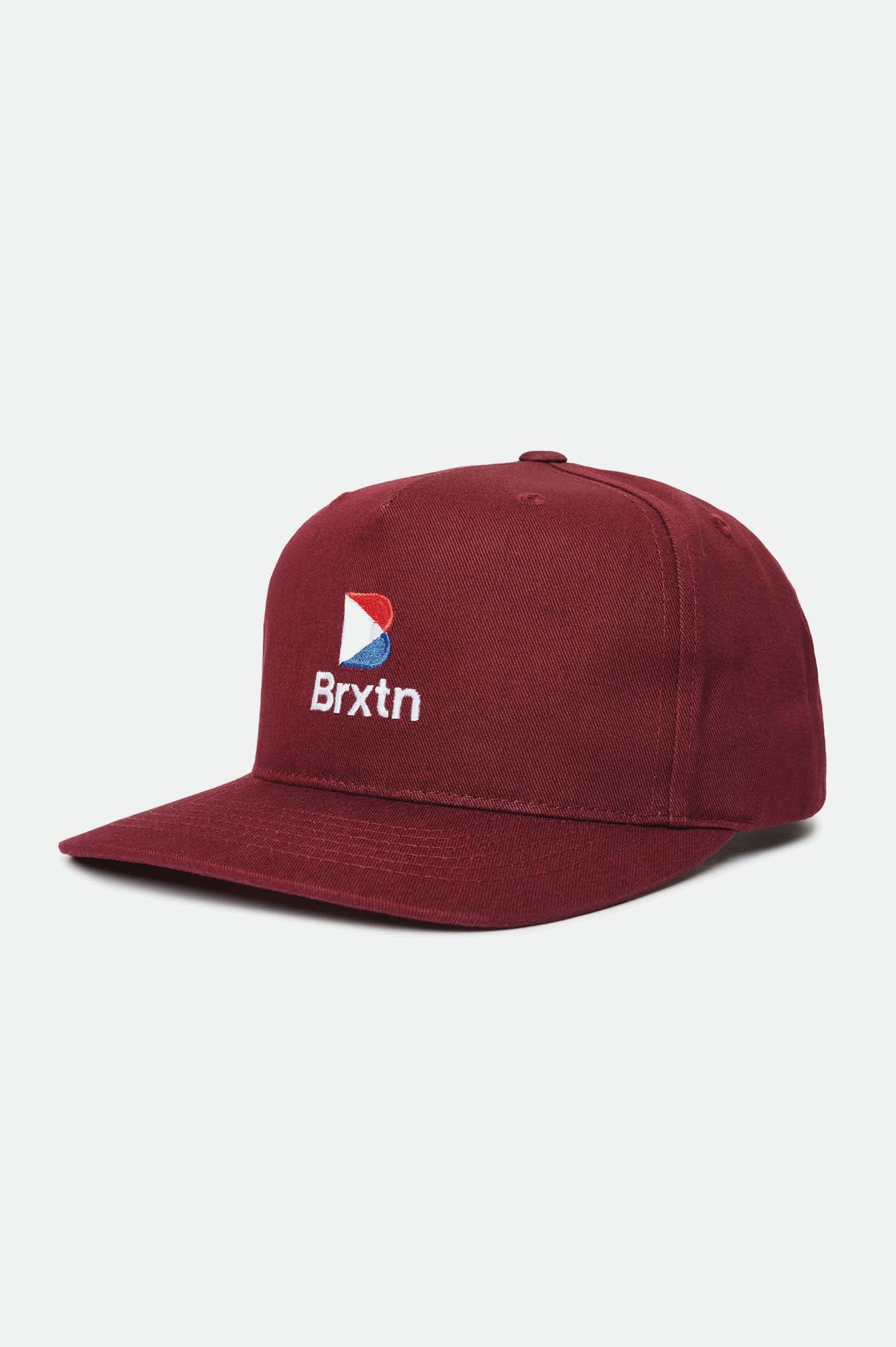 The men's unisex, Stowell II MP, is a five-panel 110C cut-and-sew cotton twill snapback hat featuring a direct embroidery on front and back and a plastic snap. Color: Maroon.