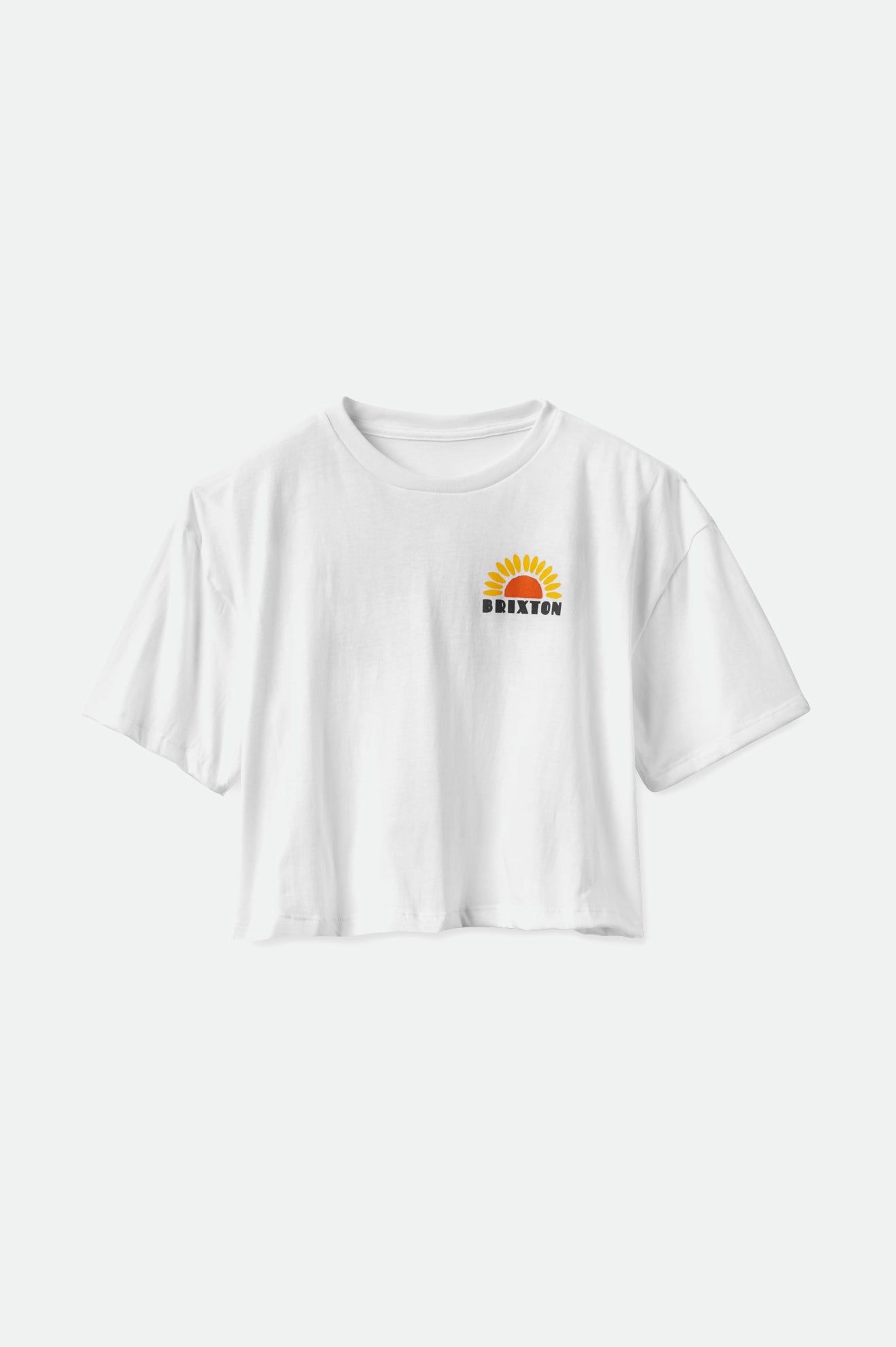 The Sunshine Skimmer Tee is designed with a boxy fit for casual summer style. It's crafted with a cotton / recycled poly jersey blend decorated with front and back screen prints. Drop shoulders and longer sleeves create an easy, relaxed shape.