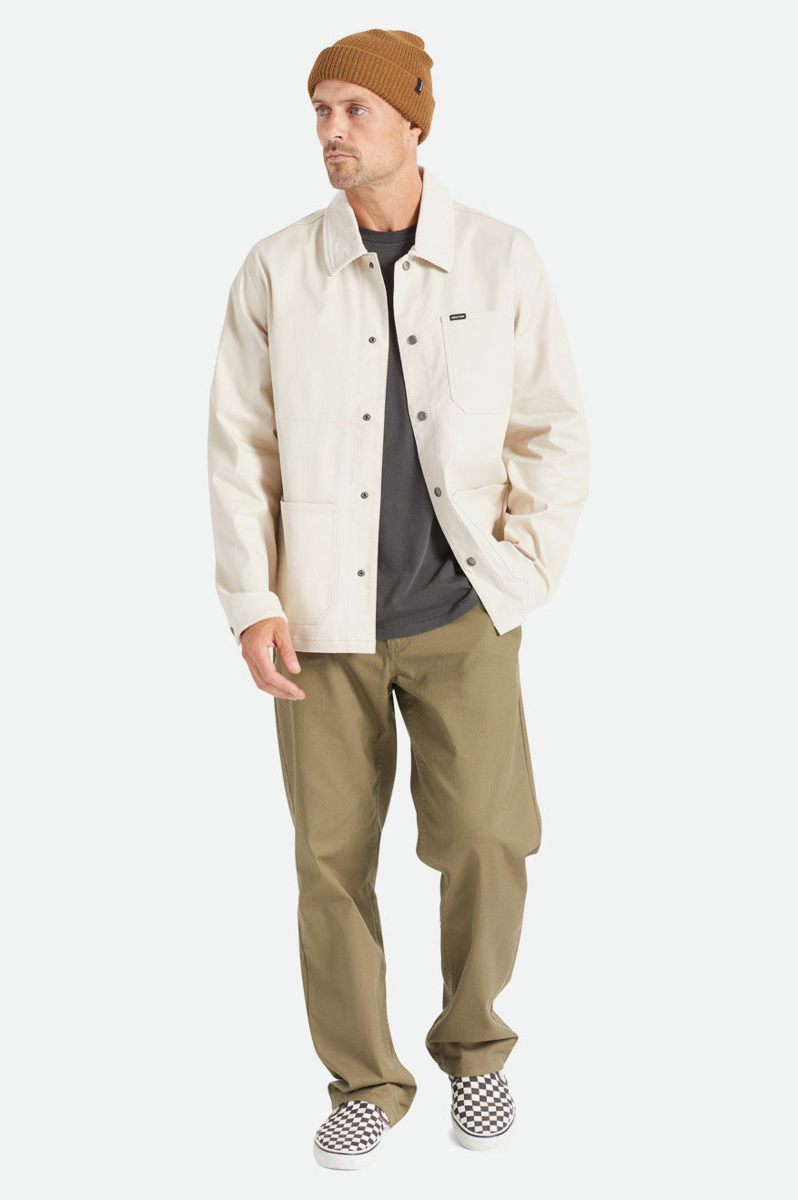The Survey X Chore Coat is a lasting outer layer with premium features. It’s made with a unique stretch twill fabric containing recycled polyester and contrasted with a durable corduroy collar. We've treated it with a DWR coating for added water repellency while utility pockets add storage. Finished with metal snaps and interior pockets.