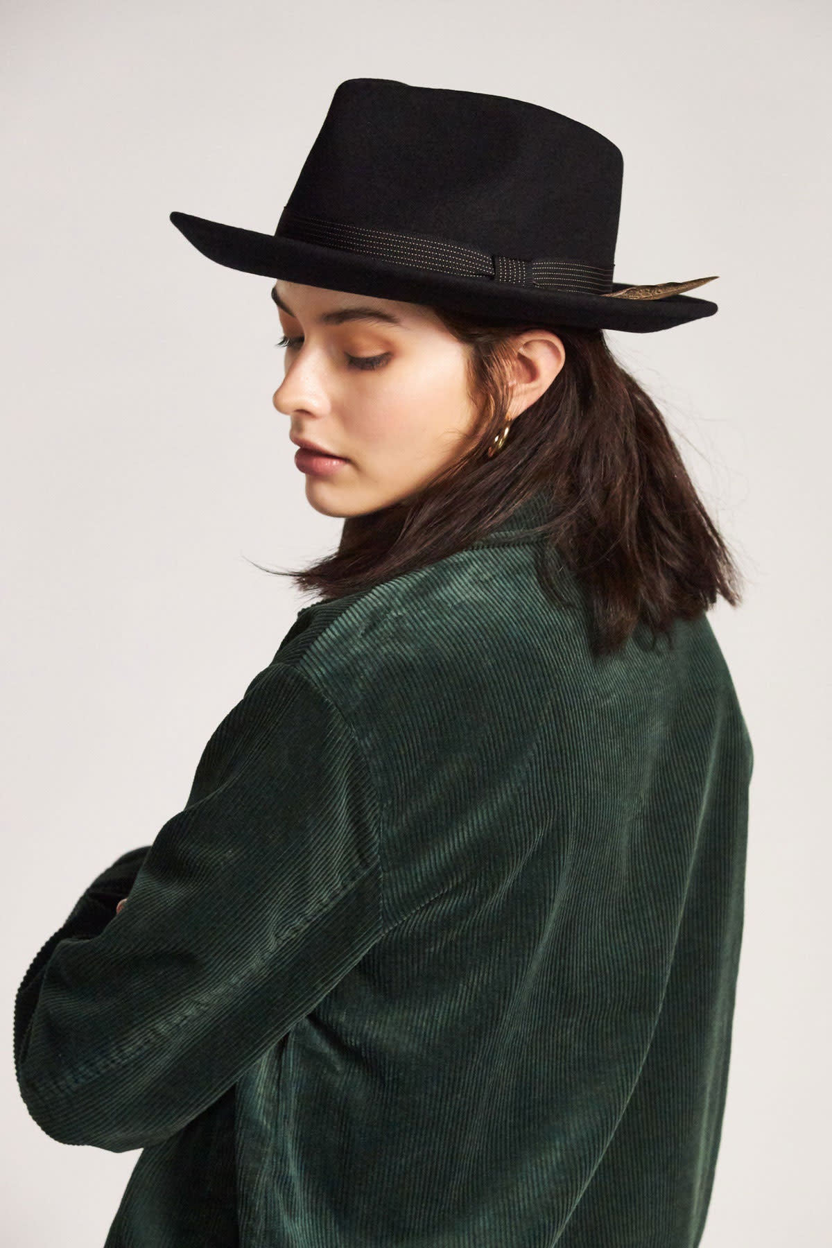 The men's unisex, Swindle II is a wide-brim felt fedora hat featuring a custom striped grosgrain band and a feather. Color: Black.