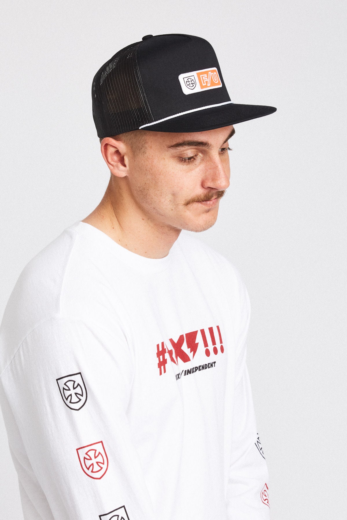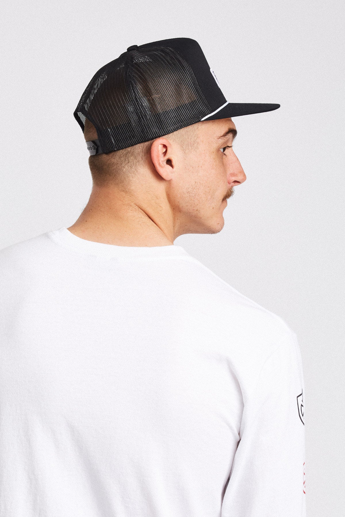 A five-panel cut-and-sew CVC twill mesh cap featuring a polyester rope, a merrowed edge embroidered patch, and a plastic snap adjuster.