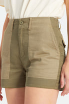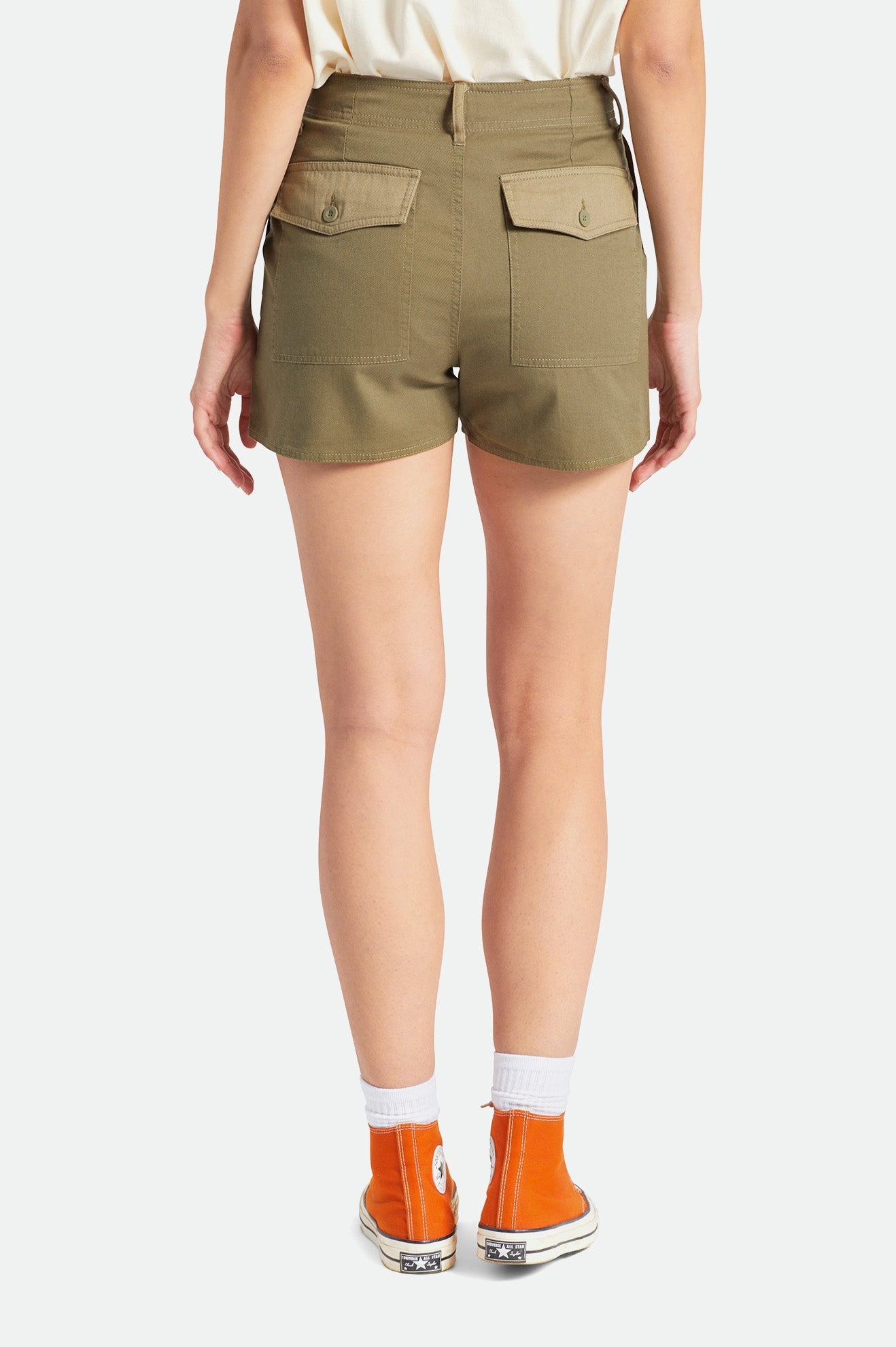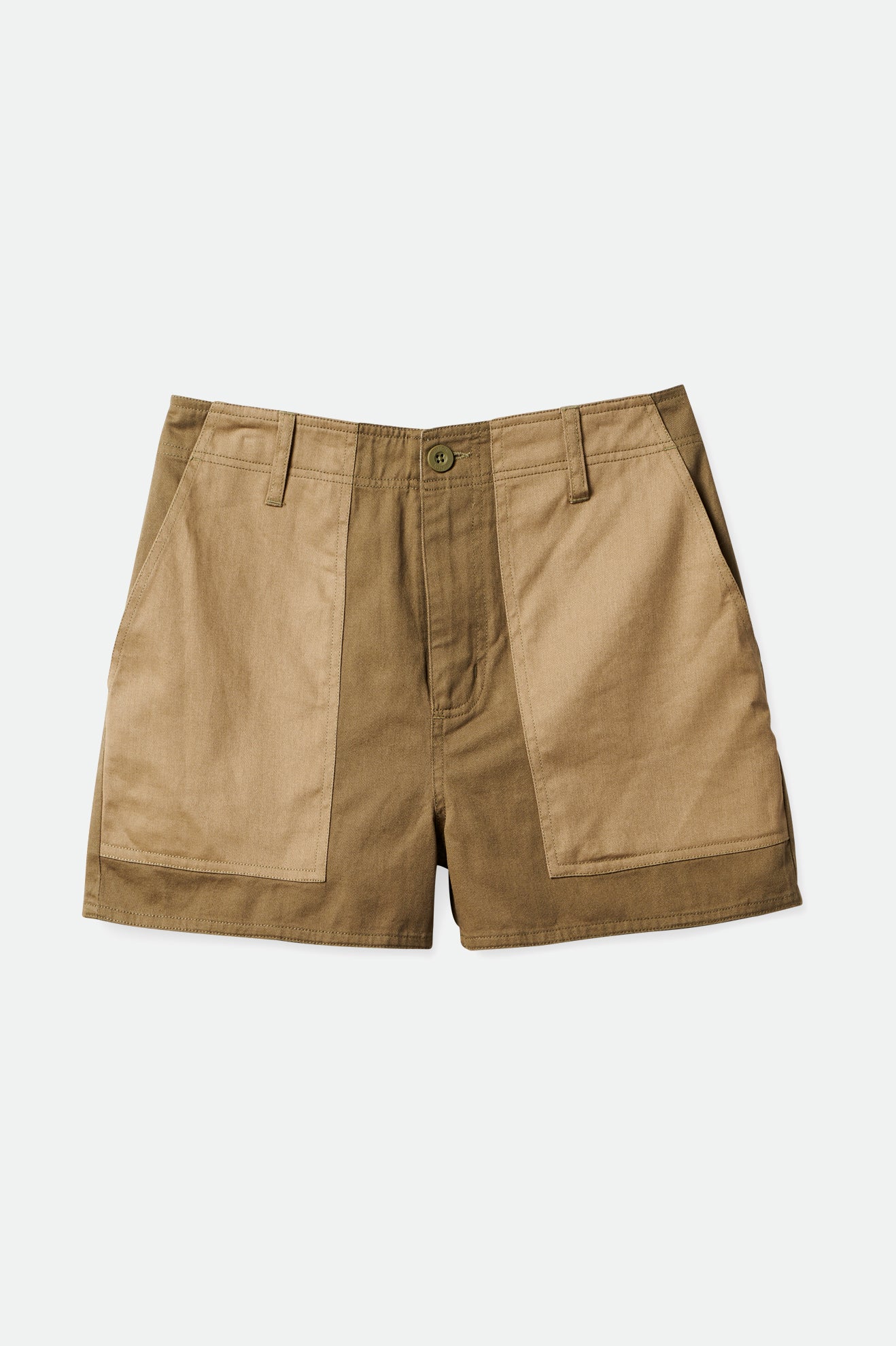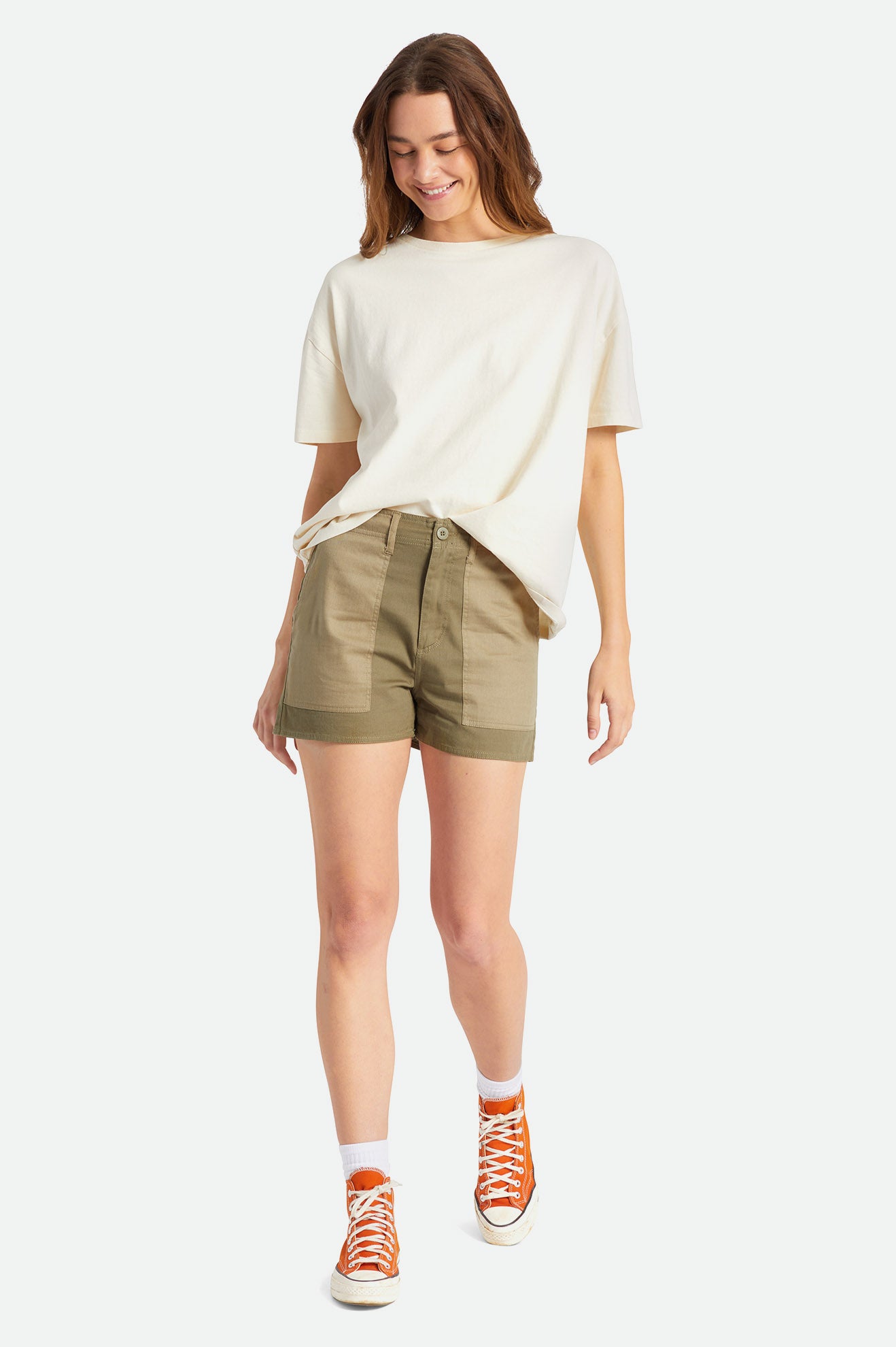 These are a high-waisted utility short with a straight leg. They’re designed with patch pockets and a seamless waistband that channels Hollywood vibes. Each colorway features a different fabric for individual style.