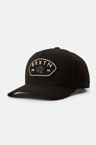 The Brixton Men/Unisex Waylon MP Snapback is a five-panel cotton twill cut-and-sew snapback hat featuring a merrowed-edge embroidered patch and a plastic snap. Color: Black.