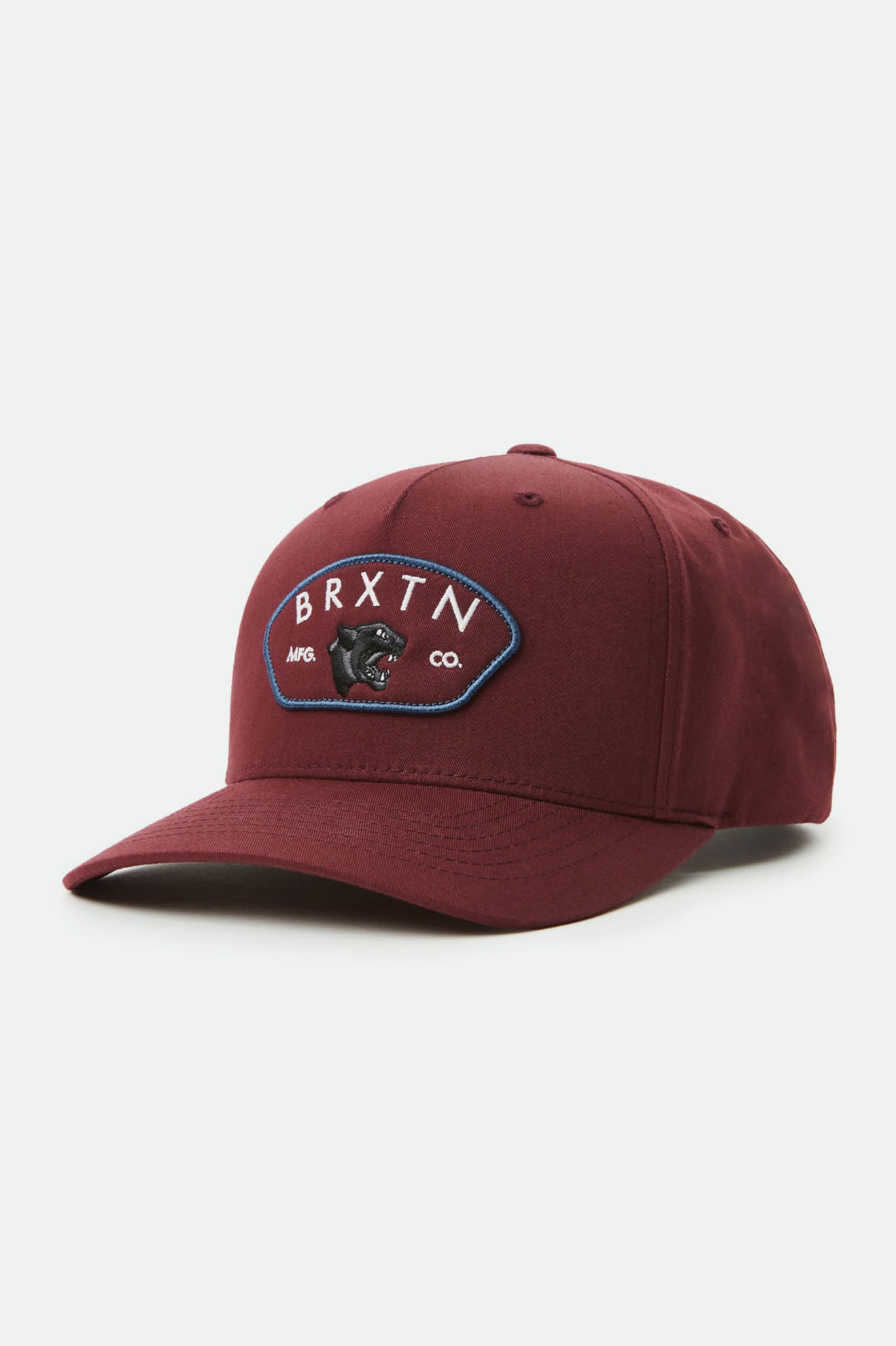 The Brixton Men/Unisex Waylon MP Snapback is a five-panel cotton twill cut-and-sew snapback hat featuring a merrowed-edge embroidered patch and a plastic snap. Color: Maroon.