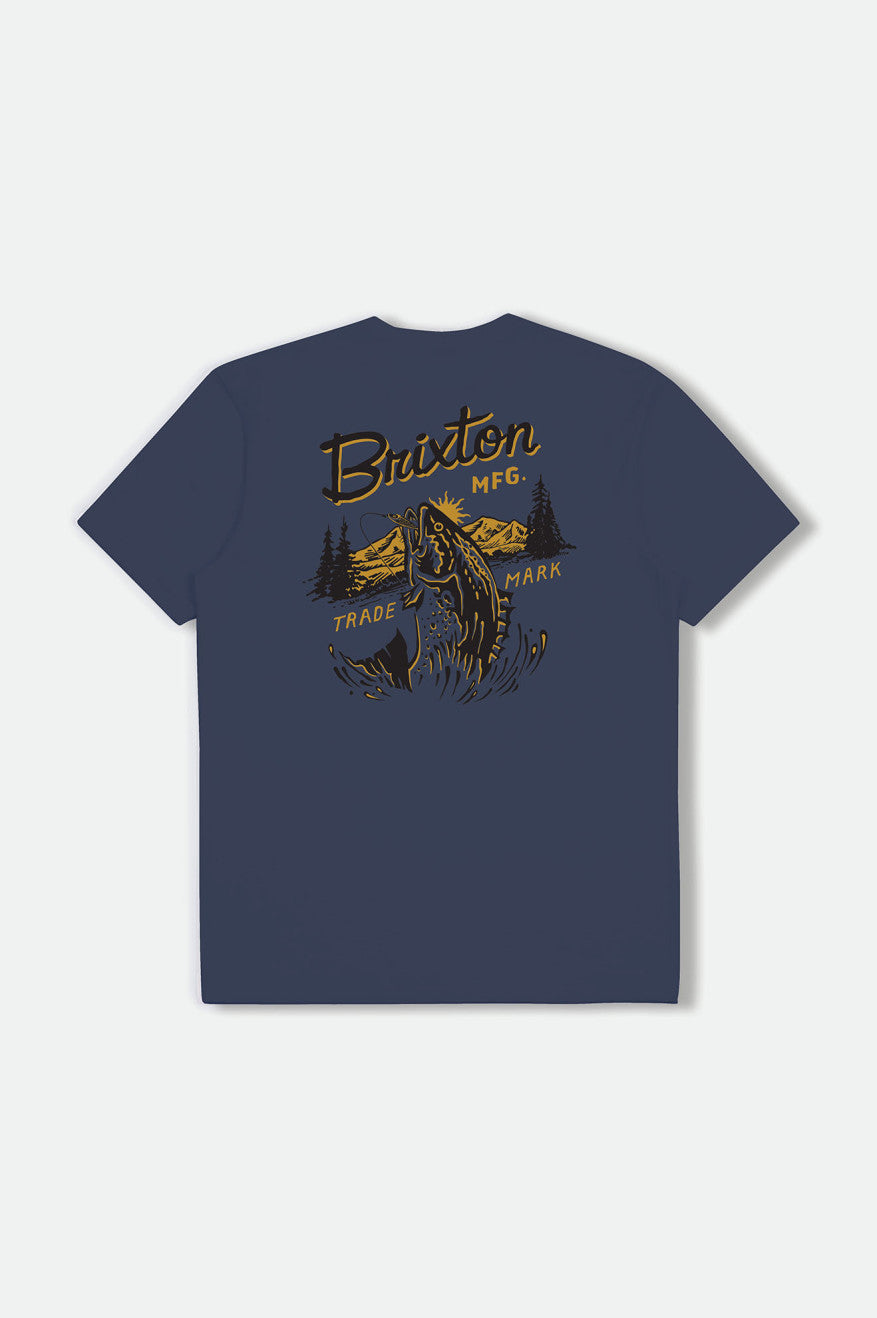This is a staple tee with a standard fit. Made from soft, breathable cotton, it has front and back graphics inspired by retro fishing companies.